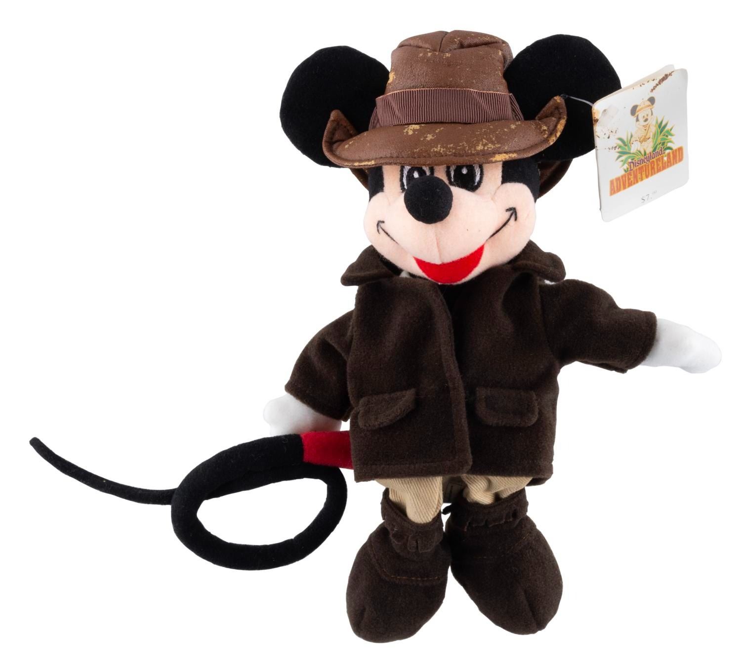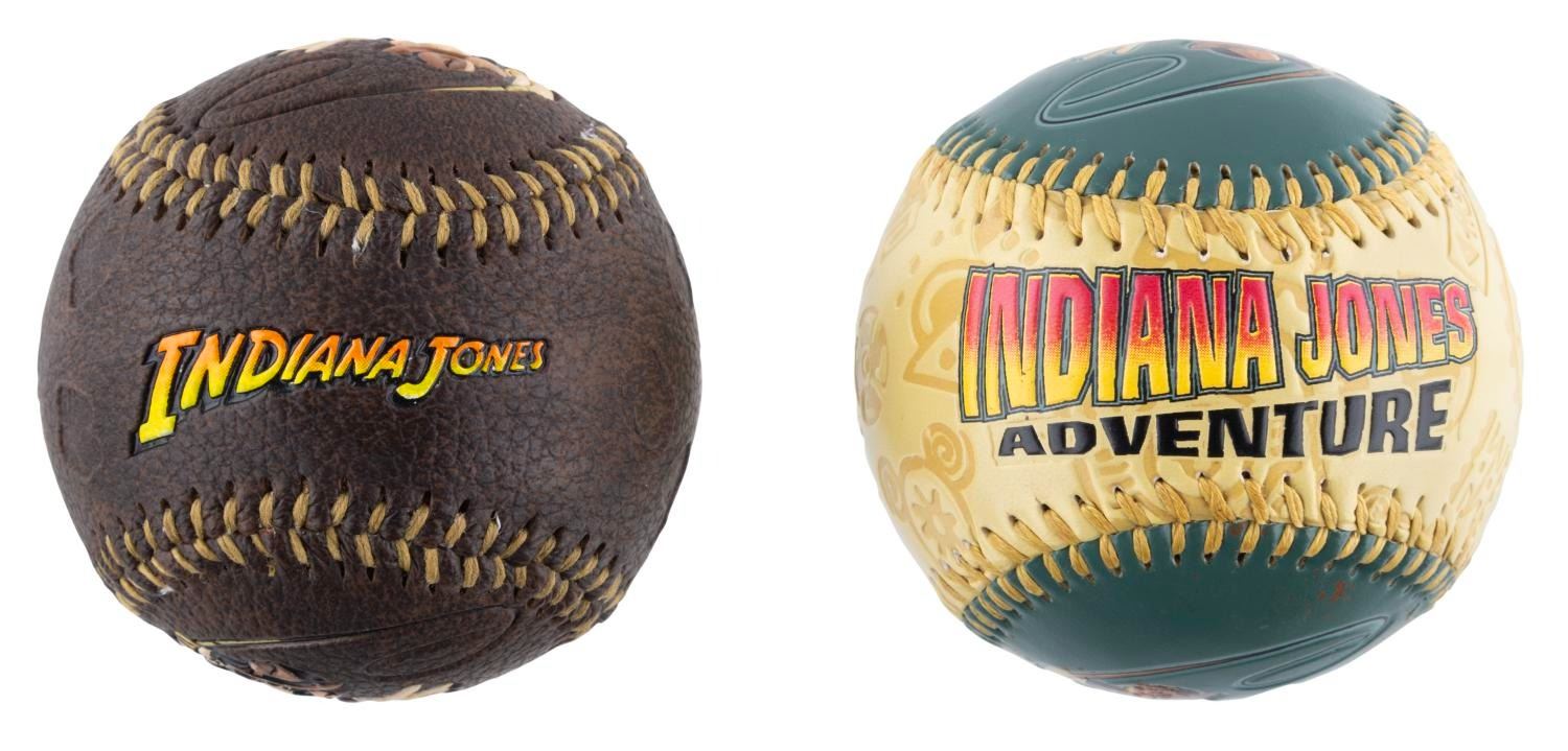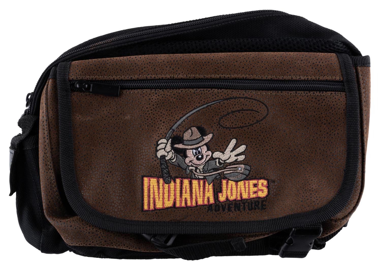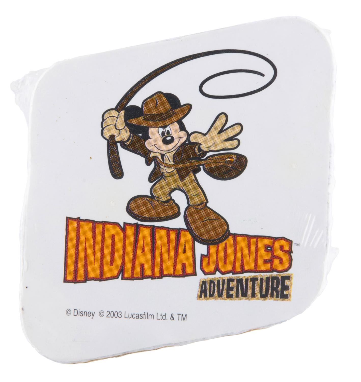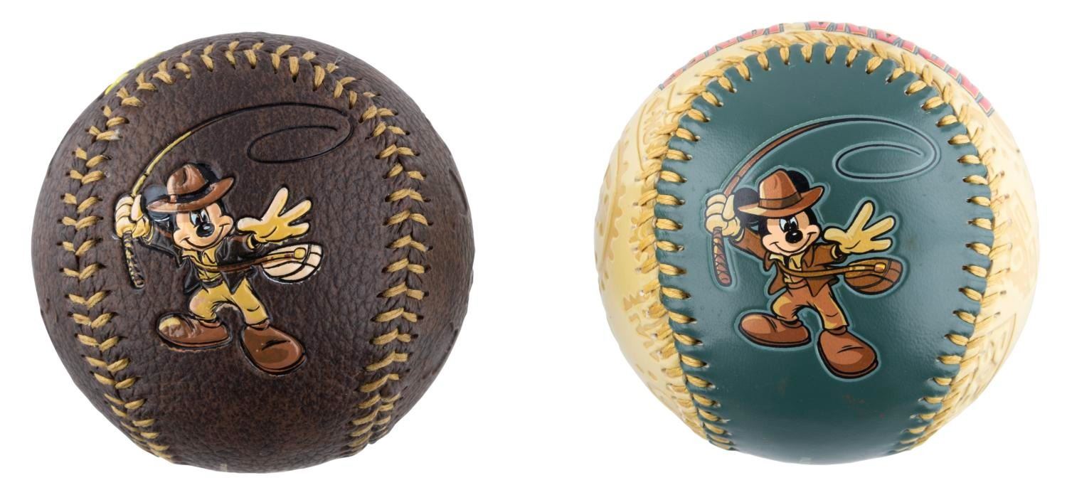 (Disneyland, 2003-2008) A collection of nine souvenirs featuring Mickey Mouse as Indiana Jones. Included are a bean bag toy, two baseballs, an opened and unopened magic towel, a 2” x 3” photo frame, a satchel, a lanyard wallet, and a small snow globe. Ranging in size from the 2” x 2” x 1” tall unopened magic towel to the 8.25” x 12” satchel, the lot is in good to very good condition with light scratches, stains, wear, and heavy peeling to the bean bag Mickey’s hat.