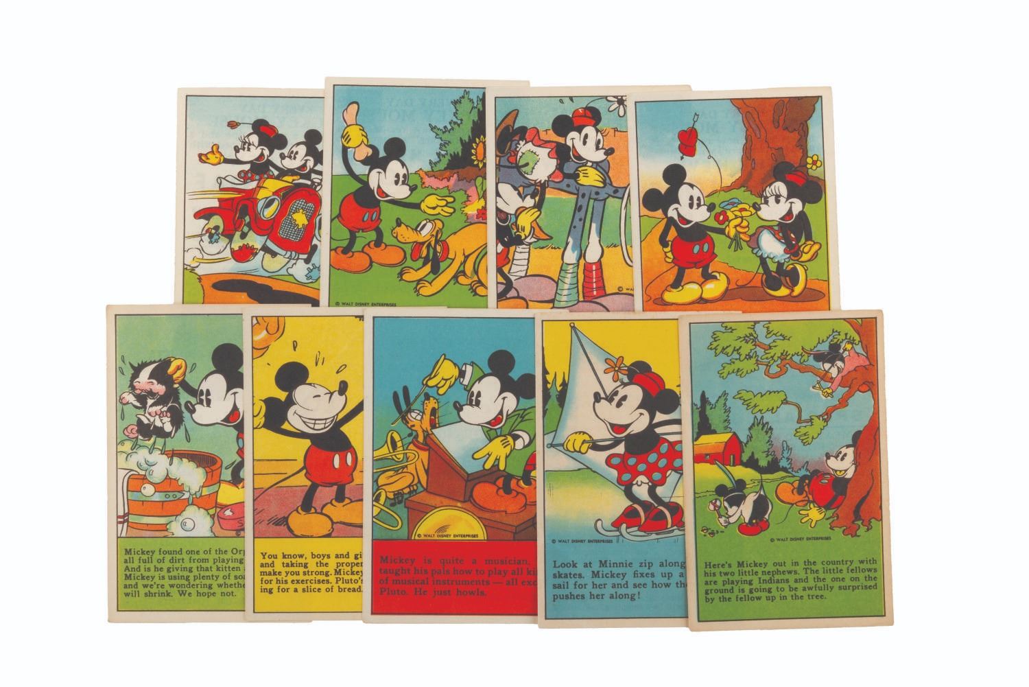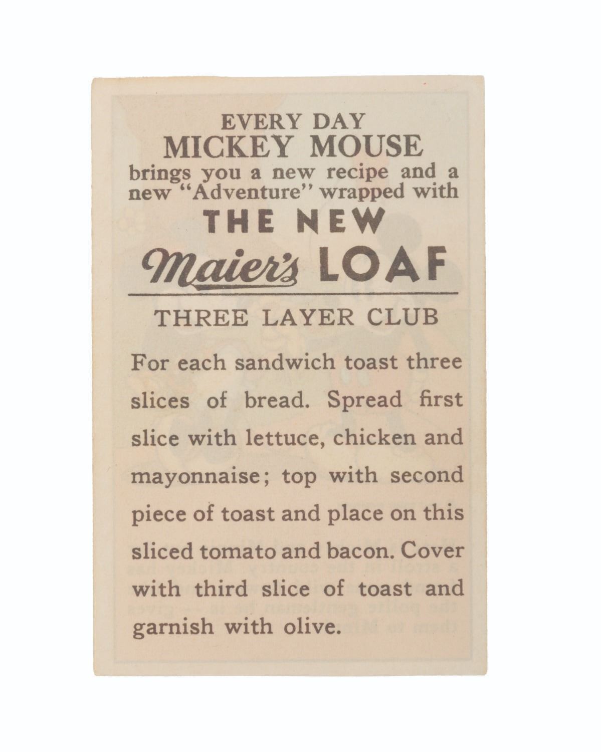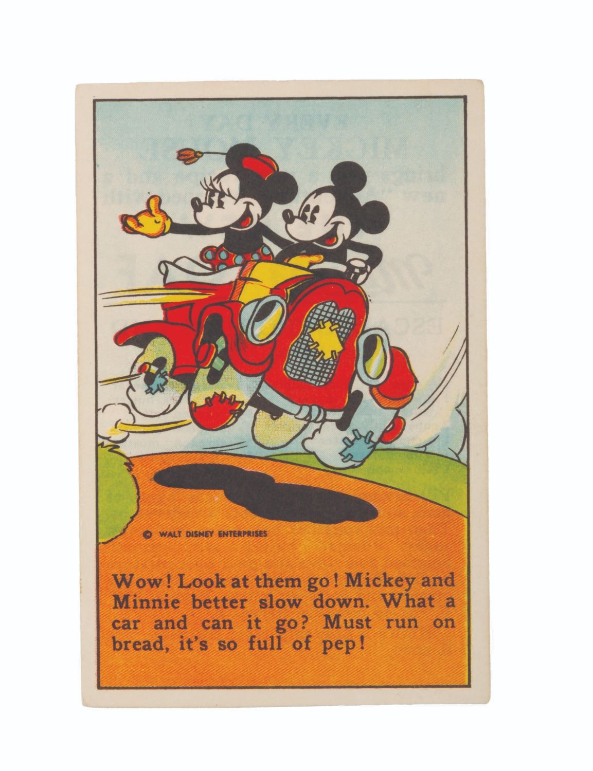 (Hardin’s, Freihofer’s, Travis, 1930s) A collection of nine Mickey and Friends bread and bakery cards. Distributed in loaves of bread, these cards feature advertisements from your local bakery, a Mickey Mouse and friends picture with a story, and a recipe printed on the back. Measuring 2.75" x 4.25", the cards are in good condition with light soiling and discoloration from age.