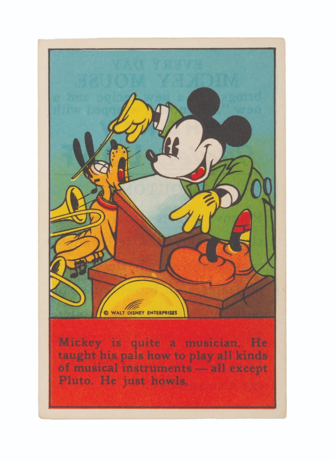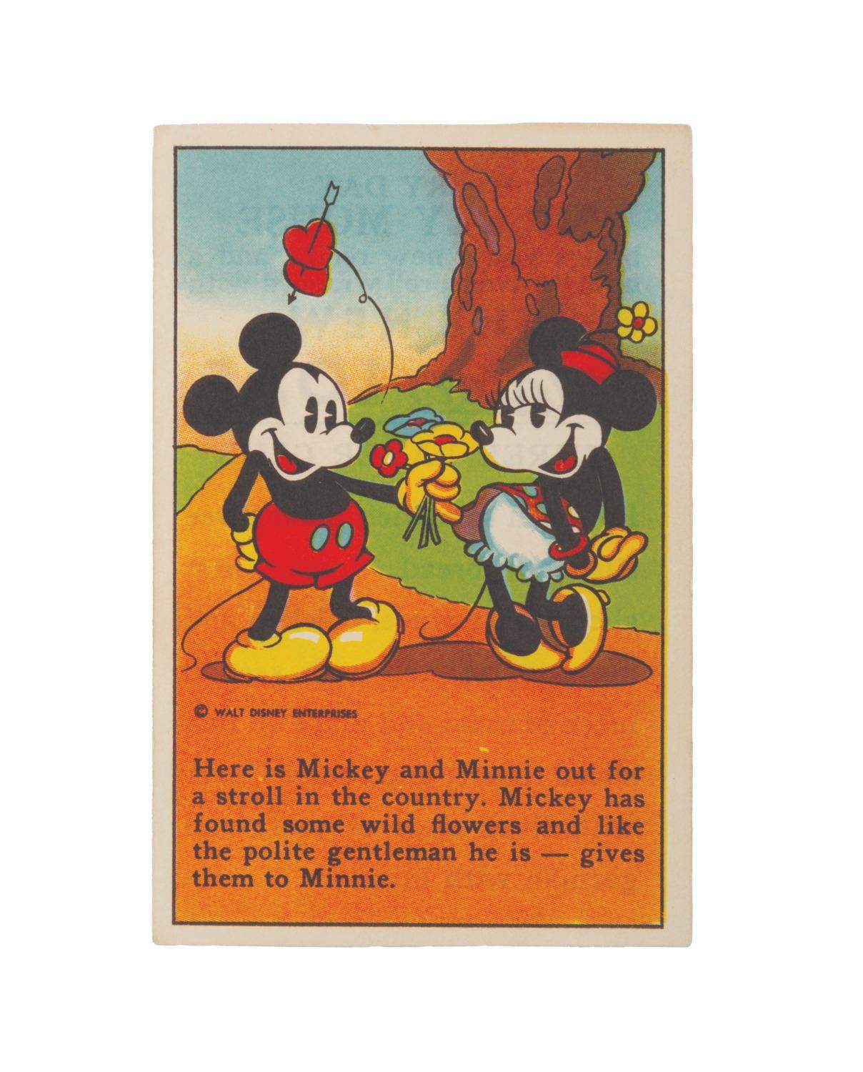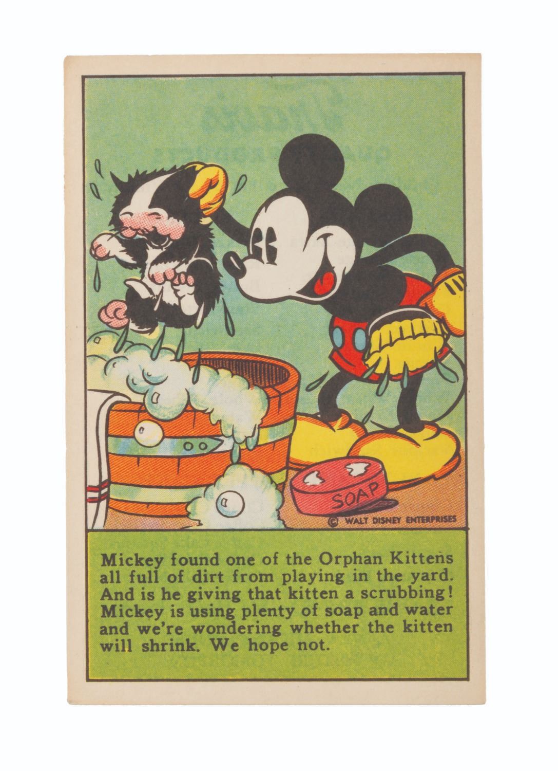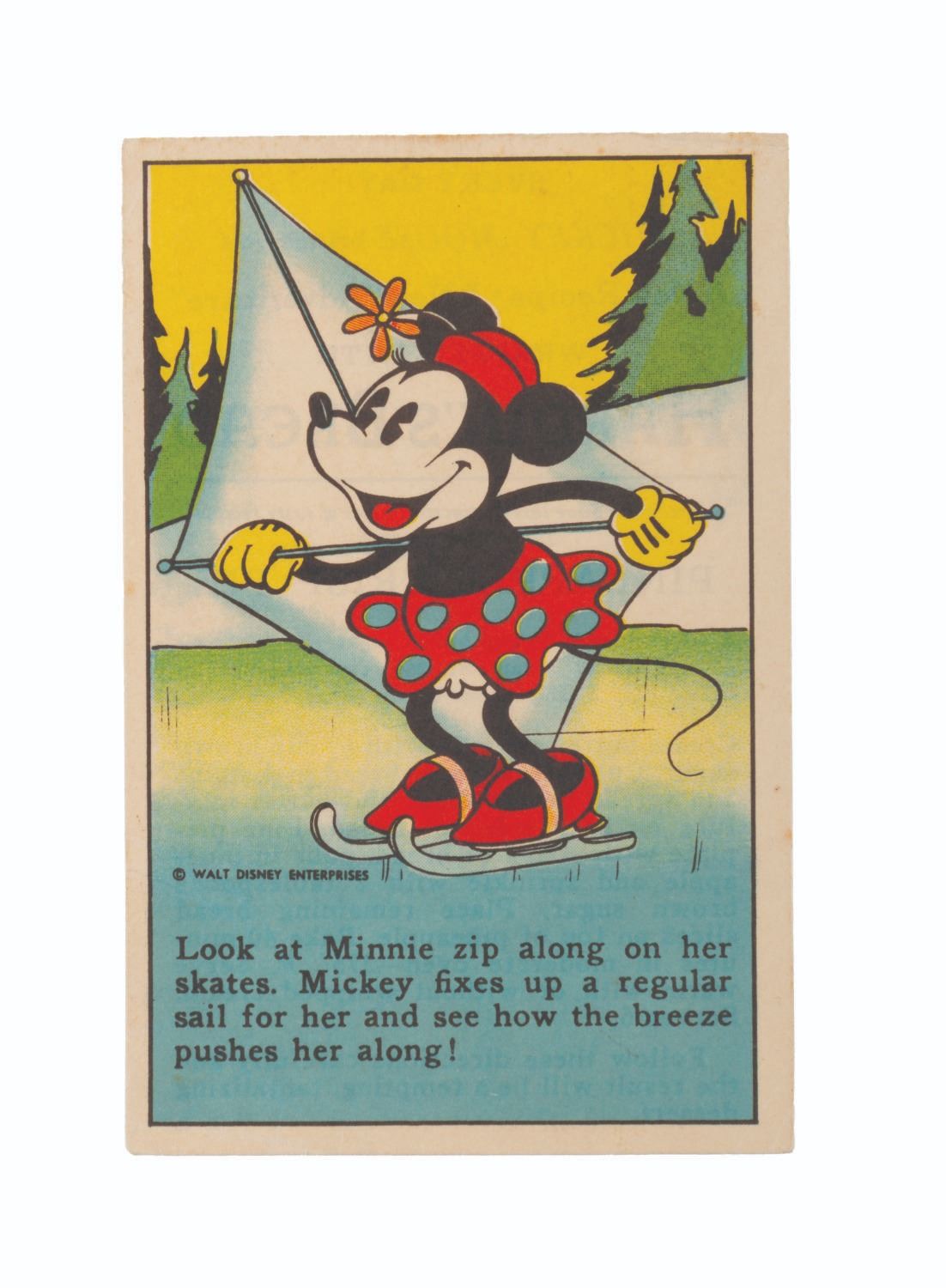 (Hardin’s, Freihofer’s, Travis, 1930s) A collection of nine Mickey and Friends bread and bakery cards. Distributed in loaves of bread, these cards feature advertisements from your local bakery, a Mickey Mouse and friends picture with a story, and a recipe printed on the back. Measuring 2.75" x 4.25", the cards are in good condition with light soiling and discoloration from age.