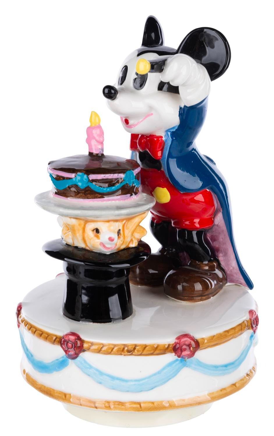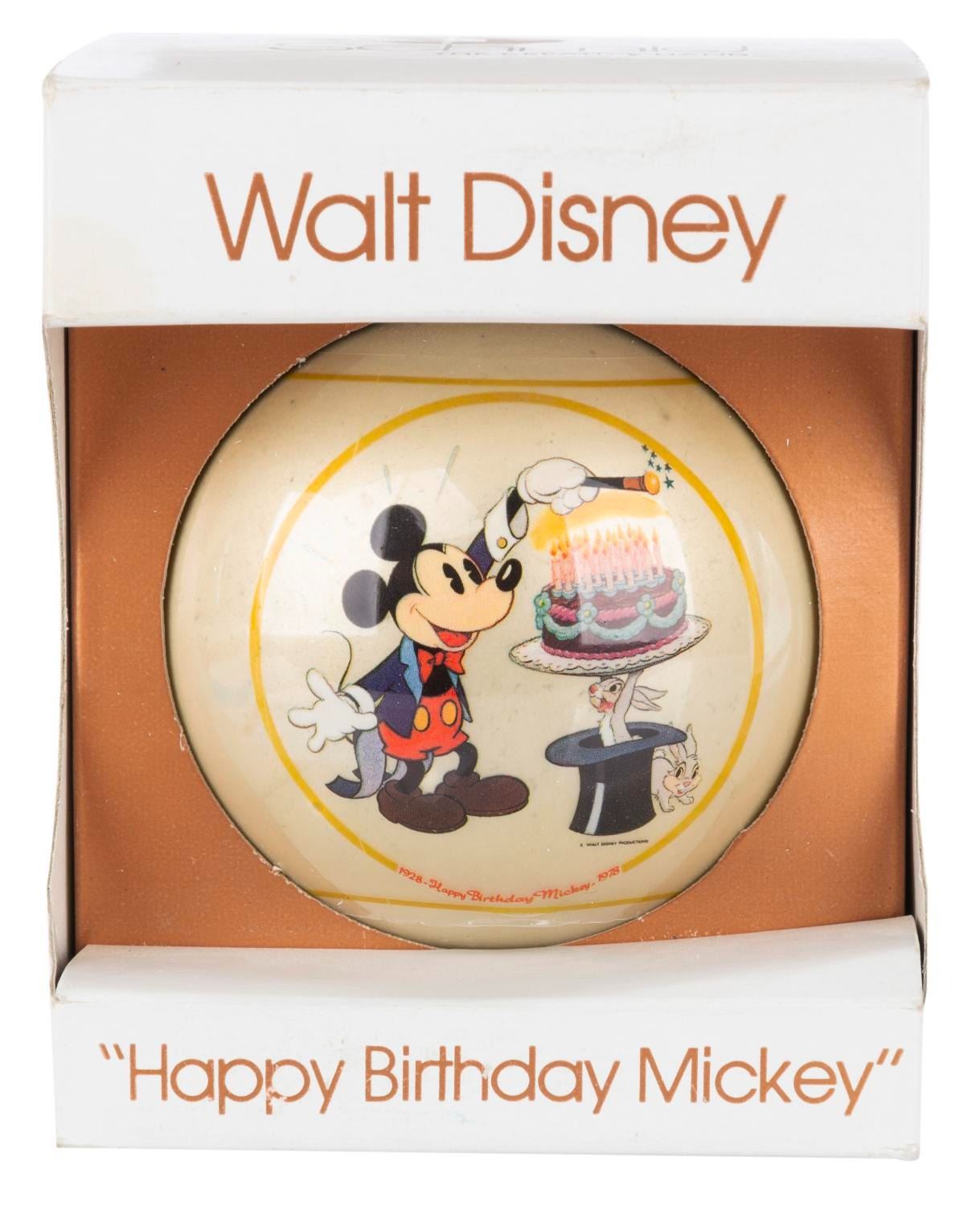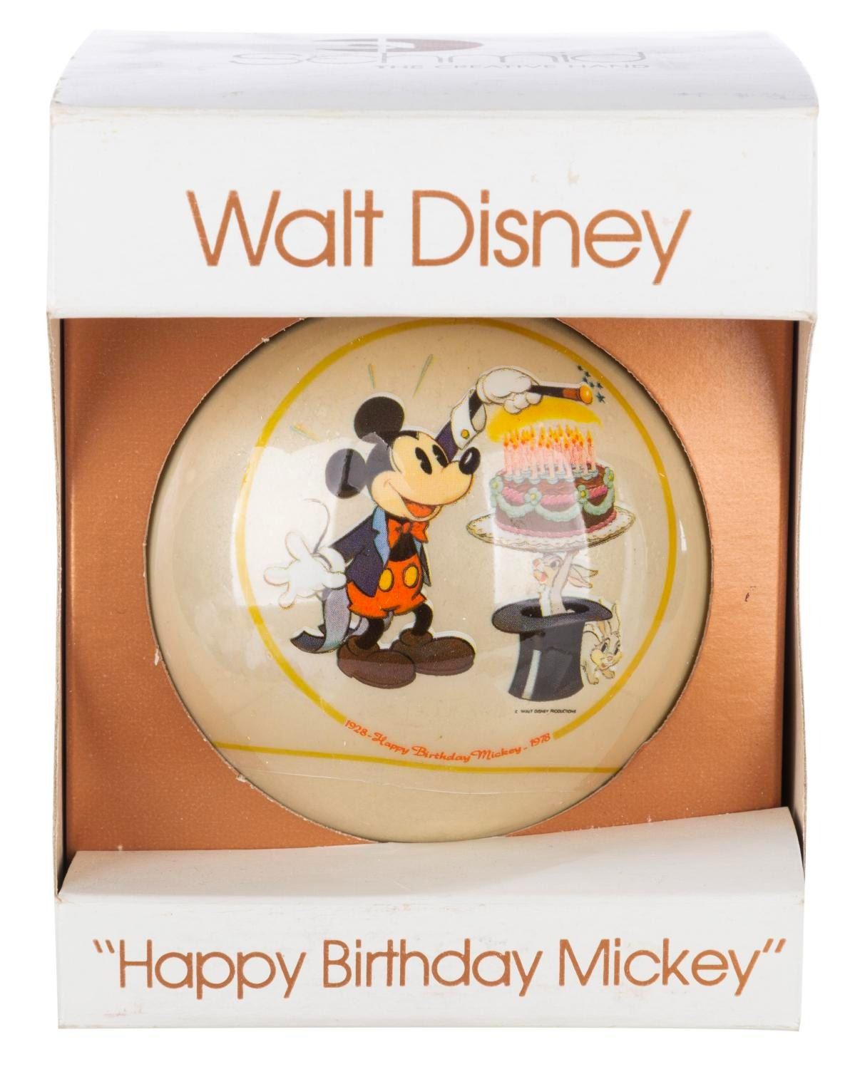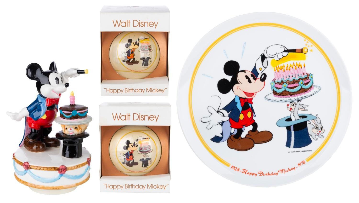 (Schmid, 1978) A collection of items commemorating the 50th birthday of Mickey Mouse. Included are two ornaments, a ceramic music box that plays the "It's A Small World" theme, and a matching plate. Measuring from 3" to 10.5" in diameter, the pieces are in fine to very good condition, with crazing and light glaze wear to the music box and discoloration to the ornaments.