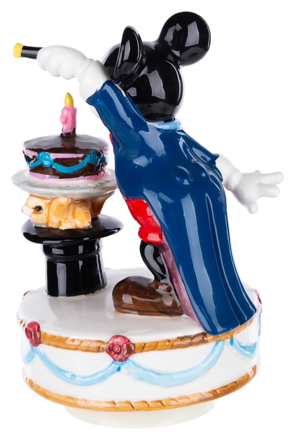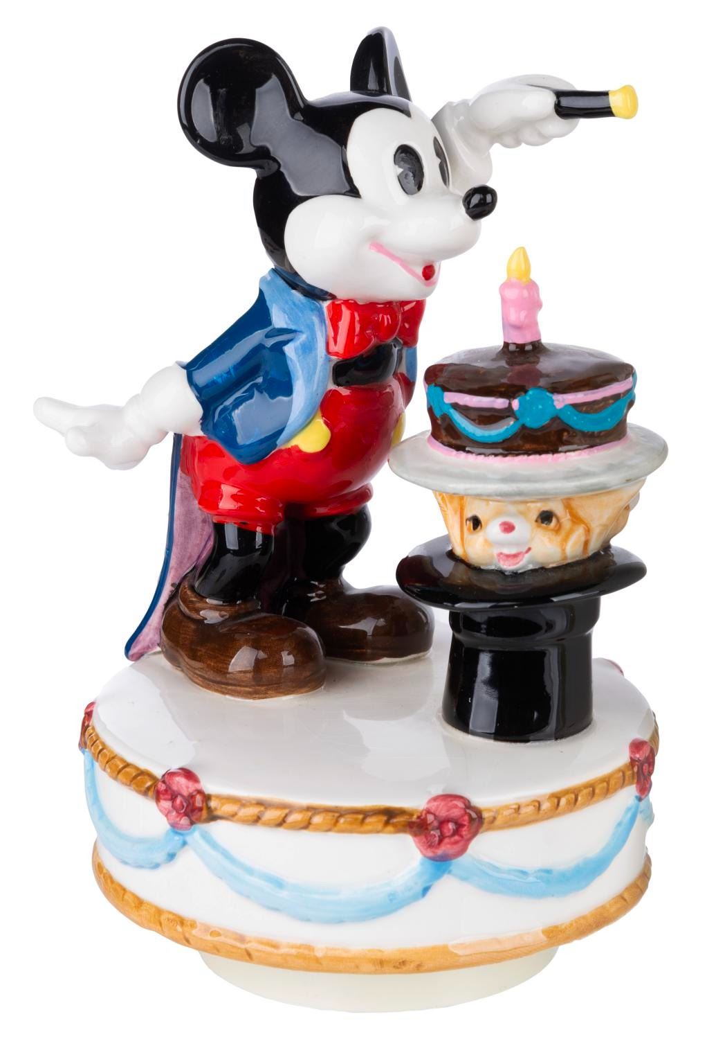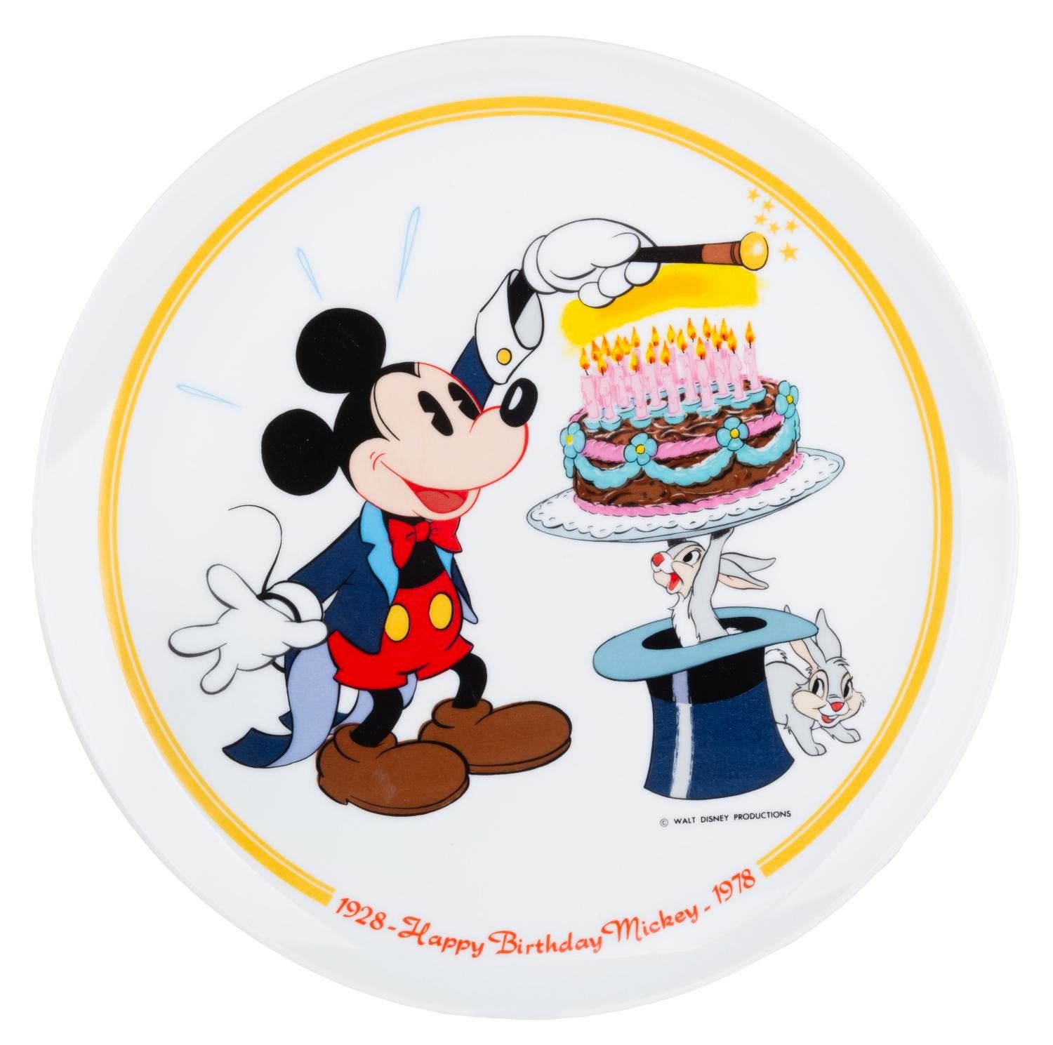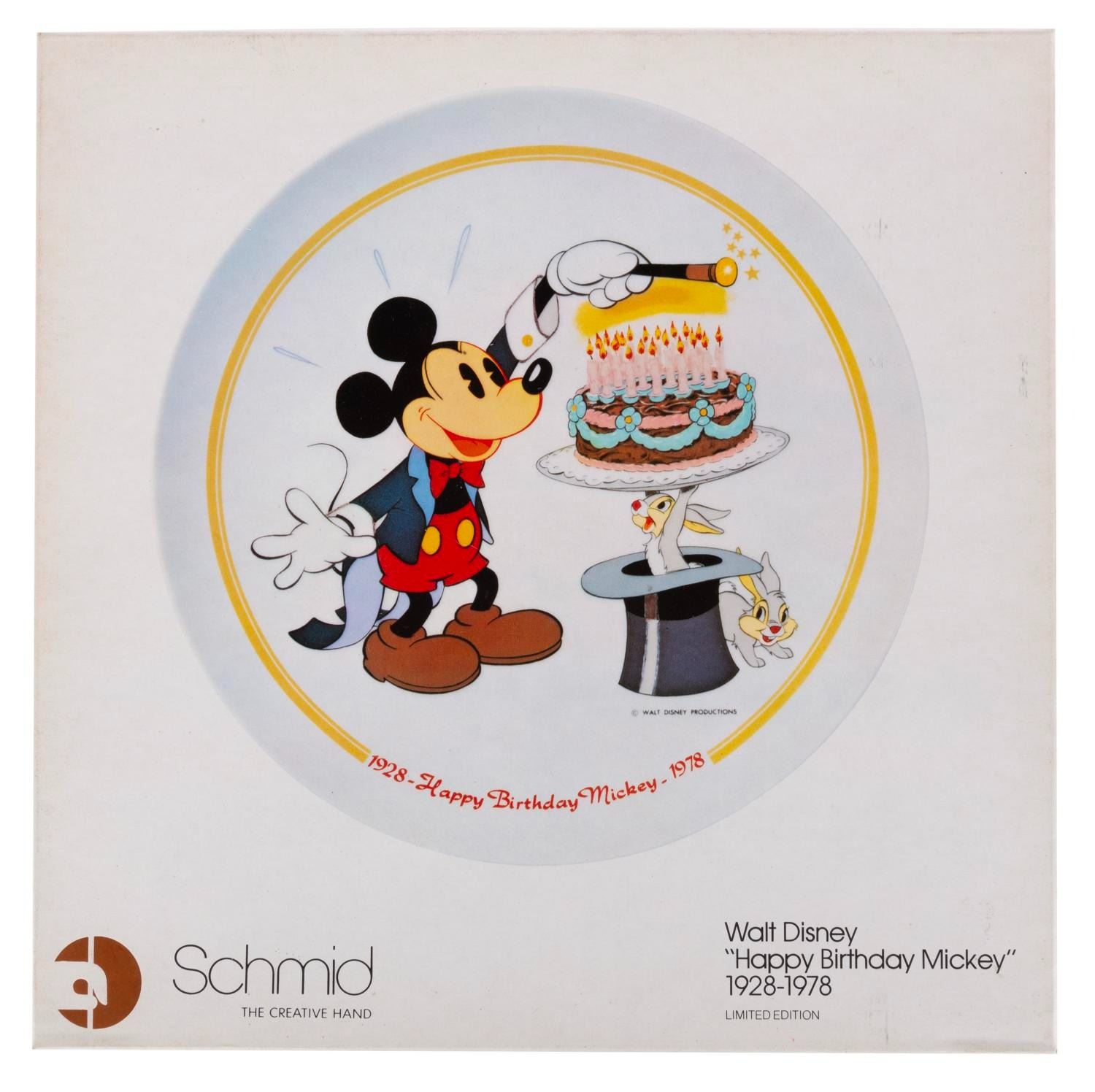 (Schmid, 1978) A collection of items commemorating the 50th birthday of Mickey Mouse. Included are two ornaments, a ceramic music box that plays the "It's A Small World" theme, and a matching plate. Measuring from 3" to 10.5" in diameter, the pieces are in fine to very good condition, with crazing and light glaze wear to the music box and discoloration to the ornaments.