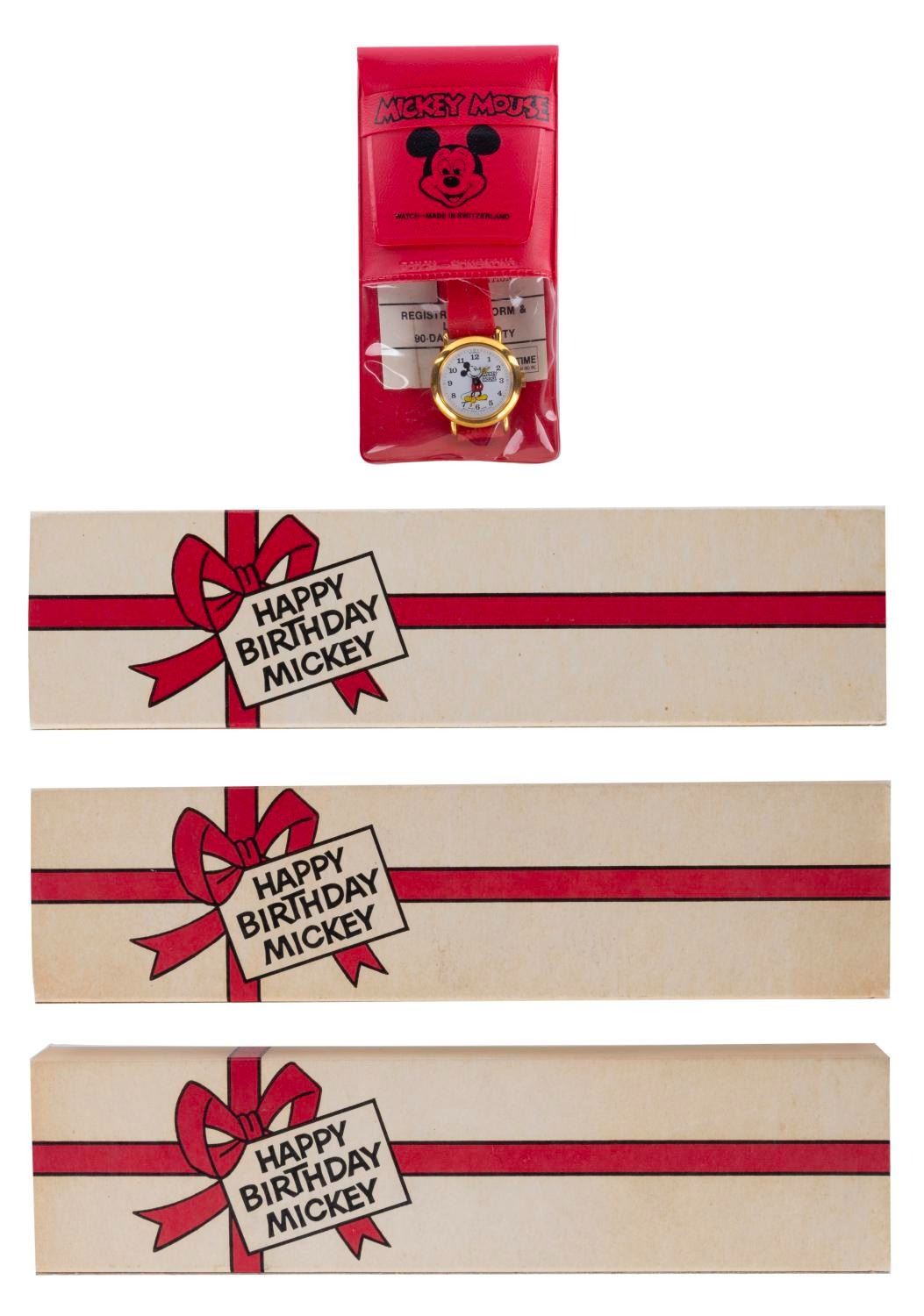 (Disney, 1978) A collection of four wristwatches celebrating Mickey's 50th birthday. Included are three manufactured by Bradley (two with square faces, one round, all with black bands and in the original cases) and one watch in the original red sleeve with a round face and red band. The wristwatches measure 8" to 8.5" long and are in fine condition. The cases measure from 2.5" x 2" to 9.5" x 2.25" x 1" and are in very good condition with handling wear and discoloration from age, with one case's plastic arms broken.