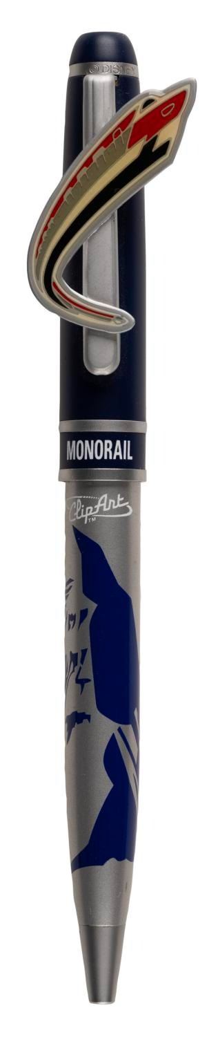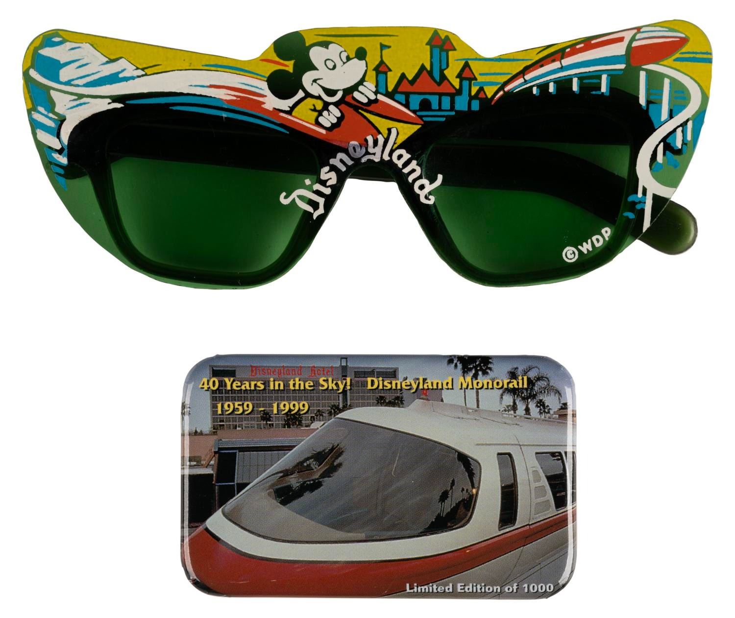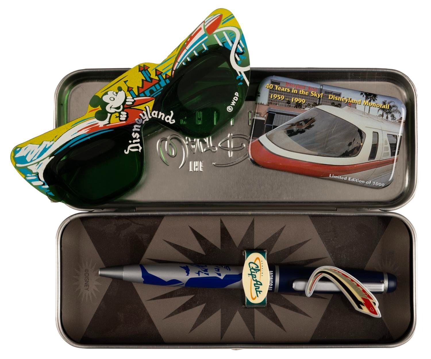 (Disneyland, 1990s) A collection of Monorail souvenirs including a Clip Art-branded pen in a Walt Disney Gallery case, a pinback button celebrating "40 Years in the Sky," and a pair of toddler sunglasses. Measuring from 1.75" x 2.75" to 2.5" x 6.5", the pen and button are in fine condition, the pen case displays light surface scratches throughout, and the sunglasses are in good condition with light scratches, a faint plastic odor, and oily texture due to age.