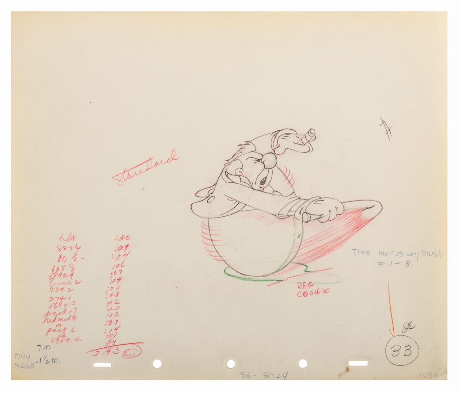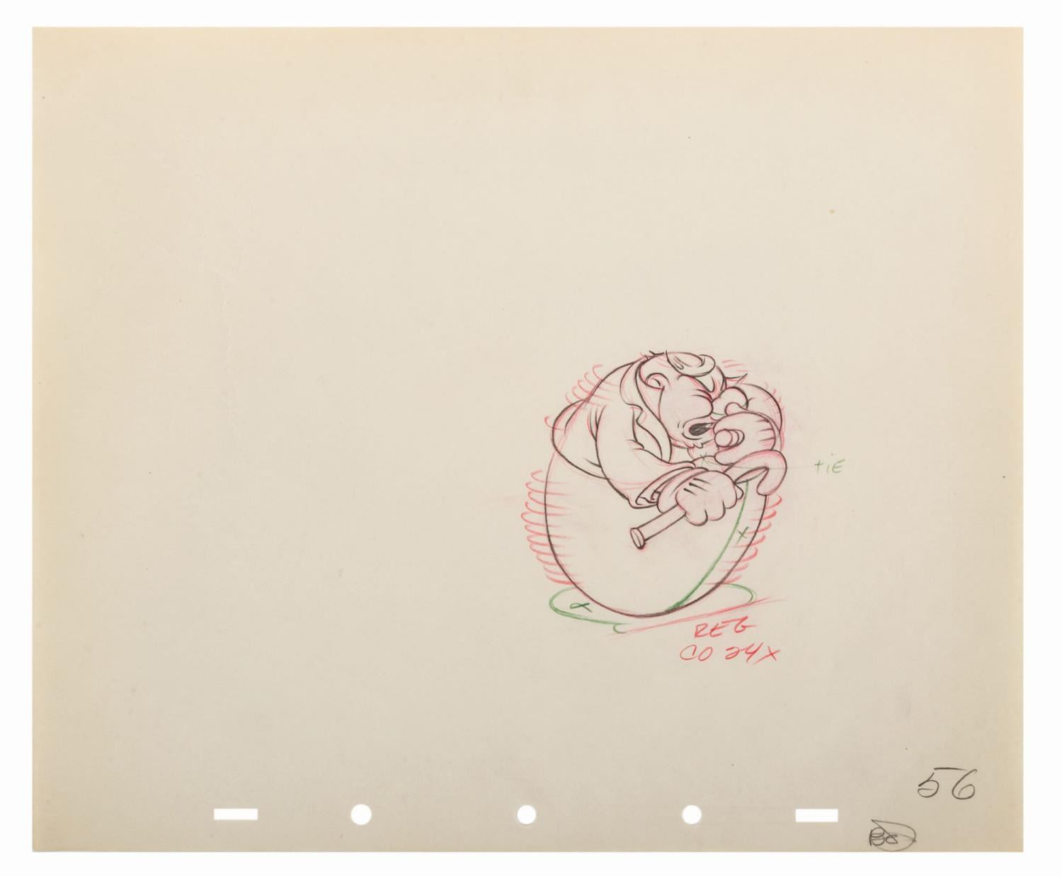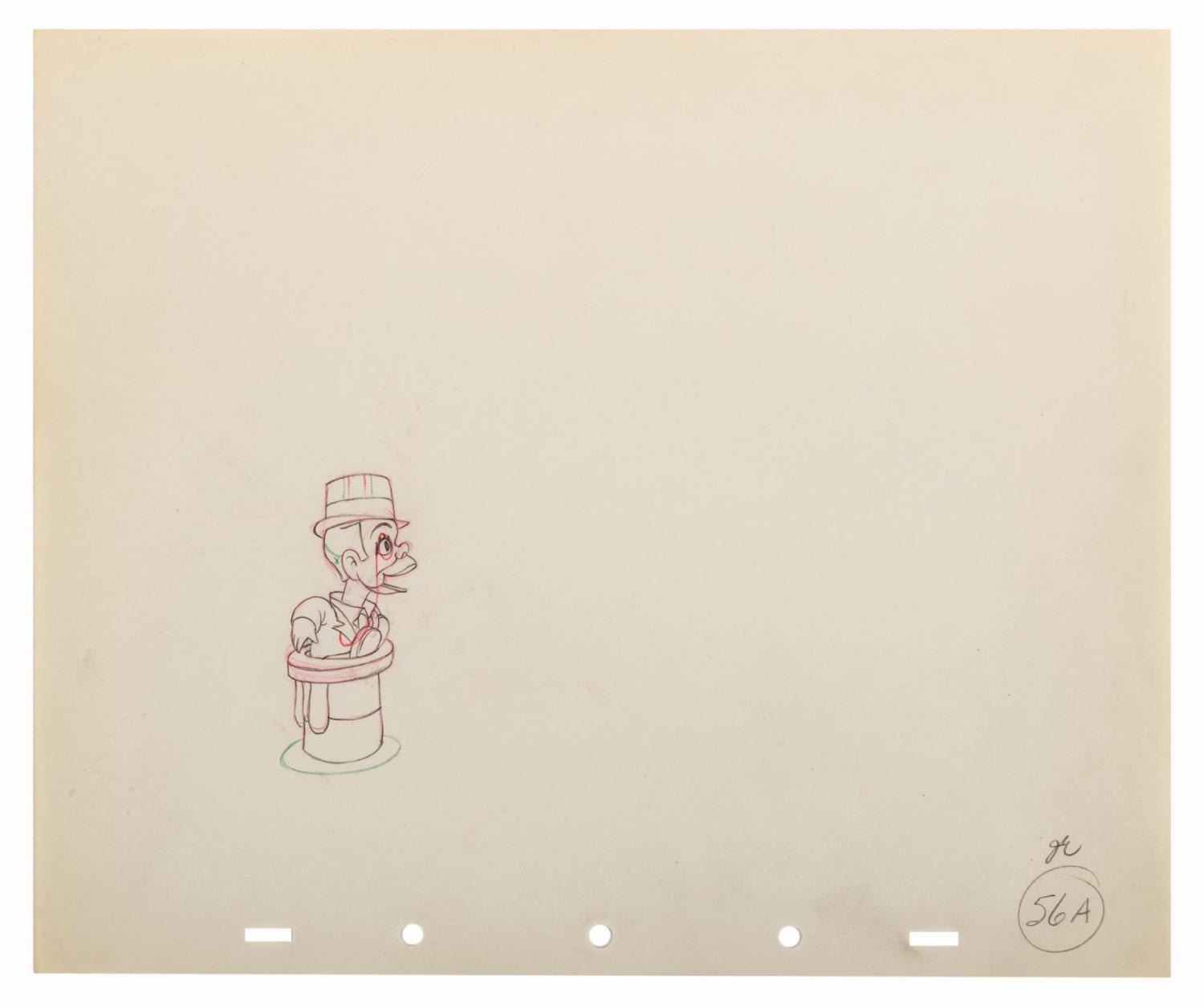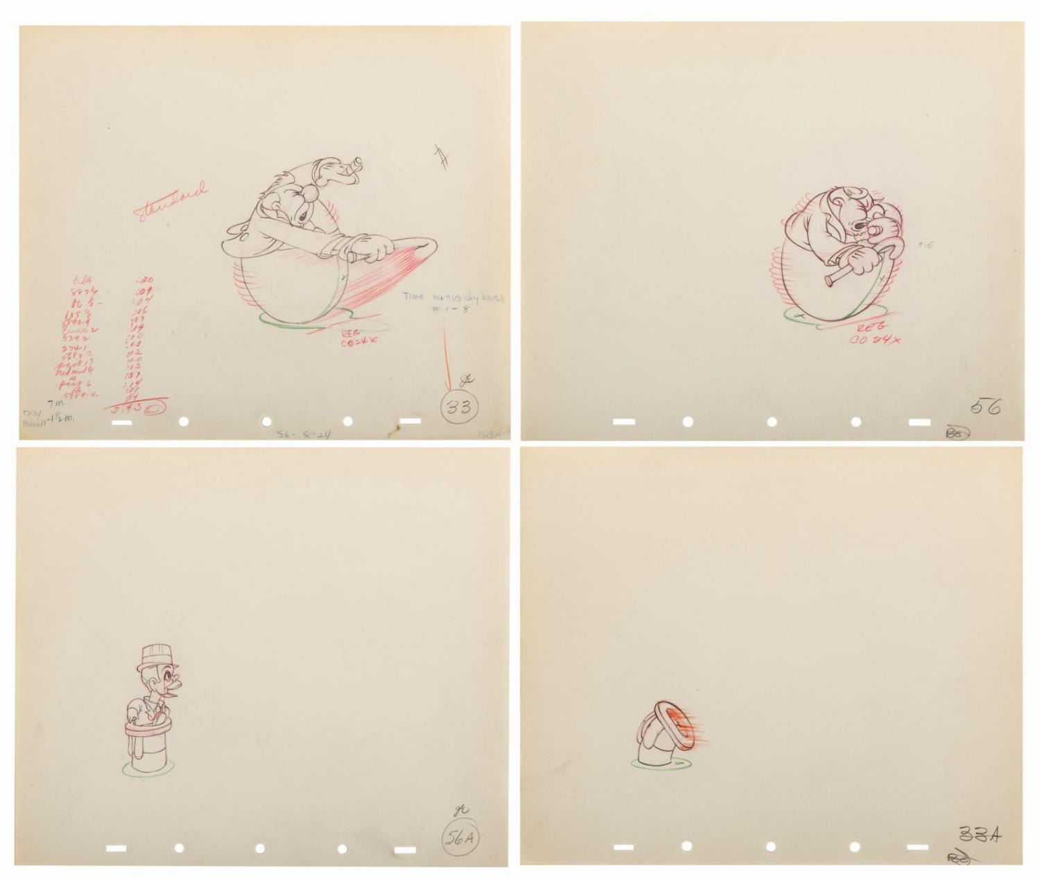 (Disney, 1938) A collection of four production drawings of W.C Fields and Charlie McCarthy from "Mother Goose Goes Hollywood." This Silly Symphony featured caricatures of contemporary Hollywood celebrities in nursery rhyme vignettes. With image sizes of 2” x 1.5” to 4.25” x 5.25” on 10” x 12” animation paper, the graphite drawings are in very good condition with discoloration from age.