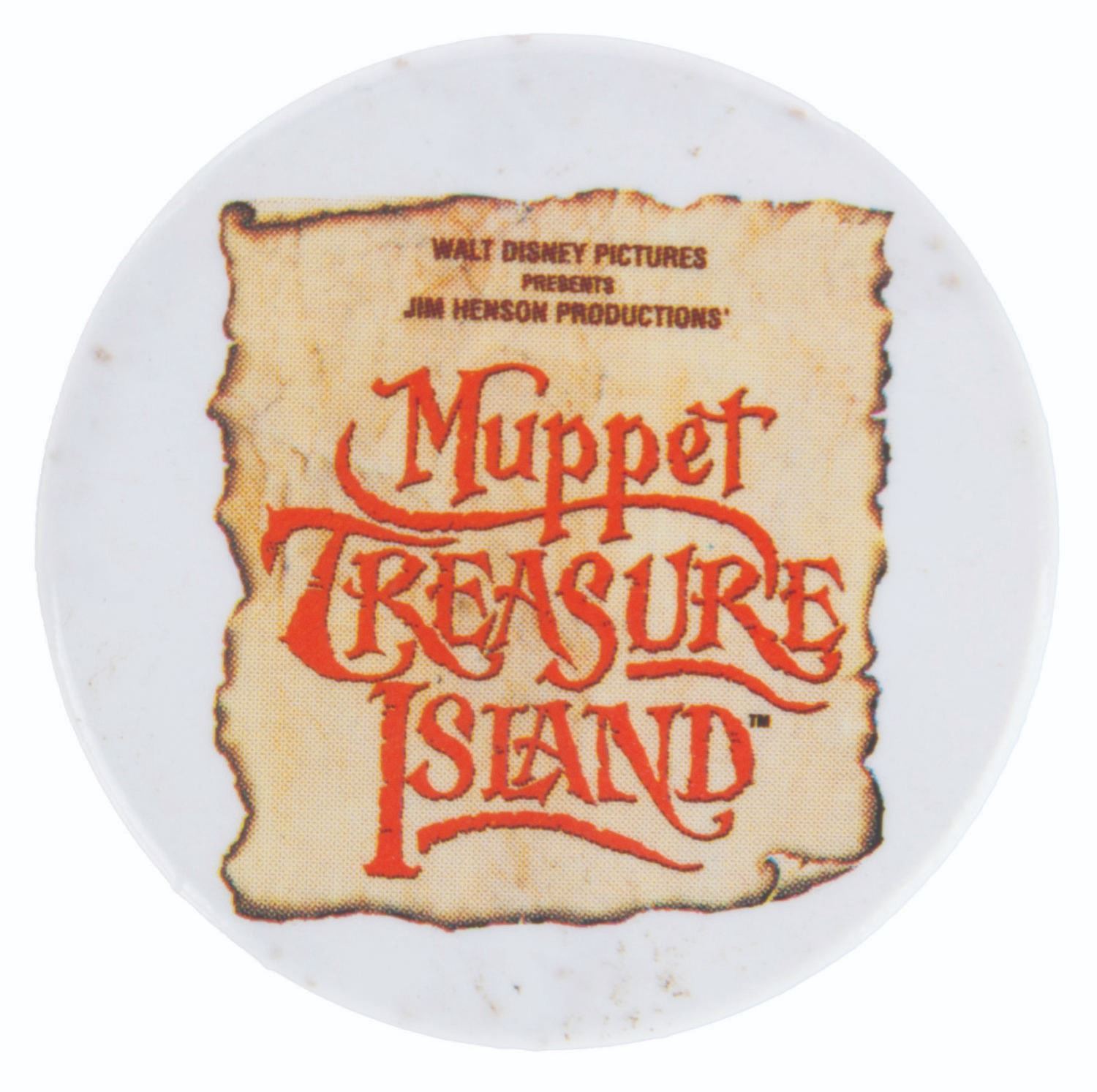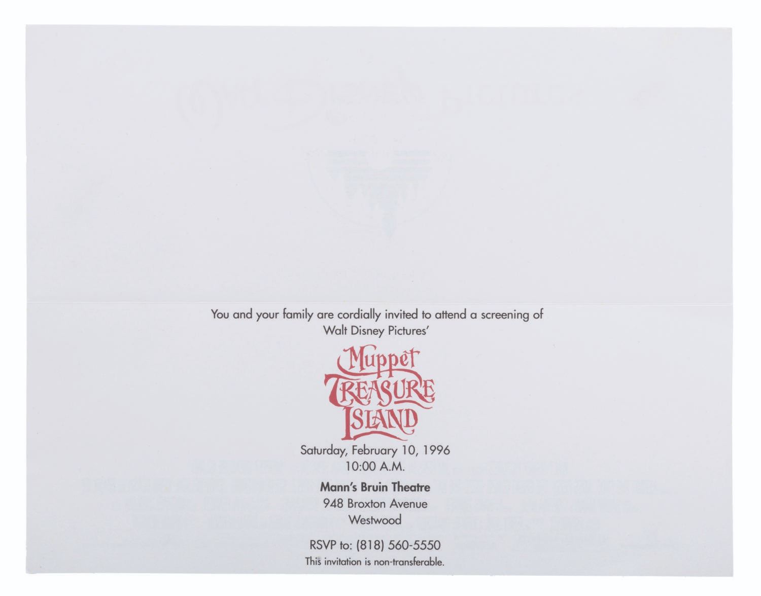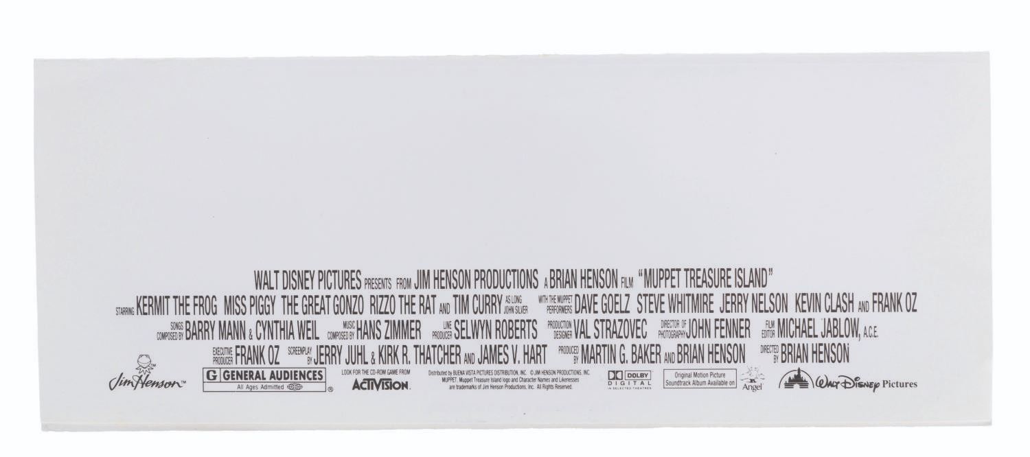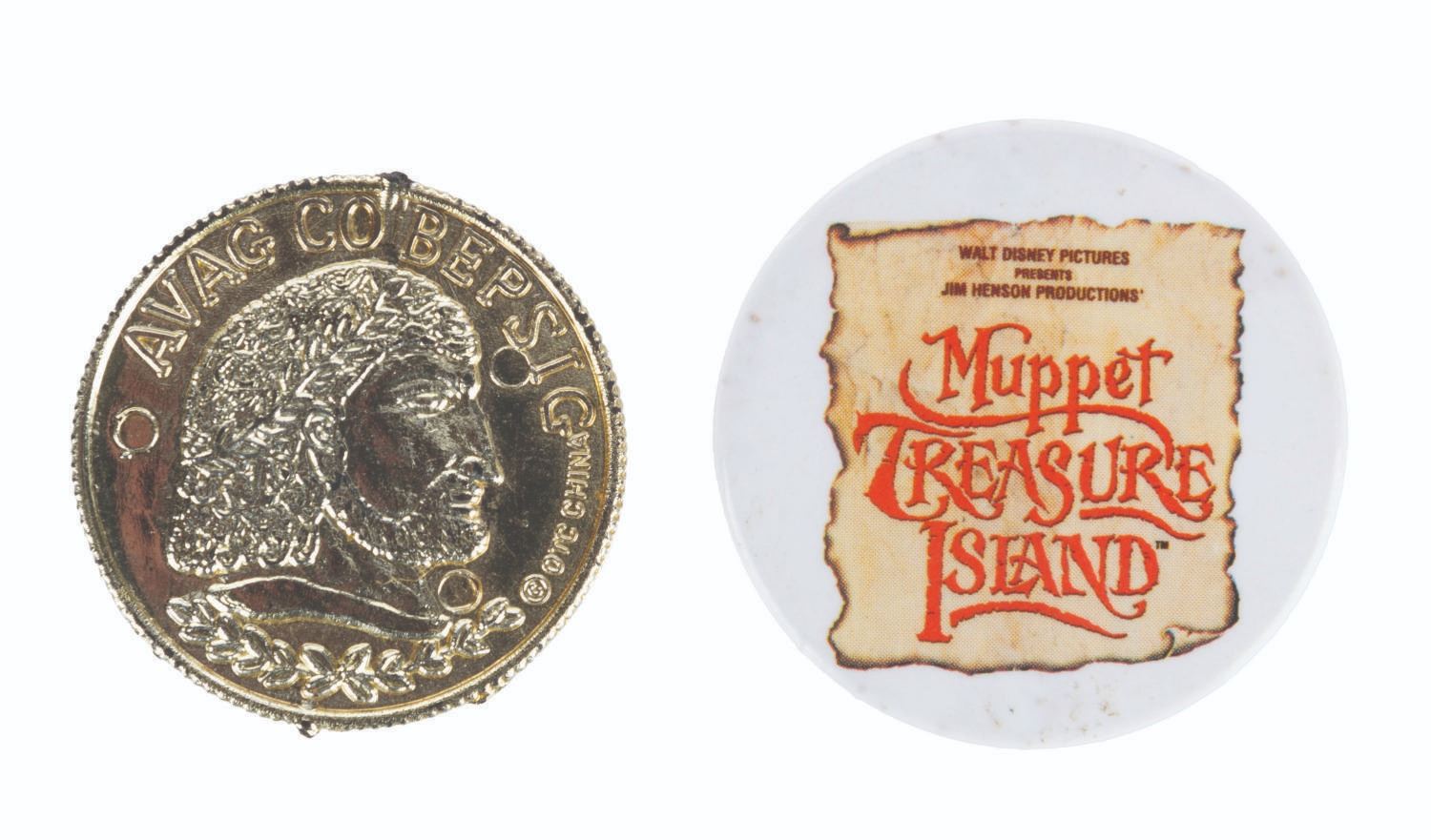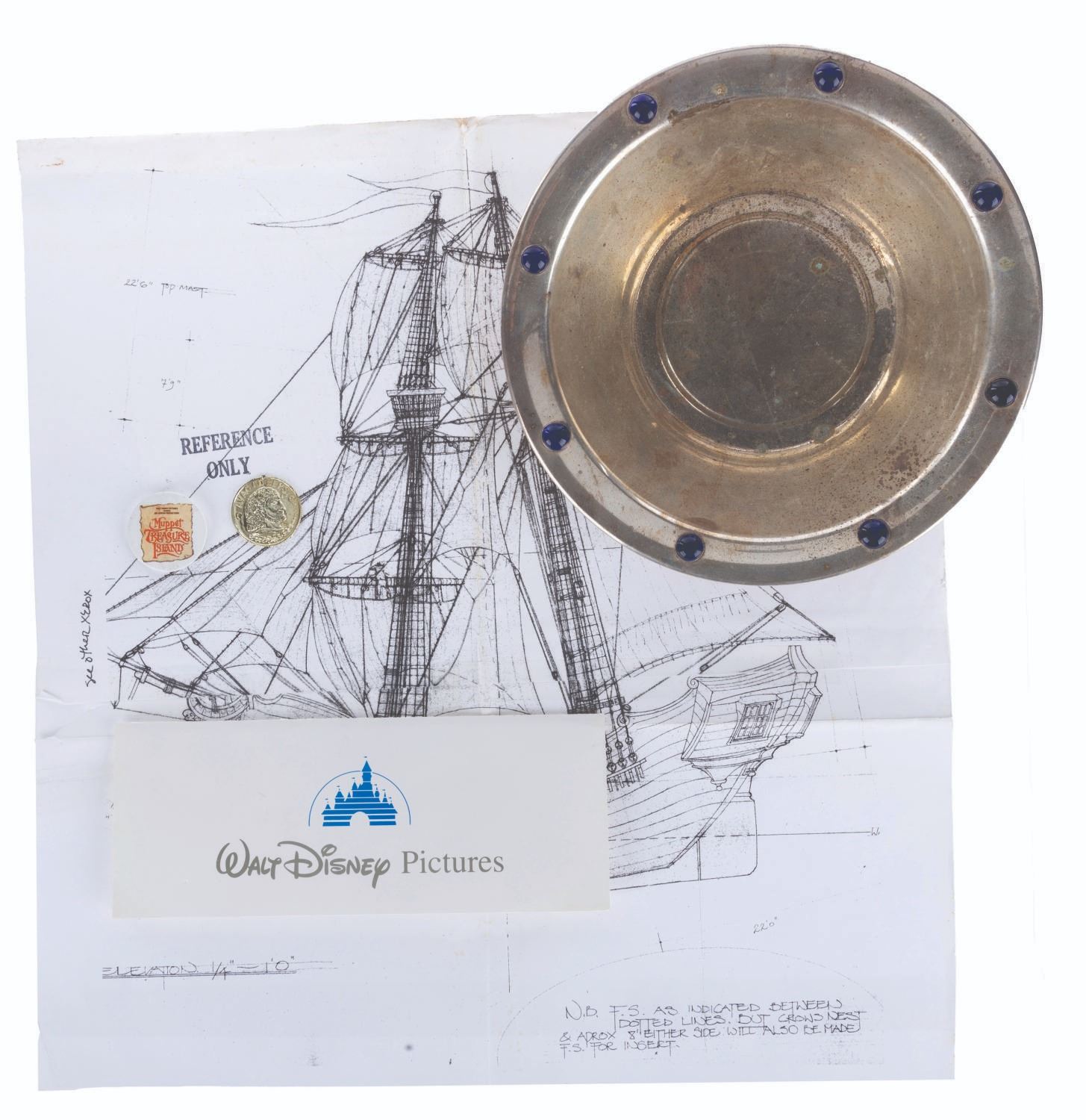 (Disney, 1996) A collection of production materials and props from "Muppet Treasure Island.” Included are a reference photocopy blueprint for the Hispaniola, two prop gold-toned plastic doubloons and a prop faux jewel rimmed brass bowl, and a premiere screening invitation and button. Measuring from the 1.25” diameter doubloons to the 18” x 17” photocopy, the items display in good to very good condition with light edge wear and creasing to the photocopy and invitation, light wear and stains to the doubloons and button, and tarnish to the bowl.