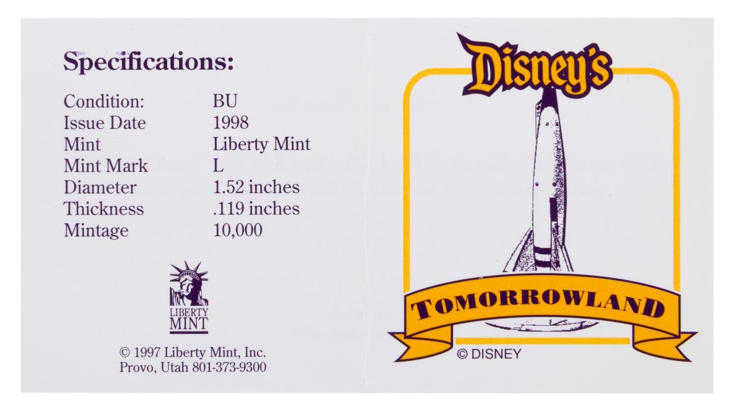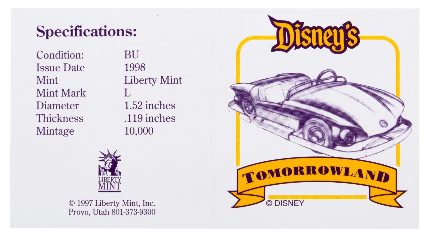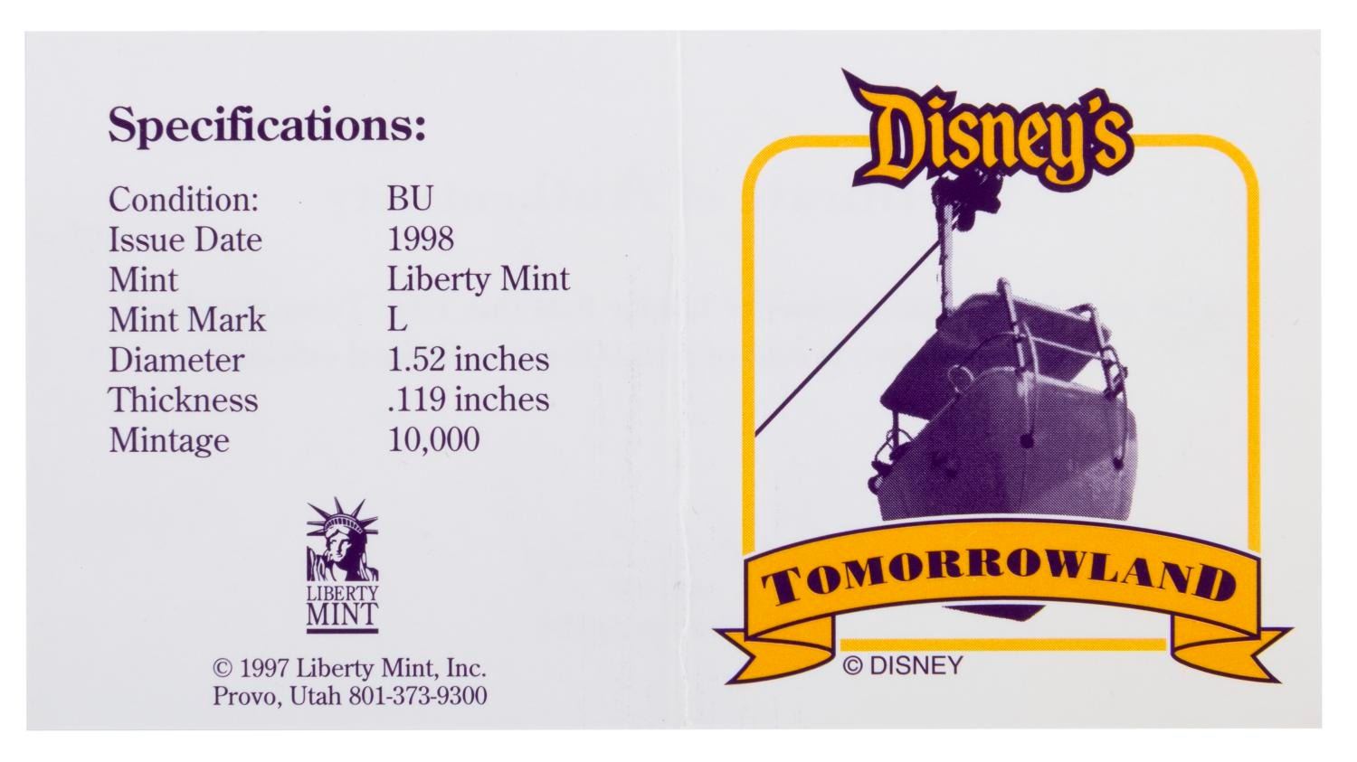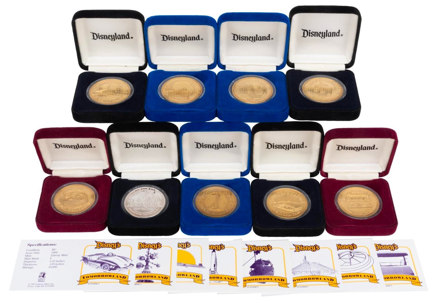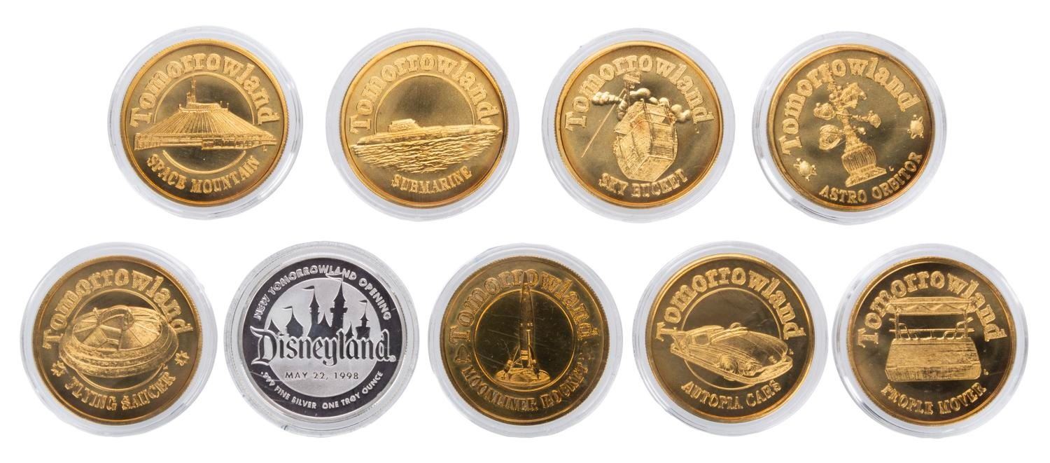 (Disneyland, 1998) A collection of coins commemorating Disneyland’s New Tomorrowland refurbishment. Included are eight gold coins featuring beloved Tomorrowland attractions, each with a descriptive certificate of authenticity, and a one troy ounce fine silver coin commemorating the grand opening on May 22, 1998. The 1.5” diameter coins with the original boxes are in very good condition with light scratches and oxidation from age.