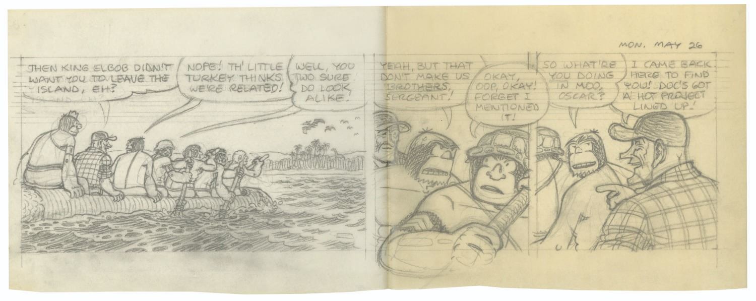 (Graue, 1980) A collection of 6 sheets of hand-drawn comic strip panels by artist Dave Graue for the popular comic series, Alley Oop. Each sheet is accomplished in pencil on vellum, with one panel personalized and signed by Graue to Alan Hylton. Measuring 7.5" x 17", the collection is in overall very good condition with minor wear from use and a vertical fold in the center from being mailed. Three of the sheets are stapled together in the top-left corner.