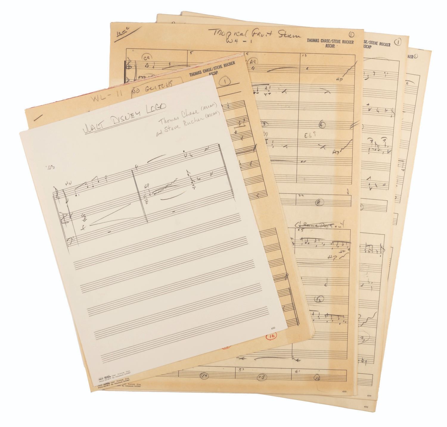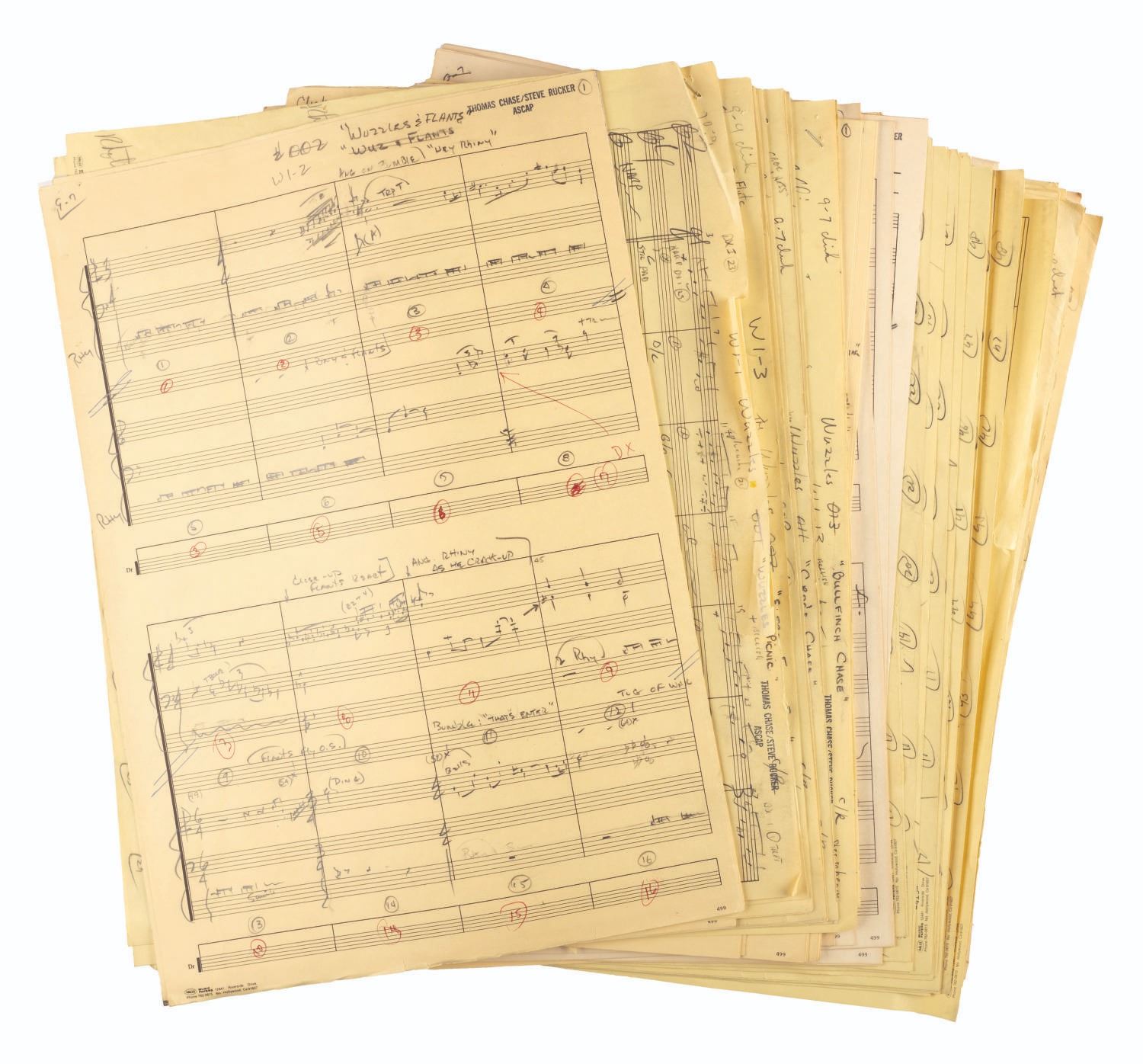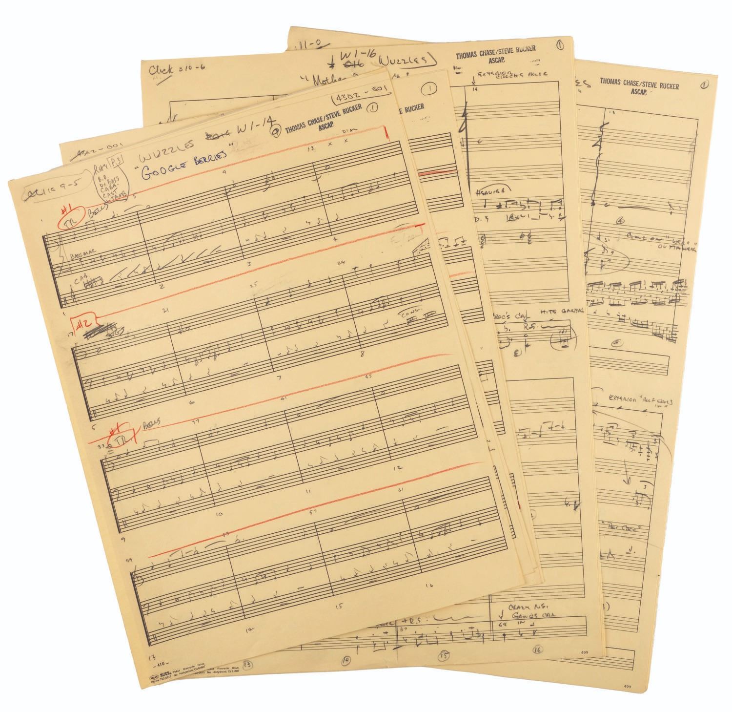 (Disney, 1985) An incredible collection of hand-written scores for "The Wuzzles" TV series. The collection contains over 100 pages of hand-written music by Thomas Chase and Steve Rucker, covering much of the music used during the series. Once part of the Walt Disney Productions Music Library, the scores are in very good condition with edge wear to some pages from storage and use.
