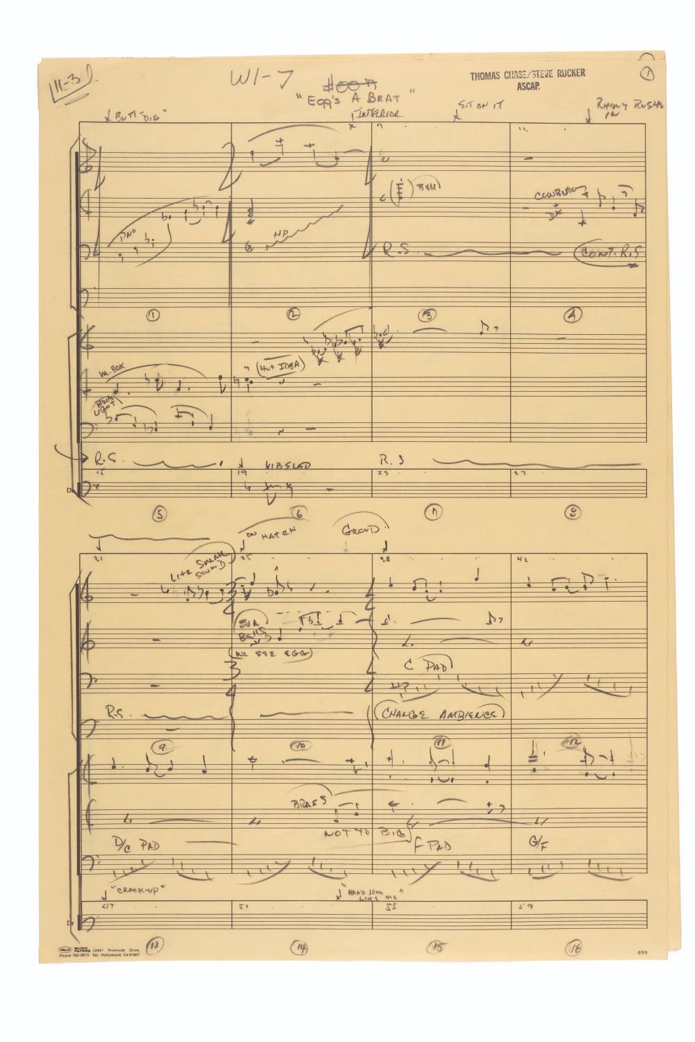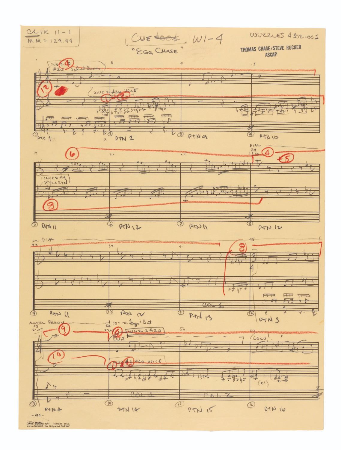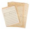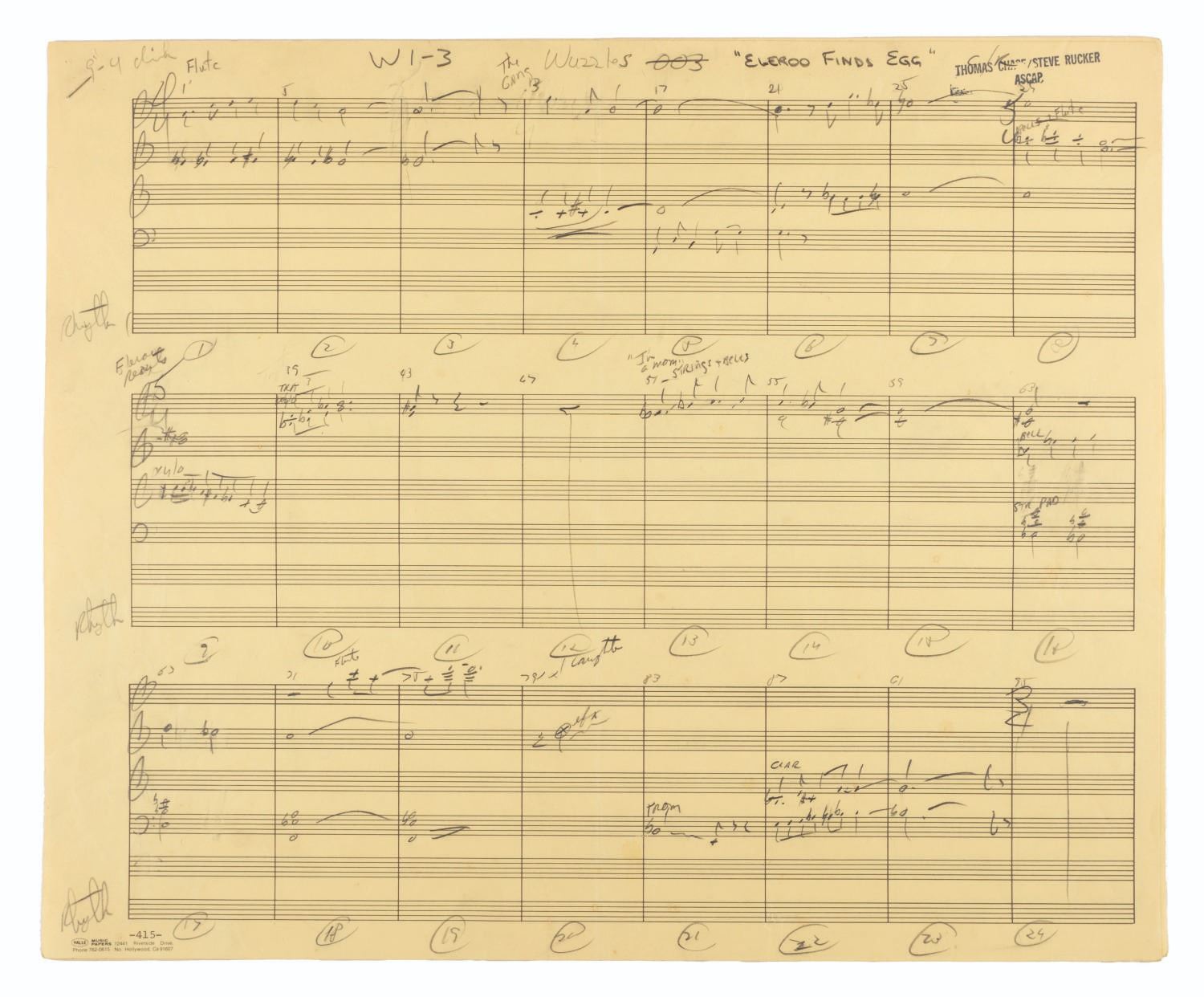 (Disney, 1985) An incredible collection of hand-written scores for "The Wuzzles" TV series. The collection contains over 100 pages of hand-written music by Thomas Chase and Steve Rucker, covering much of the music used during the series. Once part of the Walt Disney Productions Music Library, the scores are in very good condition with edge wear to some pages from storage and use.