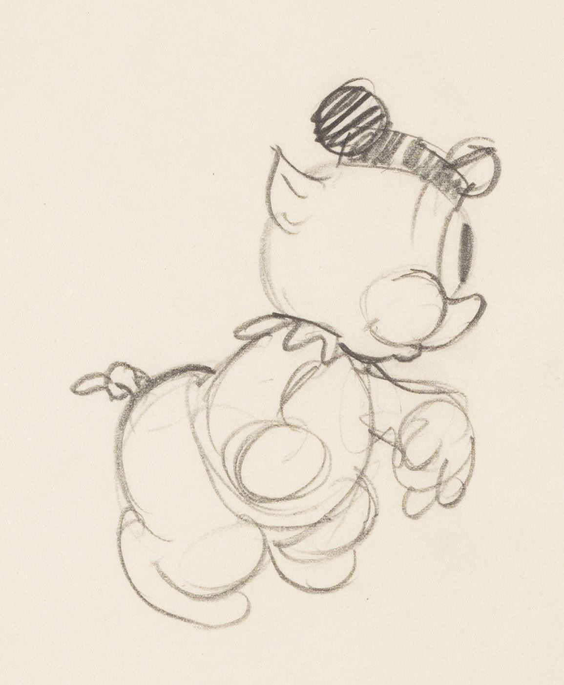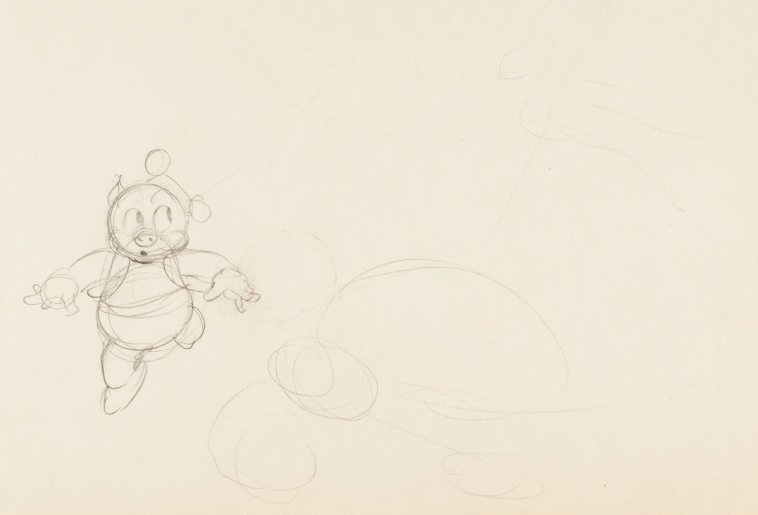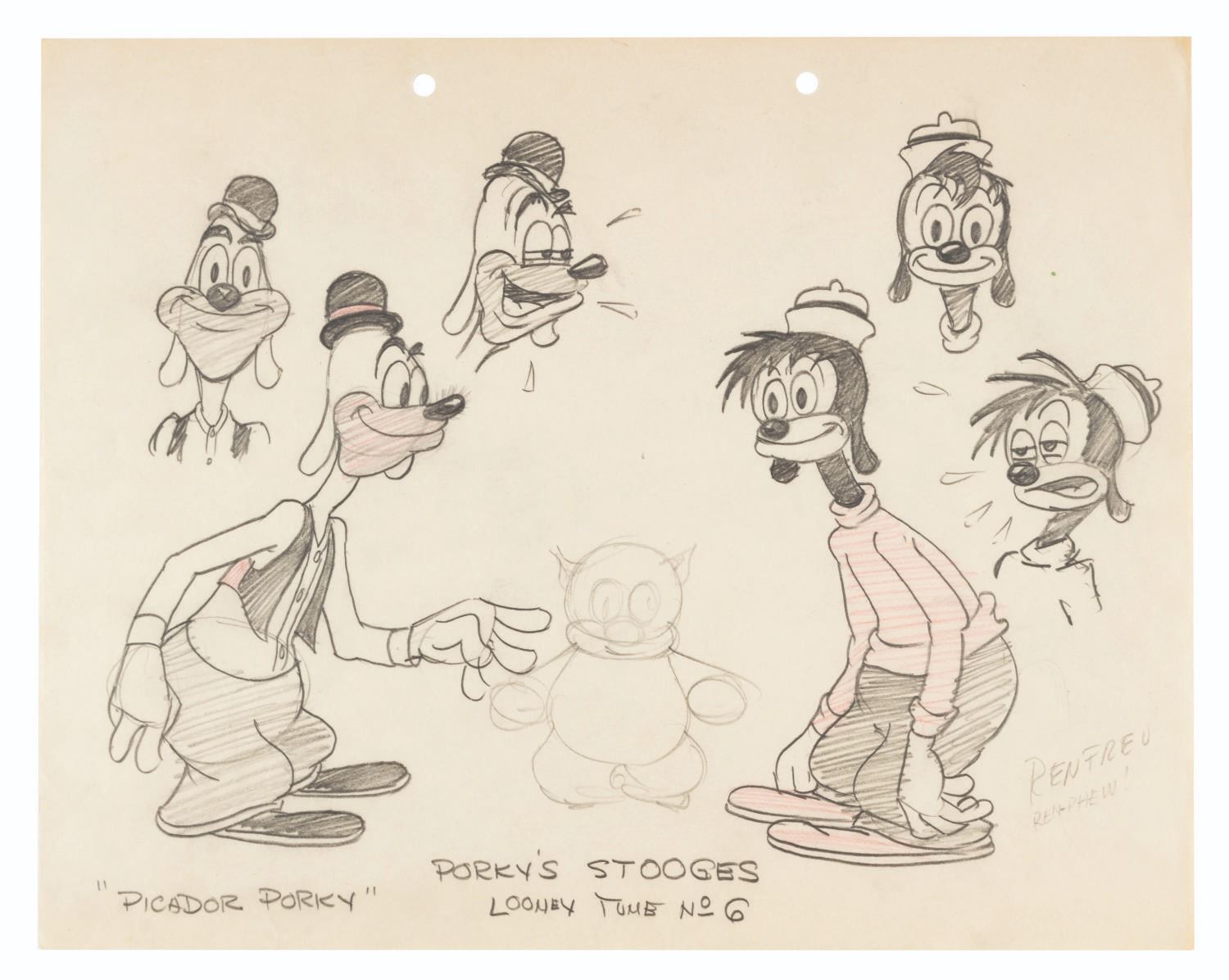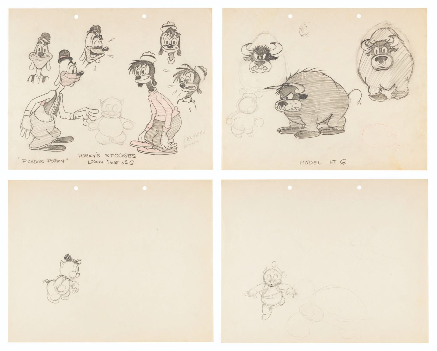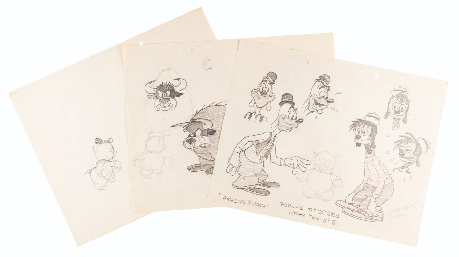 (Schlesinger, 1936-37) A collection of two production drawings and two hand-drawn model sheets from “Picador Porky.” The drawings were accomplished in graphite and colored pencil and feature Porky, Porky’s Stooges, and the bull. Measuring 9.5” x 12” each, the drawings are in very good condition with creases and discoloration from age.