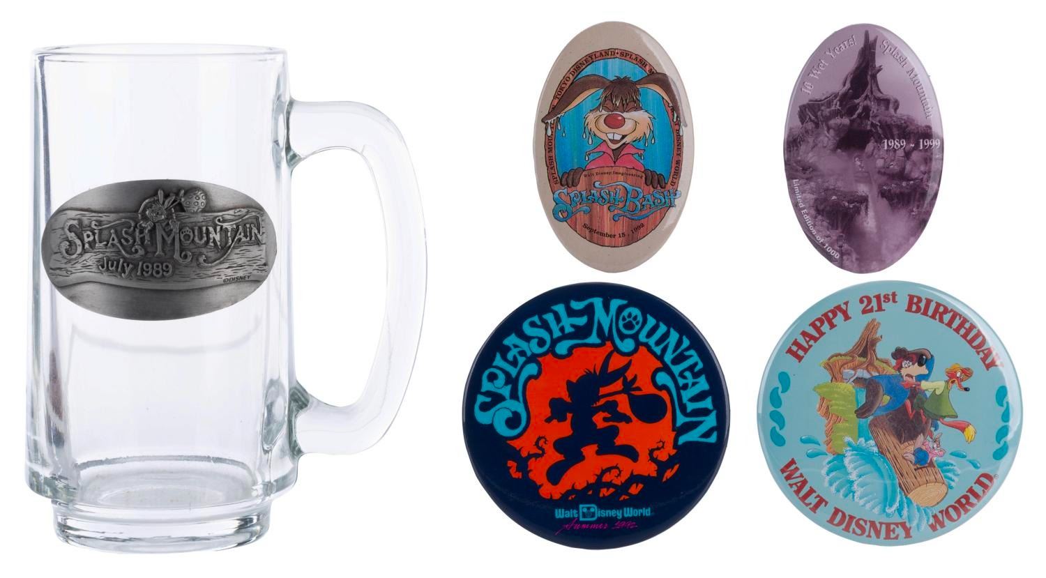 (Disney, 1989 - 1999) A collection of Splash Mountain memorabilia. Included is a glass mug with a pewter logo, three buttons from Walt Disney World including an Imagineering exclusive, and a limited edition 1000 button celebrating Splash Mountain's 10th anniversary at Disneyland in 1999. Measuring from 1.75" x 2.75" up to 5.75" x 4.25" x 2.75", the pieces are in very good condition with light handling wear.