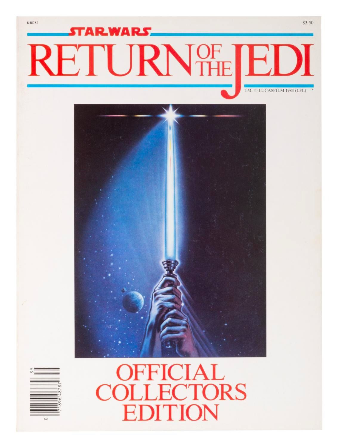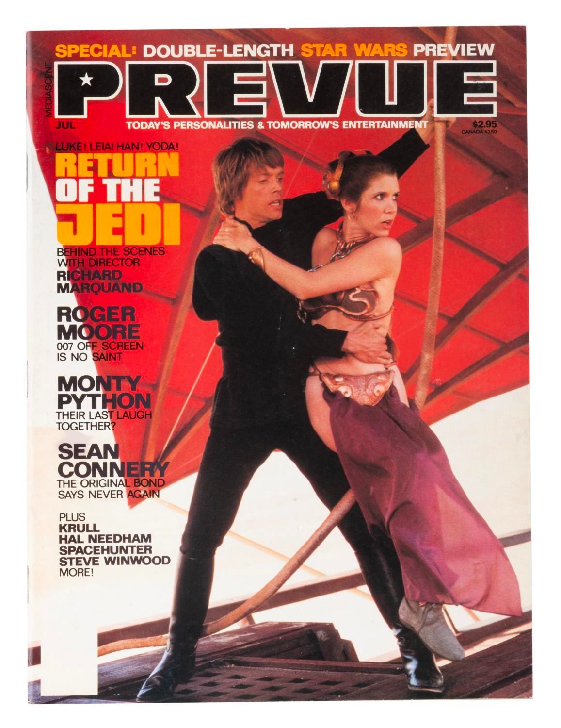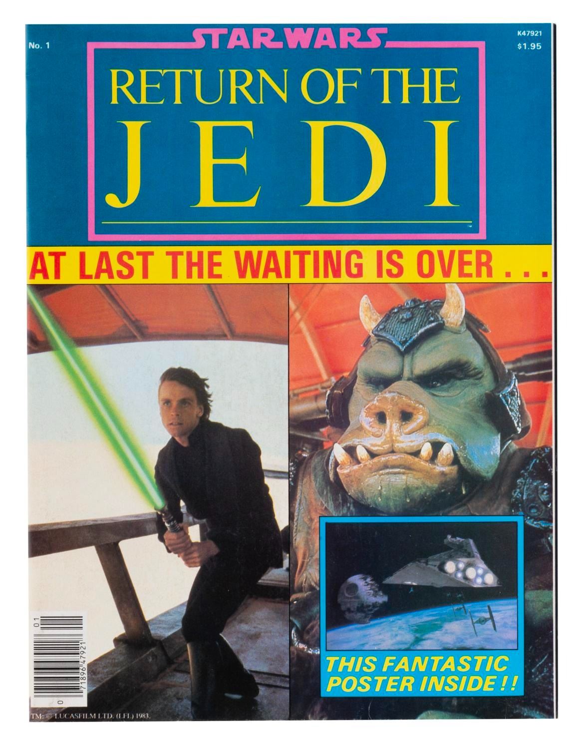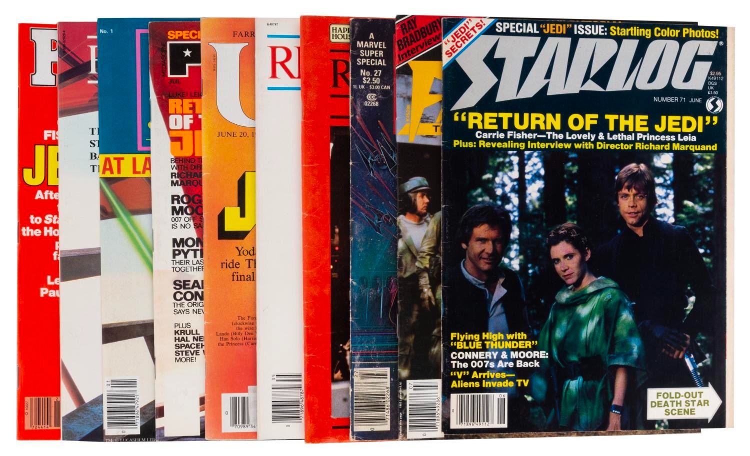 (Lucasfilm Ltd., 1983) A collection of ten "Return of the Jedi" books and magazines. Included are Prevue Magazine Vol 2 No 12, "Return of the Jedi" Poster Book No 1, Return of the Jedi Storybook, People Weekly with a cover story on Carrie Fisher, a Return of the Jedi Mazes Book, "Return of the Jedi" Official Collections Edition, US Magazine with a cover story on the film, Starlog No 71, Fantastic Films No 34, and "Return of the Jedi" official comics adaptation by Marvel. The publications are in fair to very good condition with typical wear from use, and writing inside the Mazes book.