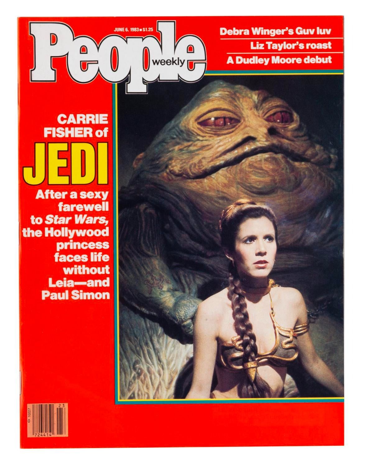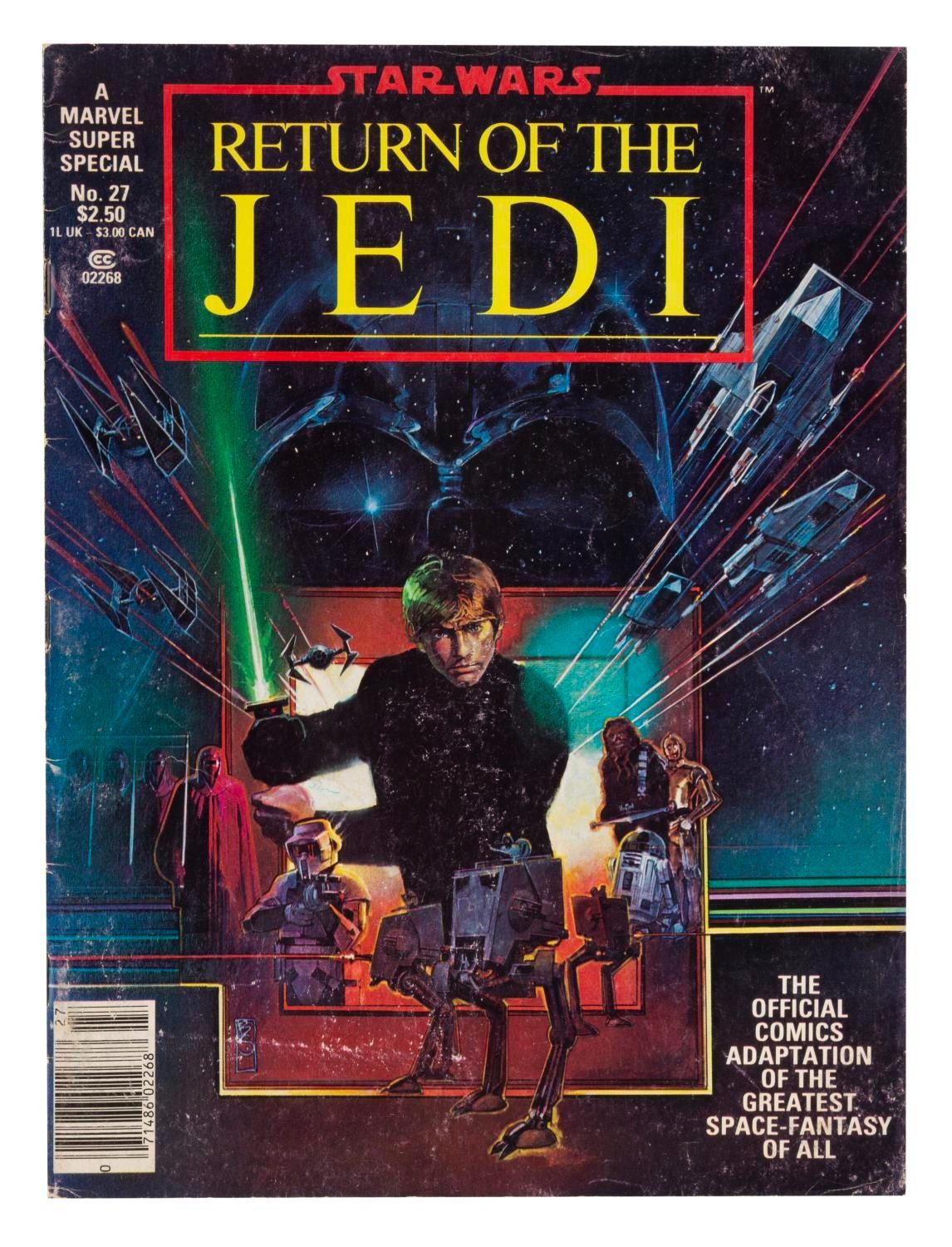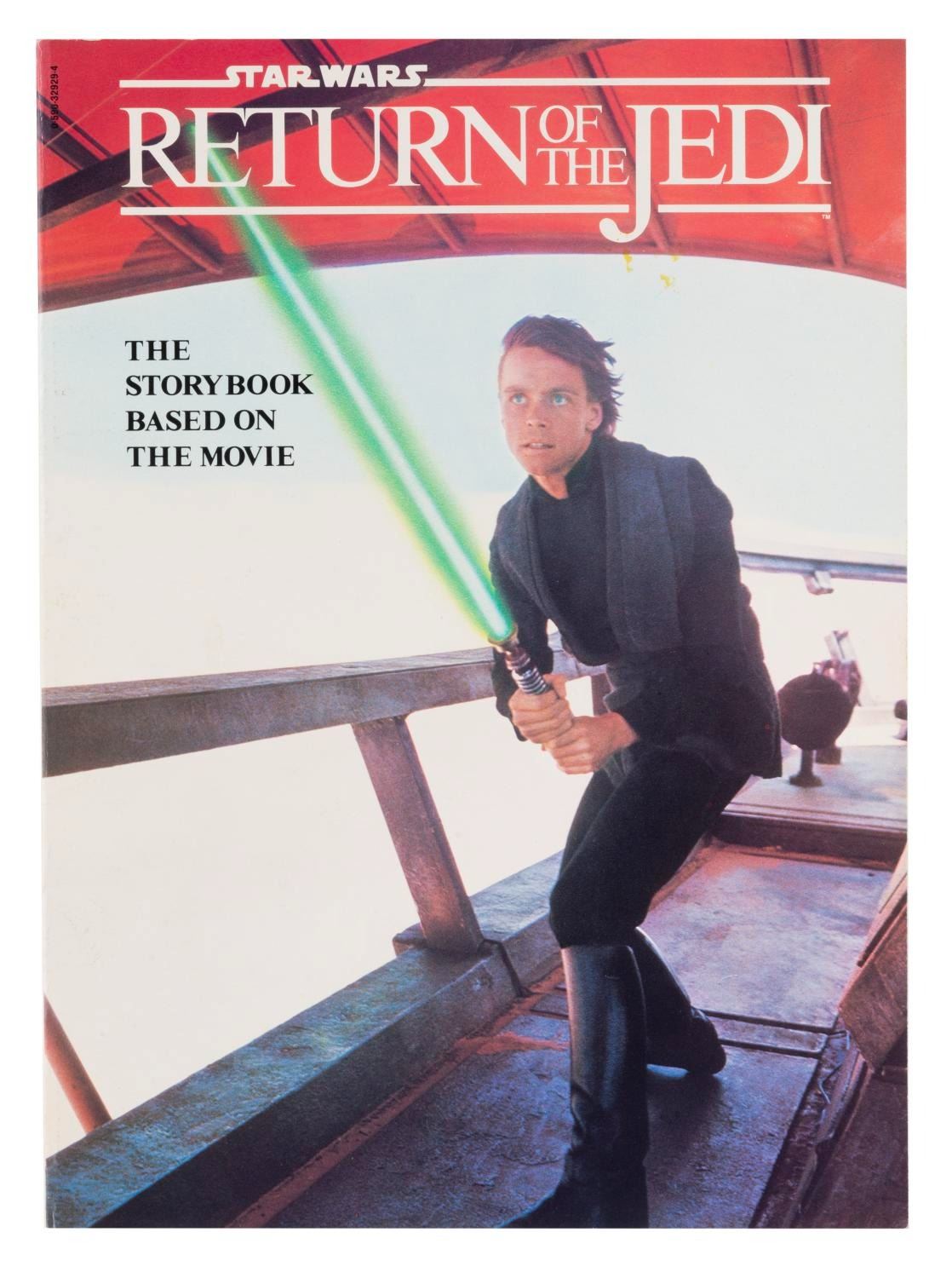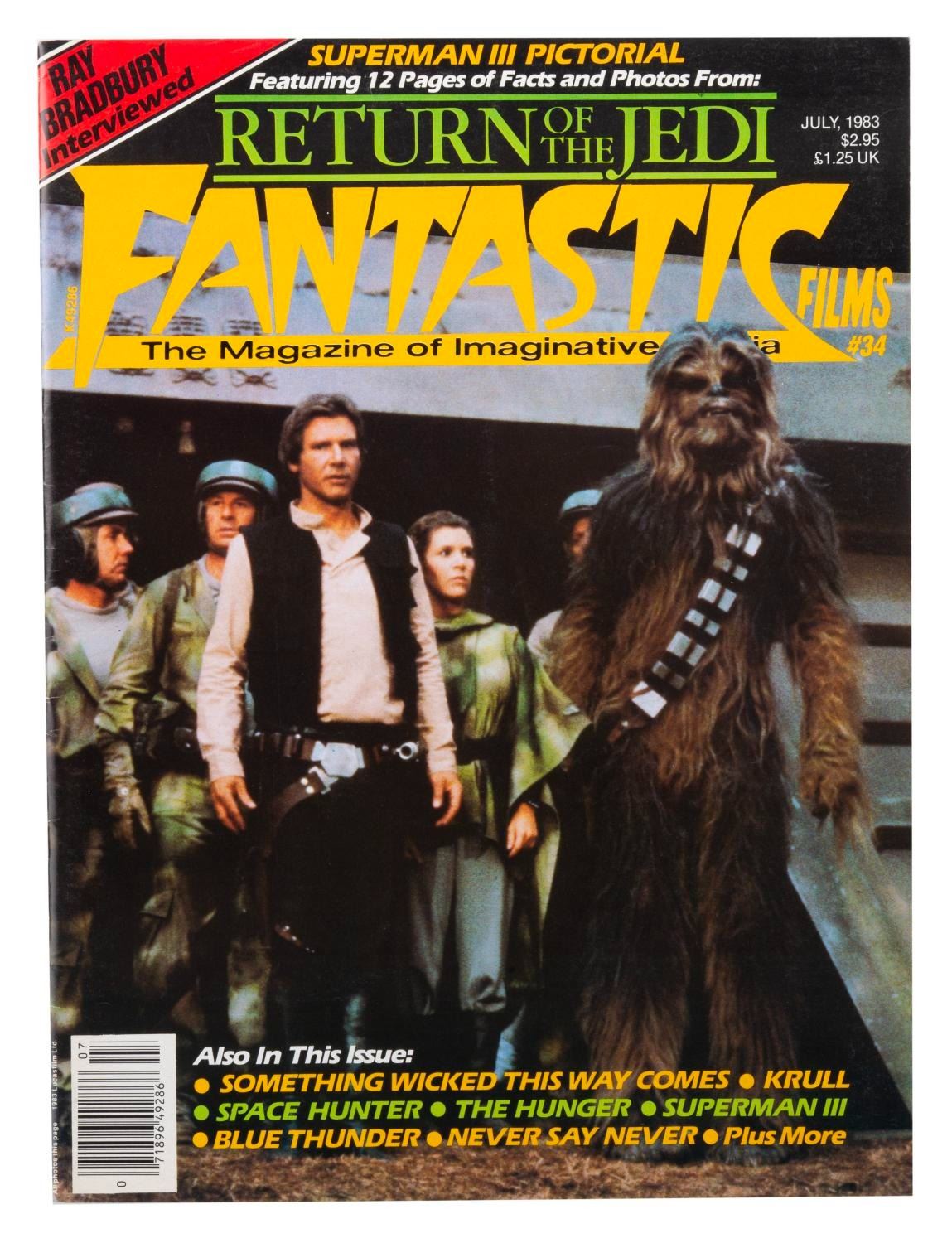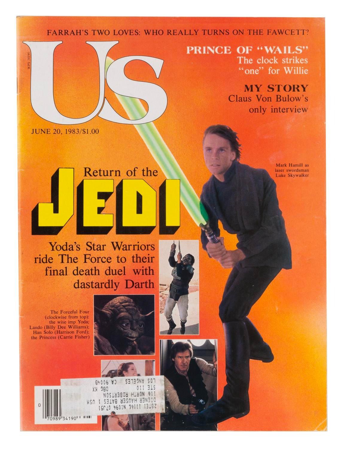 (Lucasfilm Ltd., 1983) A collection of ten "Return of the Jedi" books and magazines. Included are Prevue Magazine Vol 2 No 12, "Return of the Jedi" Poster Book No 1, Return of the Jedi Storybook, People Weekly with a cover story on Carrie Fisher, a Return of the Jedi Mazes Book, "Return of the Jedi" Official Collections Edition, US Magazine with a cover story on the film, Starlog No 71, Fantastic Films No 34, and "Return of the Jedi" official comics adaptation by Marvel. The publications are in fair to very good condition with typical wear from use, and writing inside the Mazes book.