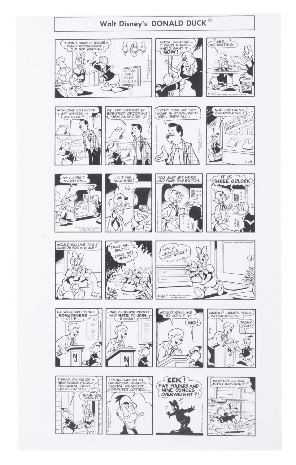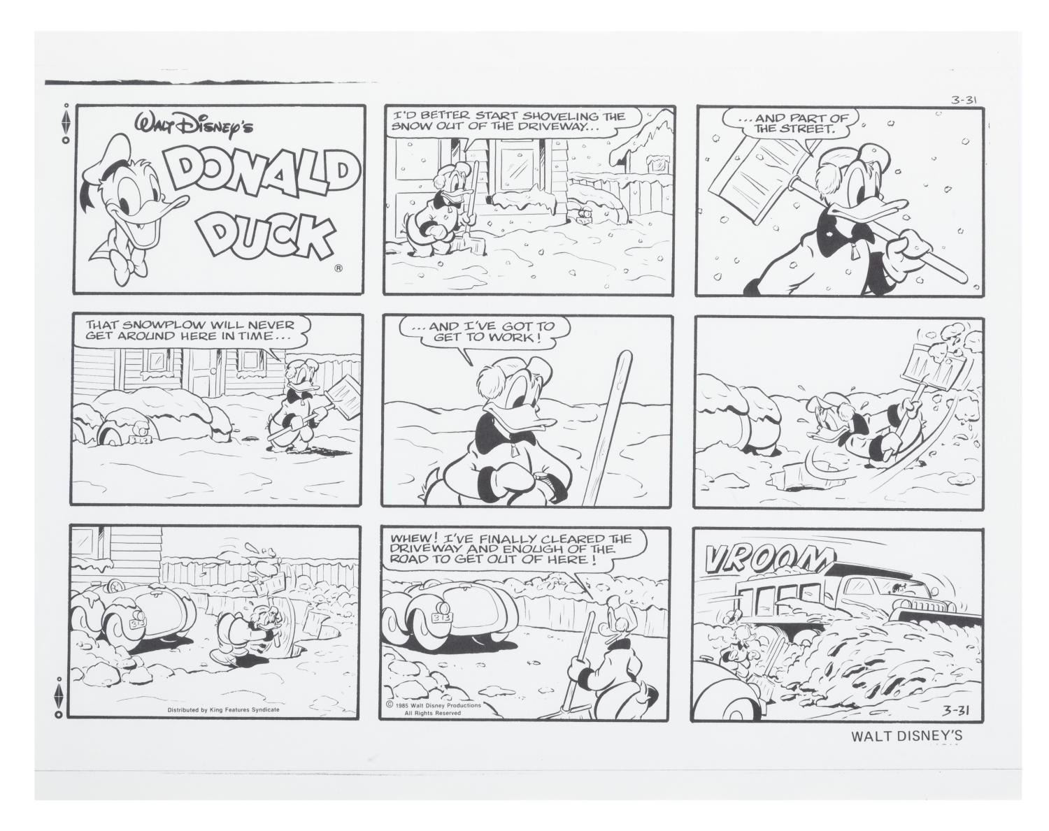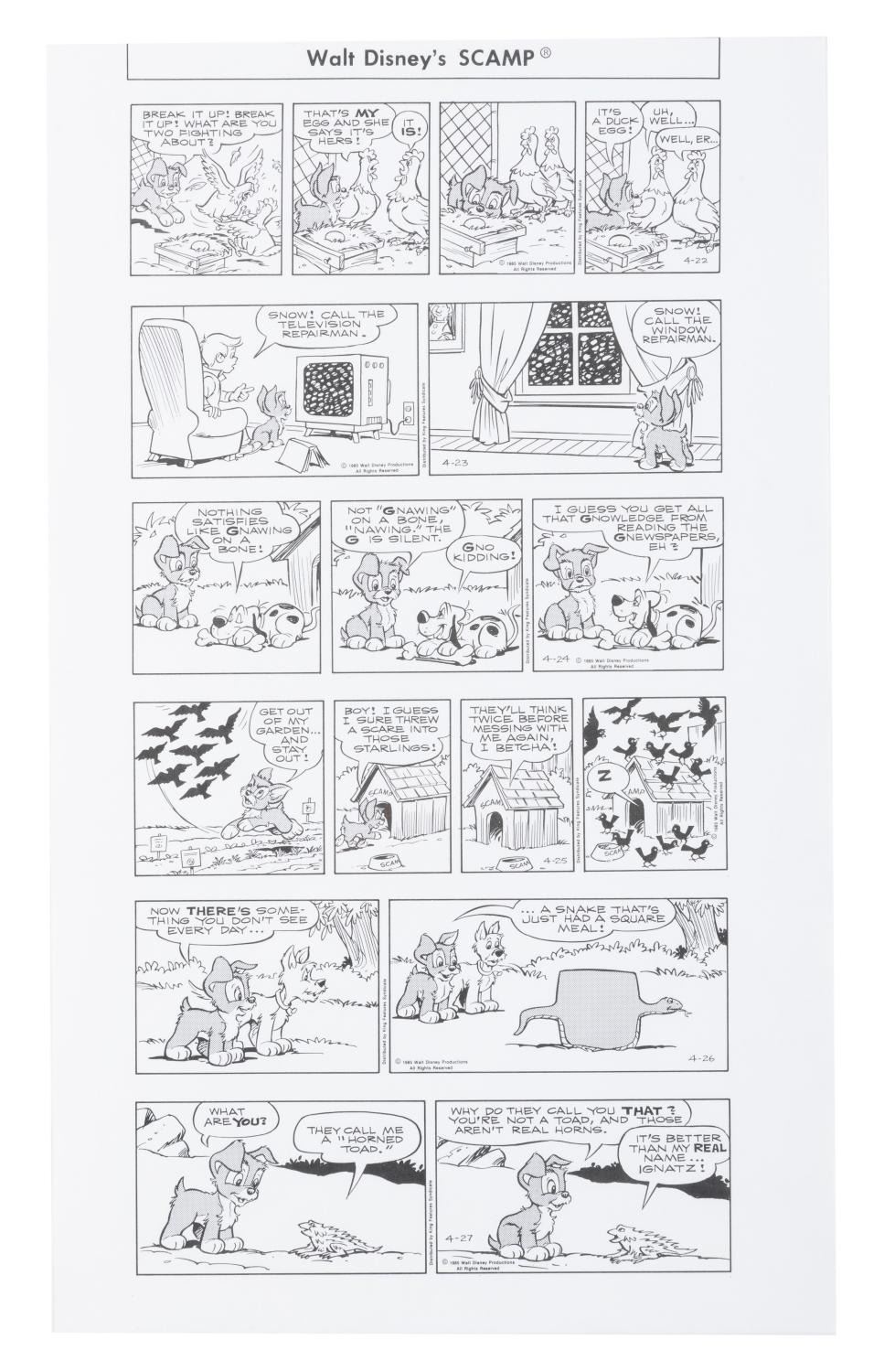 (Disney/King Features, 1984-1985) A collection of stats of "Scamp" and "Donald Duck" daily comic strips. These clean black line prints of the strips were distributed to newspapers to print their comic pages. The collection includes one week of Donald Duck strips – six daily and one Sunday strip – and a full 45 weeks of Scamp strips including 45 Sunday strips and 270 daily strips. Measuring from 8.5" x 14" to 11" x 14", the comics are in very good condition with discoloration from age and light handling wear.