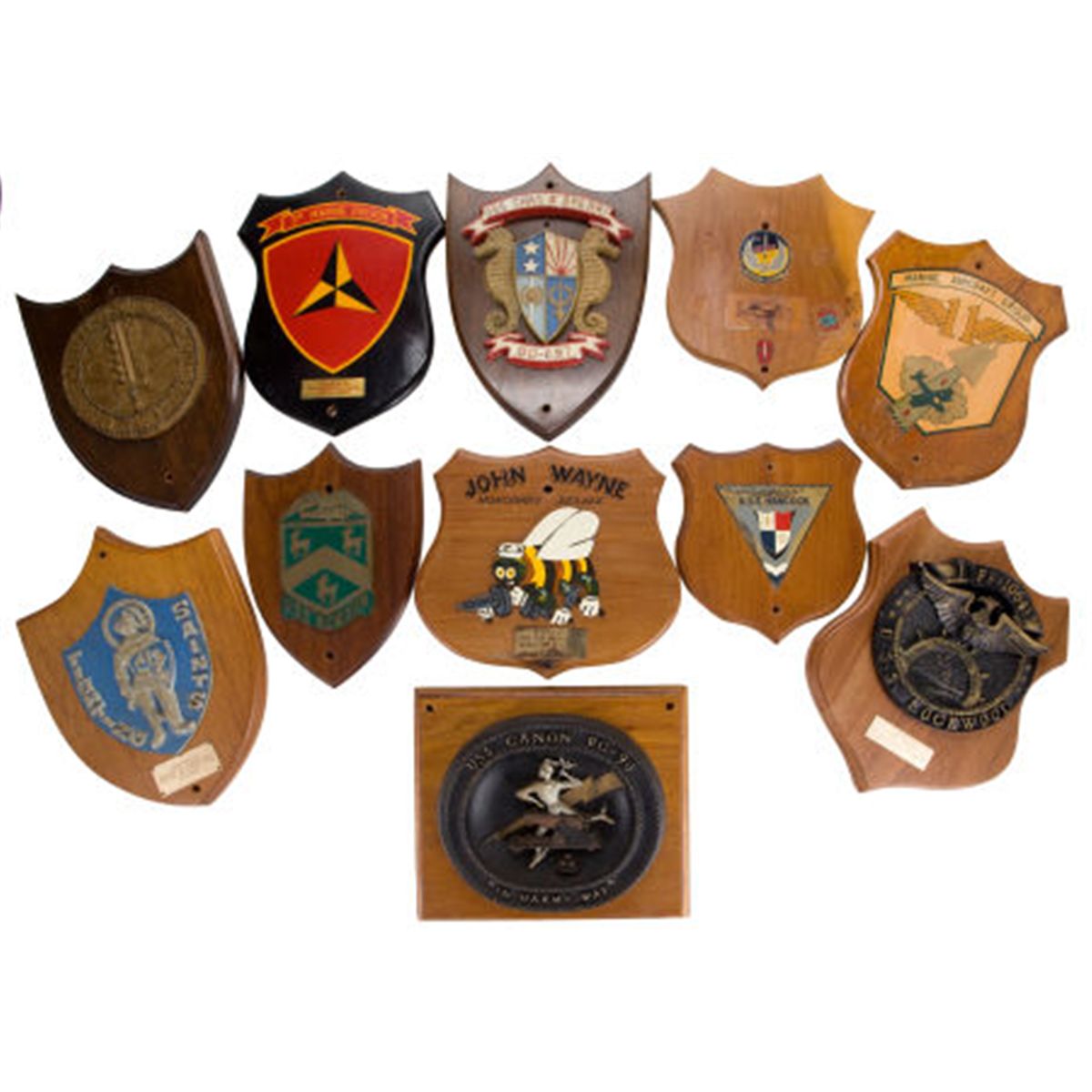 A Collection of Ship Plaques from the 'Wild Goose,' 1960s-1970s. Eleven total; all displayed aboard Wayne's yacht; including: 1) U.S.S. Samuel B. Roberts DD-823; 2) 3rd Marine Division of Danang, Vietnam; 3) USS Chas. S. Sperry DD-697; 4) The Deans Aviation Company (many adornments missing from plaque); 5) Marine Aircraft Group 11; 6) USS Saint Paul with added placard reading in part "John Wayne...Aug 1964;" 7) USS Robison DDC-12; 8) U.S.S. Hancock; 9) U.S.S. Lockwood FF-1064 with added placard reading in part "Presented to John Wayne;" 10) USS Canon PG-90 and 11) an 'Honorary Seabee' plaque reading "John Wayne / In appreciation / Chief Petty Officer's Club / Seabees 25th Anniversary / 4 March 1967;" included is the Summer 1978 issue of 'International Yachtsman' magazine showing a number of these plaques as Wayne had them displayed aboard the 'Wild Goose.'14" x 11" and smaller