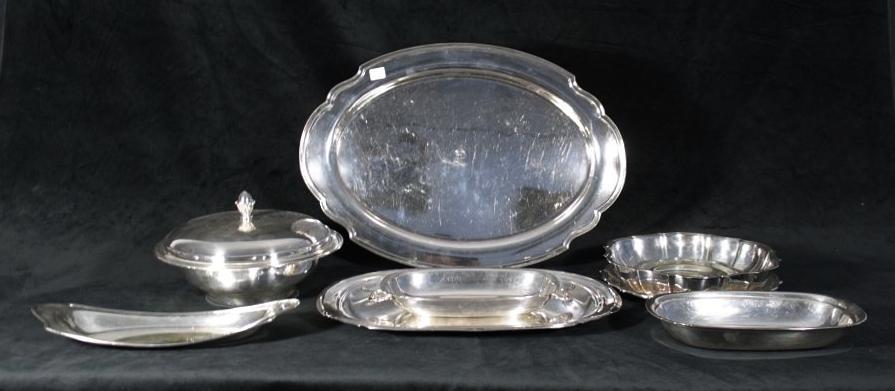 A Collection of Silver Plated Items, Including Trays, Plates, and a Covered Dish.