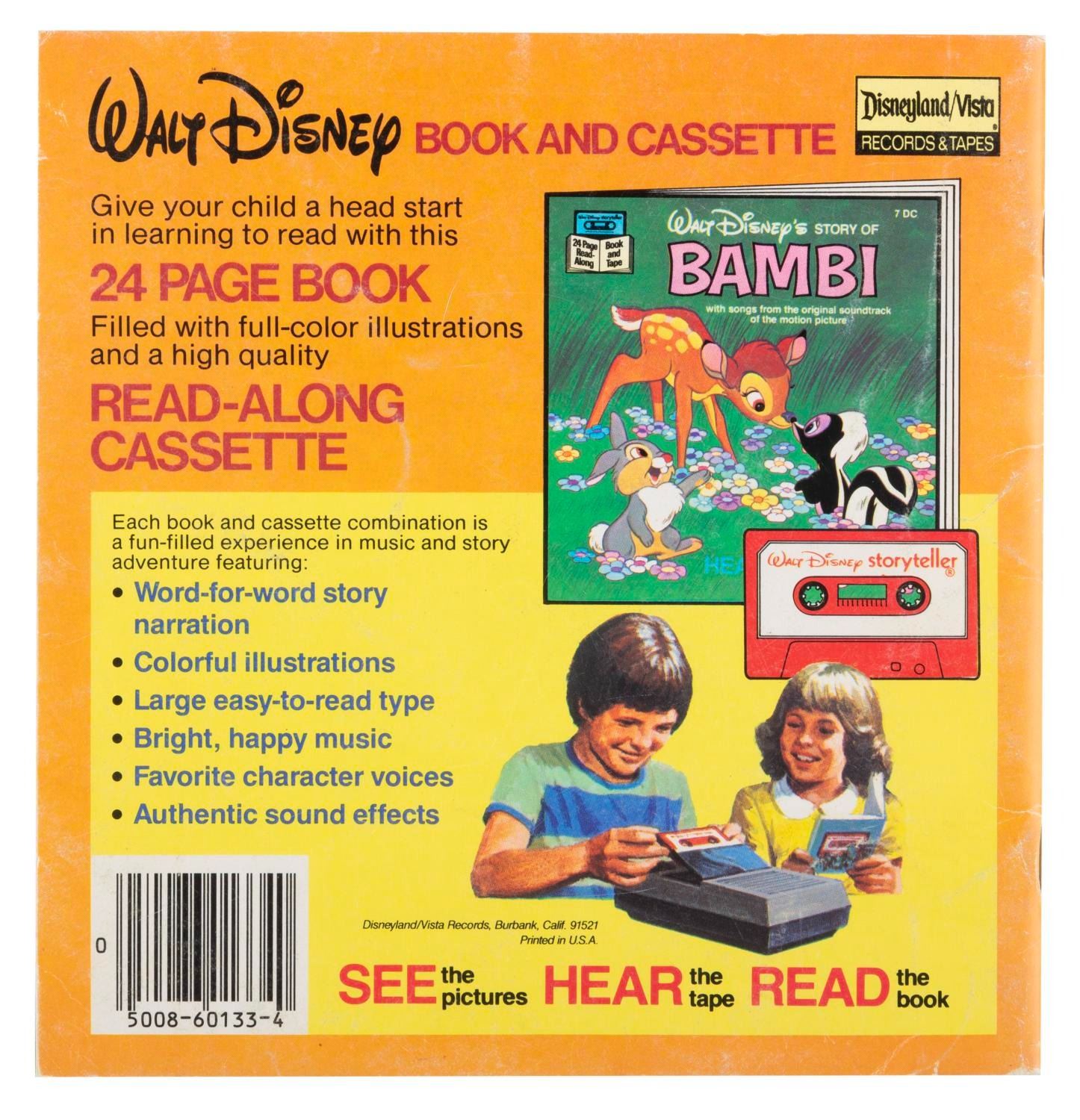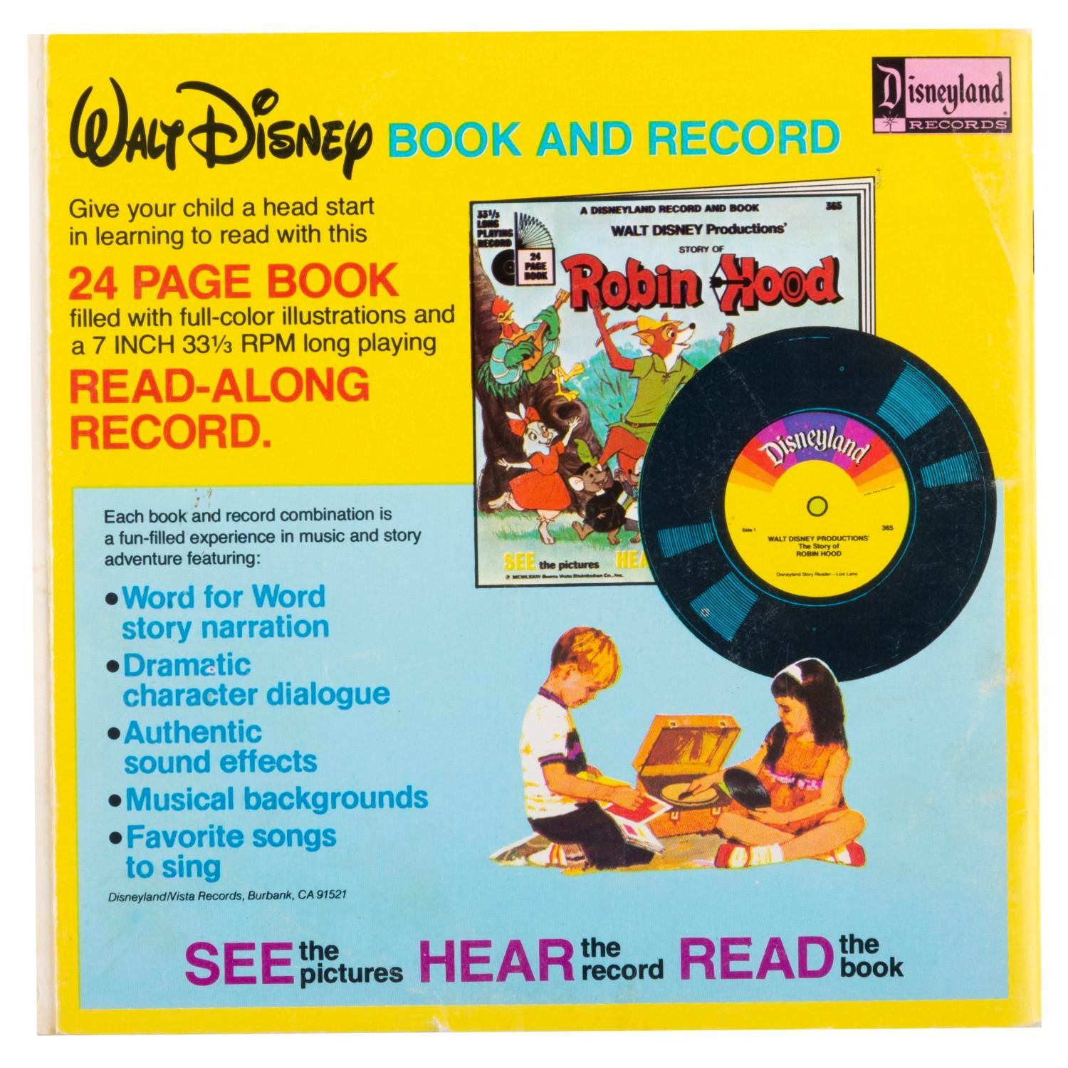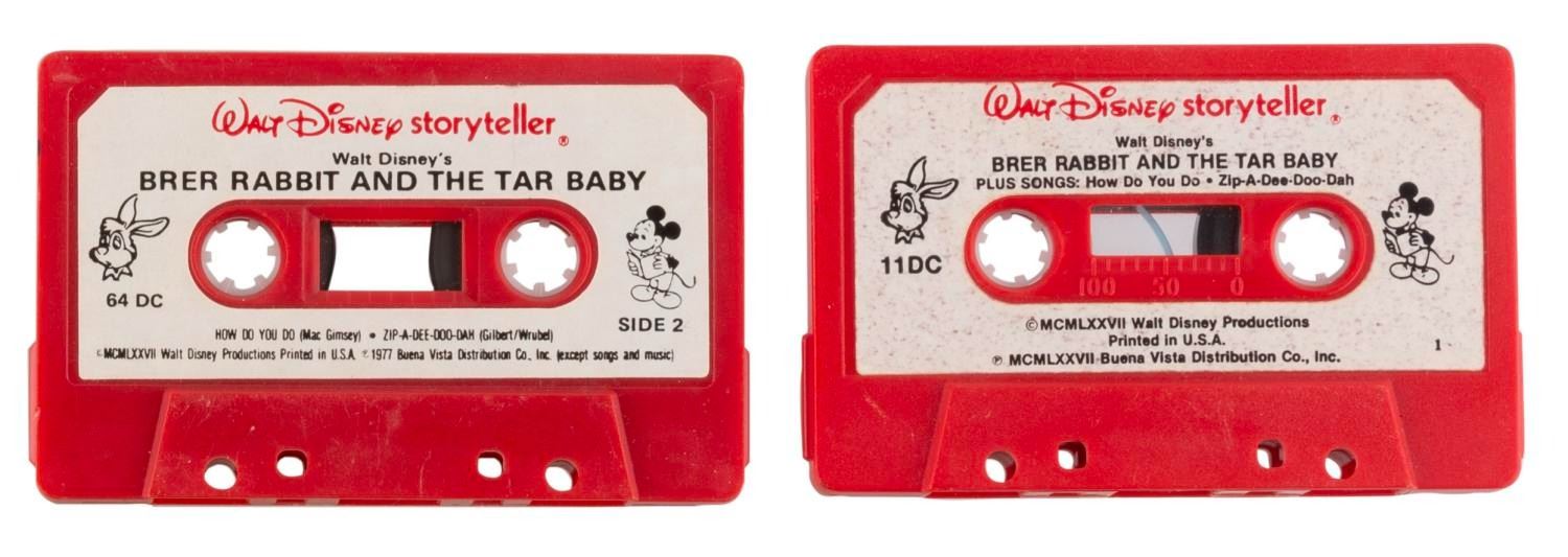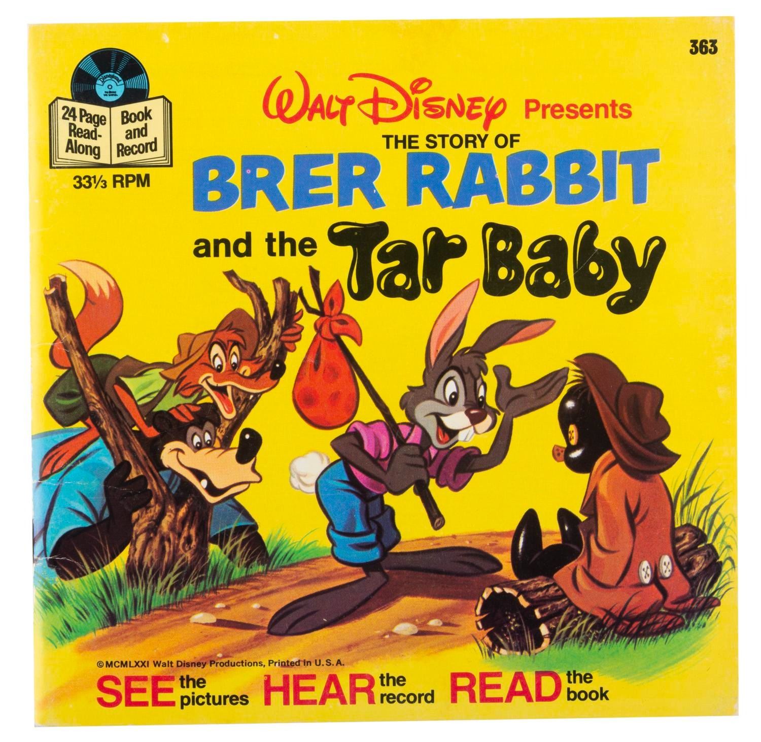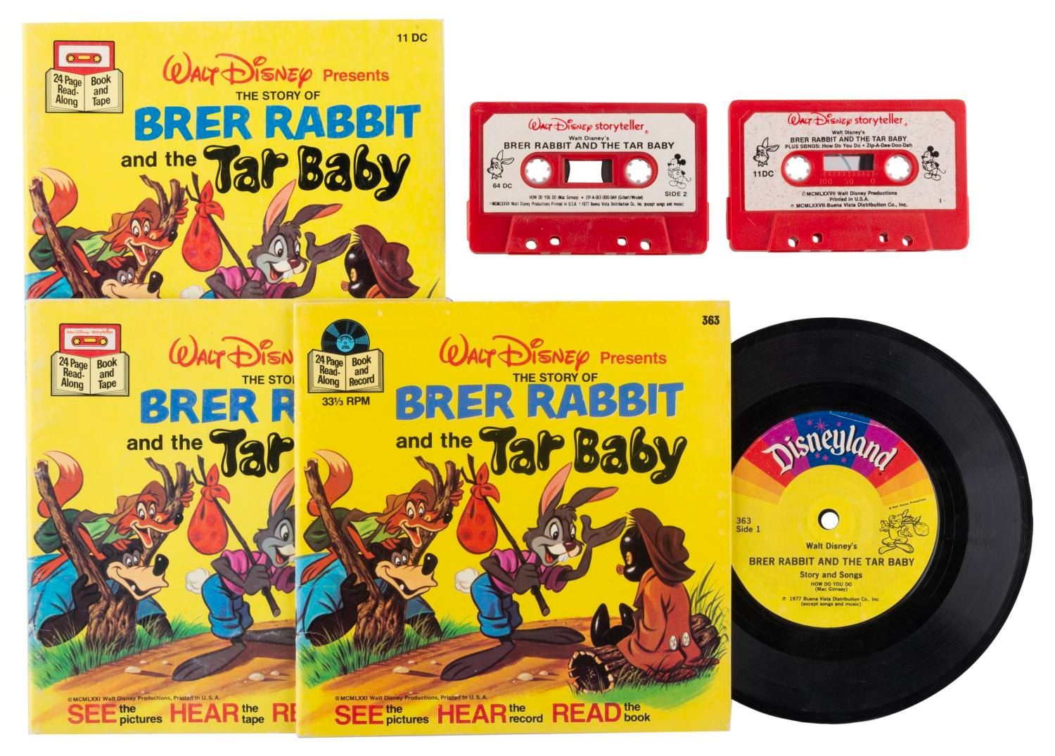 (Disney, 1977) A collection of three The Story of Brer Rabbit and the Tar Baby 24-page read-along books, two including cassettes and one including a 7” vinyl. Ranging in size from the 2.75” x 4” tapes to the 7.25” x 7.25” record, the “Song of the South” items are in good to very good condition with scratches, creases, wear, and spotting on one cassette.