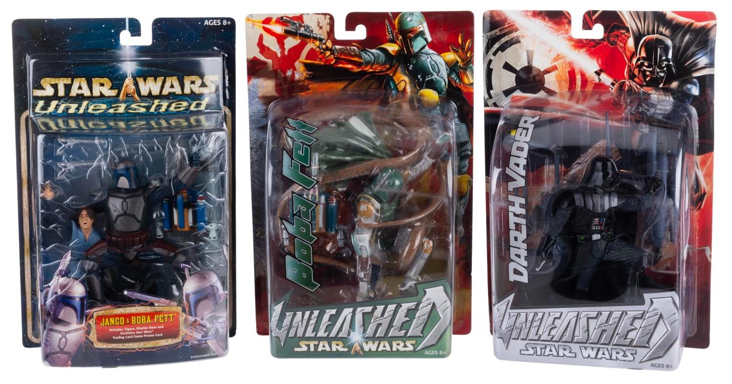 (Hasbro, 2002-2004) A collection of three unopened Star Wars Unleashed figures, including Darth Vader, Boba Fett, and Jango with a young Boba Fett. Measuring 8.75” x 3.75” x 13.75” each, the figures display in good to very good condition with wear and creasing to the backing cards.