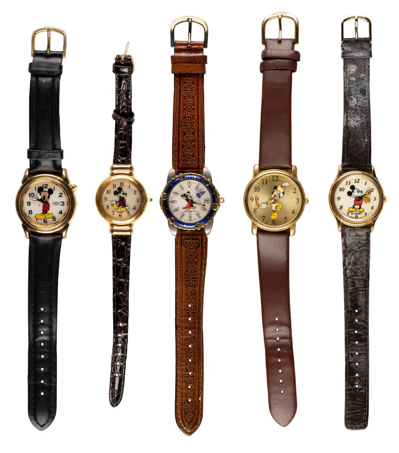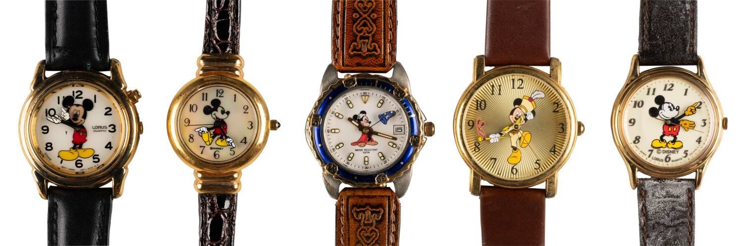 (Disney, 1990s-2000s) A collection of five Mickey Mouse steel back watches. The watches did not work when tested, requiring repair to function properly. Ranging in size from 8” to 9” long, the watches are in fair to very good condition with surface scratches, scuffs, creases, and wear, notably on one band.