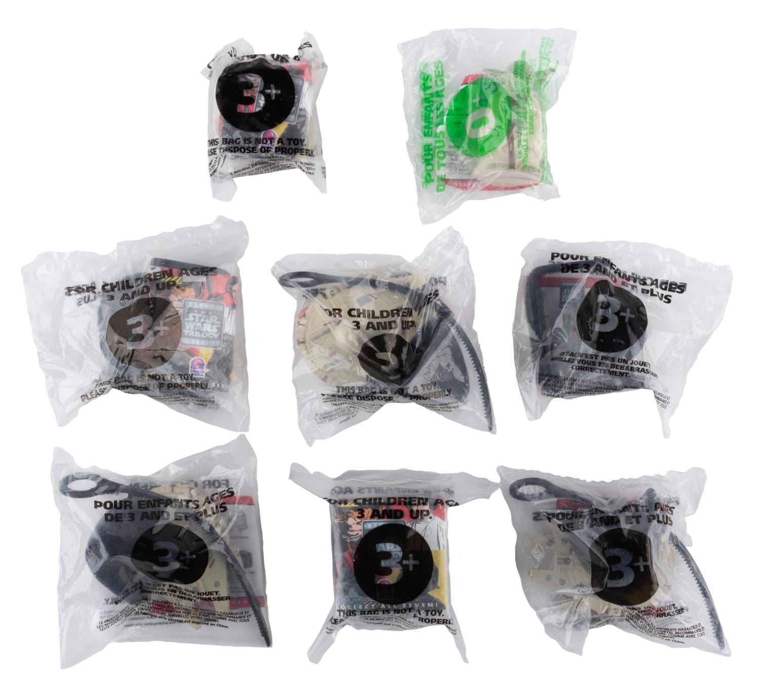 (Taco Bell, 1990s) A collection of eight Star Wars Special Edition toys by Taco Bell, sealed in the original bags. Included are three Millennium Falcon Gyros, two Floating Cloud City toys, one puzzle cube, one Vader Magic Cube, and one vinyl figure of Yoda. The toys are in fine condition, sealed in their original bags.