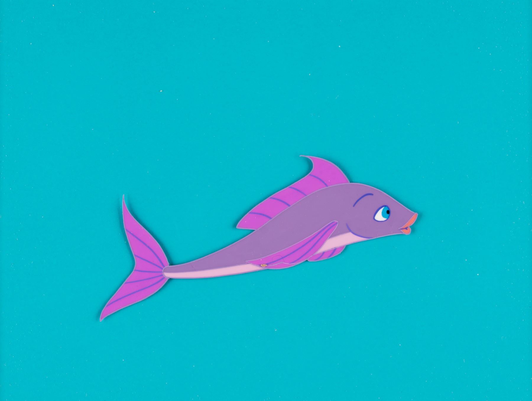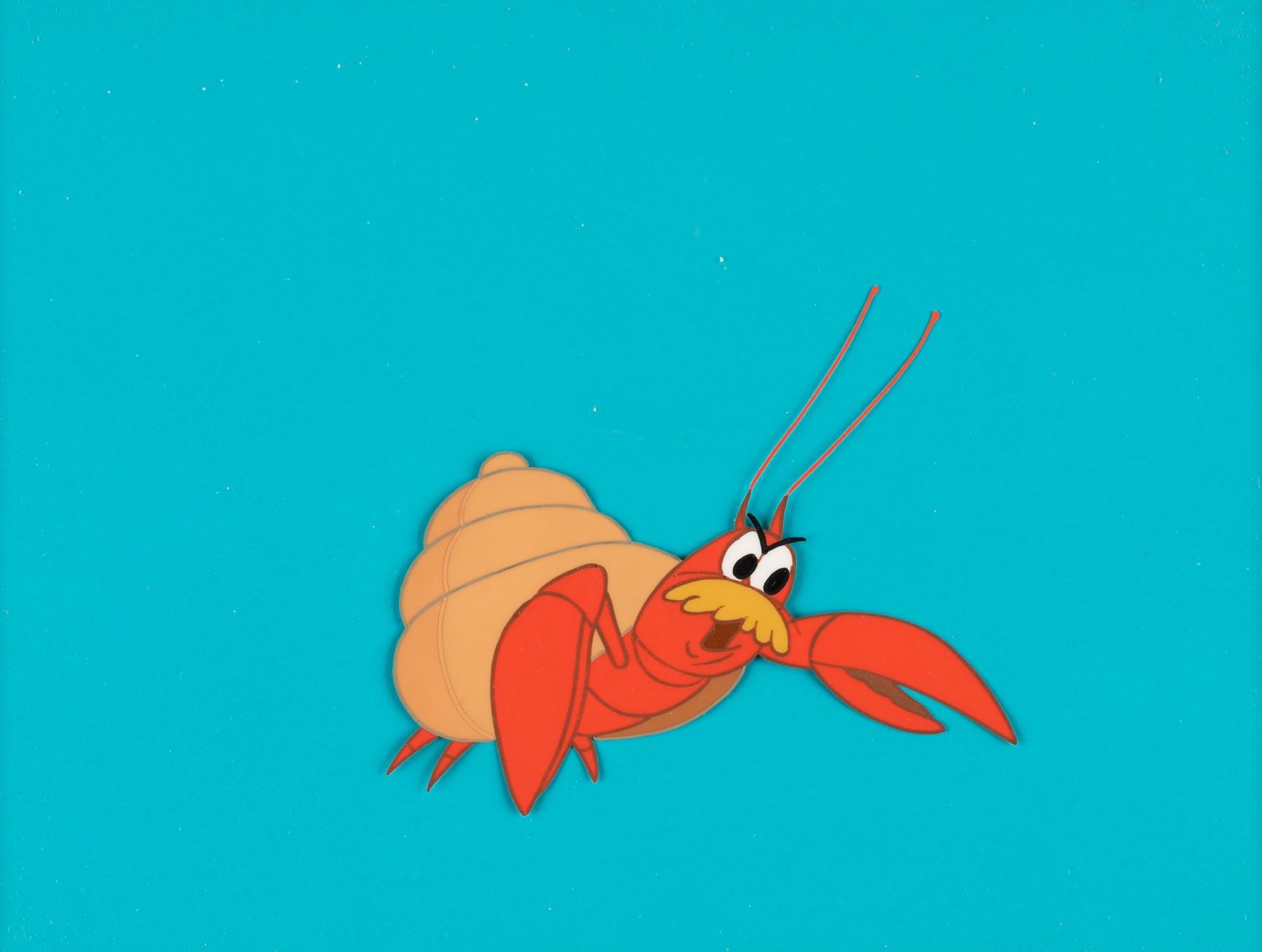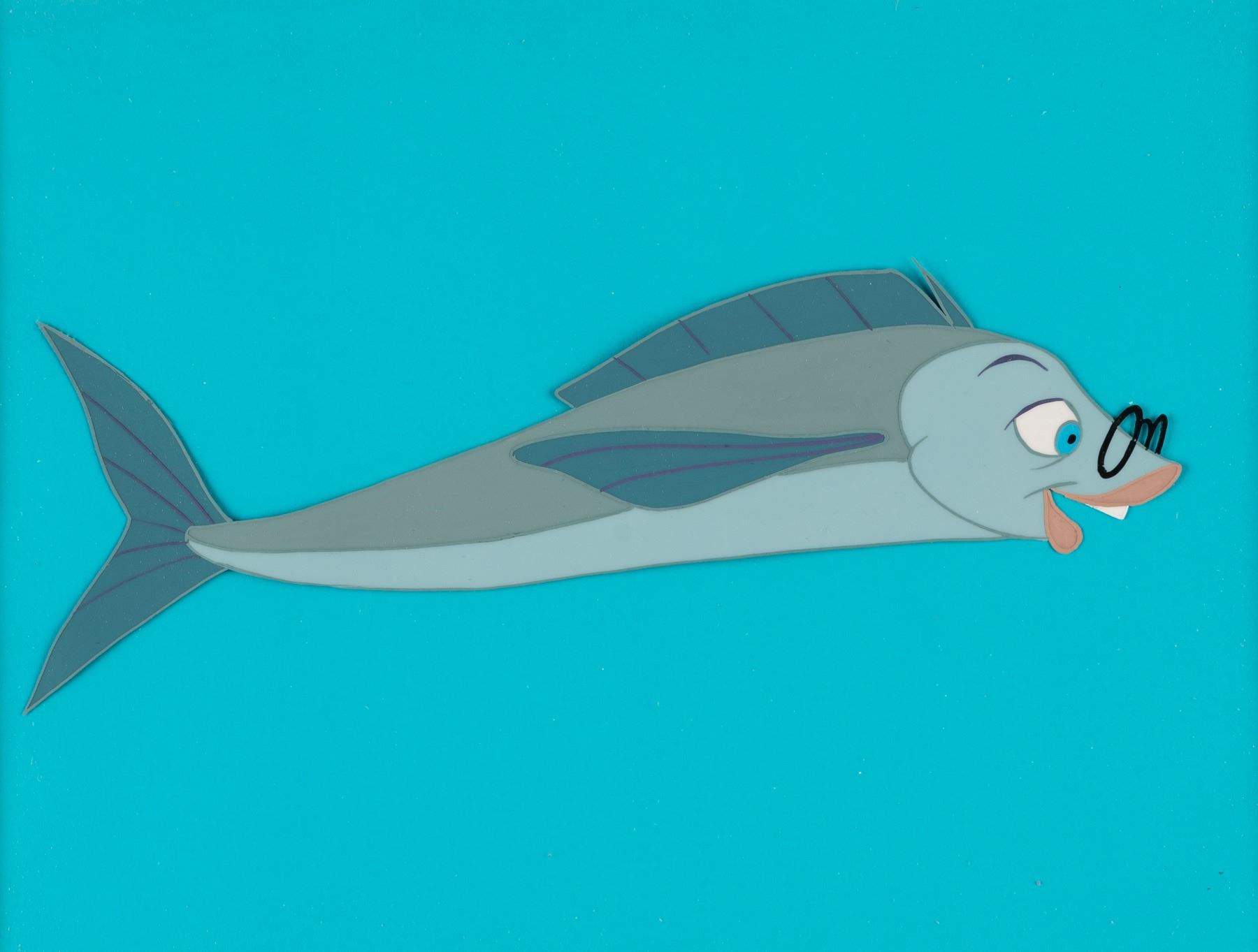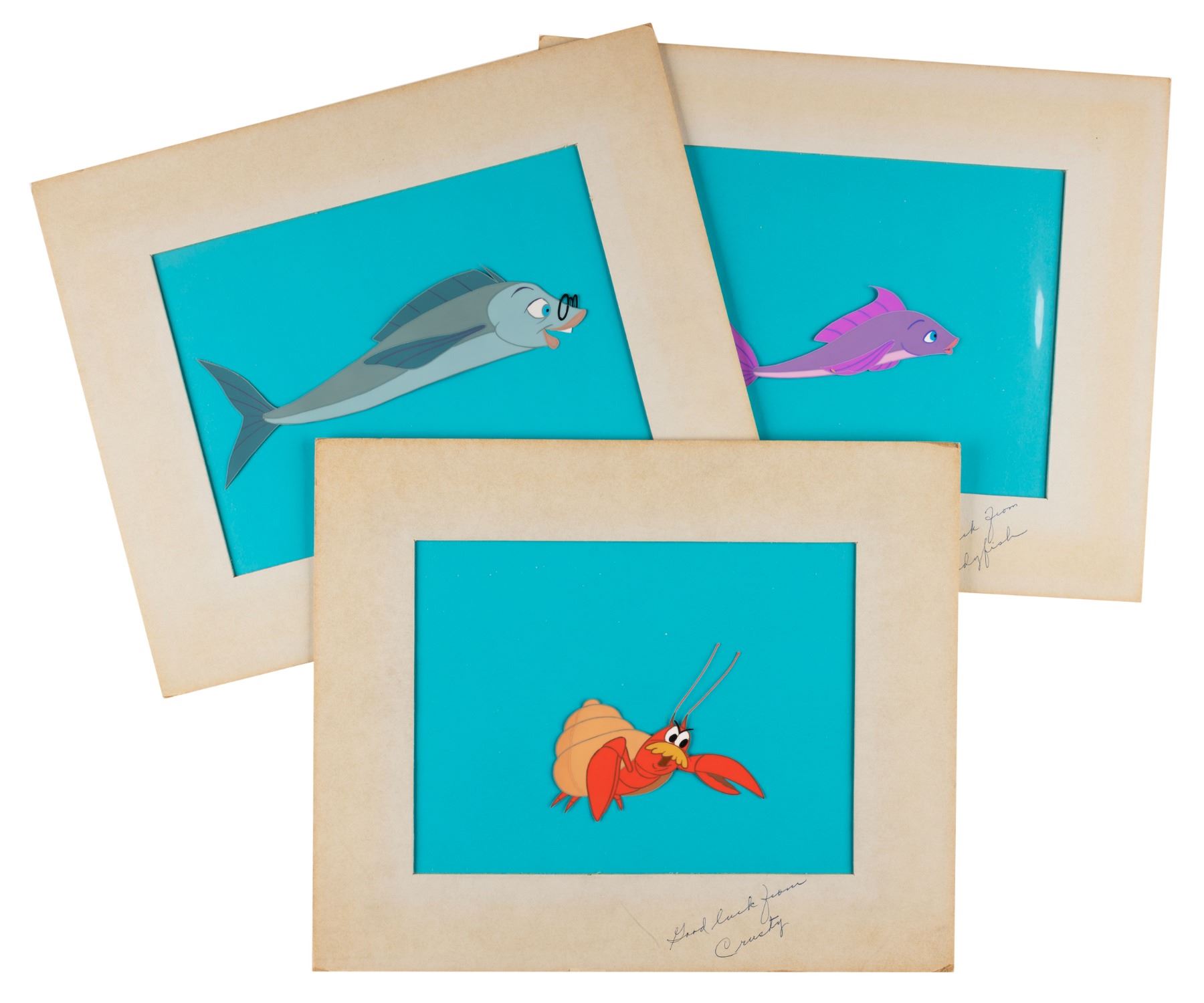 (Warner Bros., 1964) A collection of three production cels from the feature film “The Incredible Mr. Limpet.” Included are images of Mr. Limpet, Crusty, and Ladyfish, each appearing on one of the three cels. With image sizes ranging from 3.5” x 4.25” to 2.5” x 7.5” on a 6.25” x 8.5” visible cel, all three pieces are in fine condition. Each cel is presented in a matte measuring 10” x 12”, with a faux signature accomplished in blue pen along the bottom, and display in very good condition with light discoloration from age and edge wear from framing.
