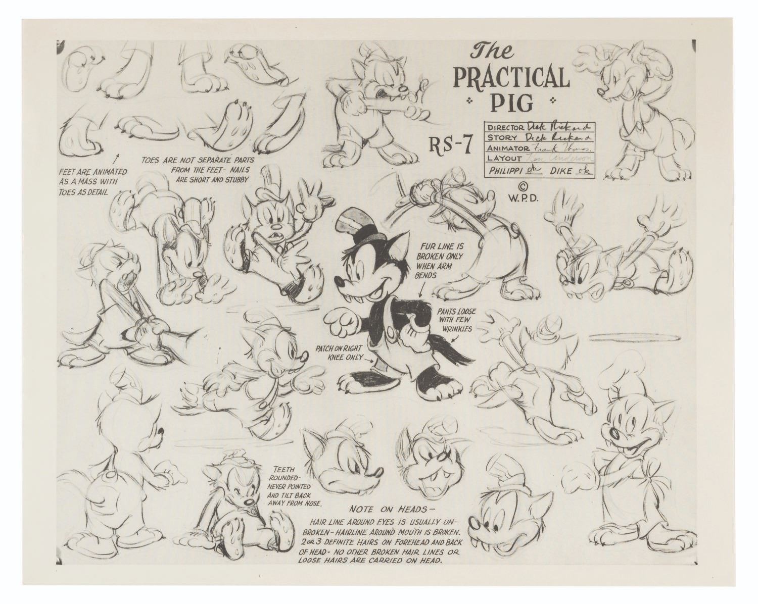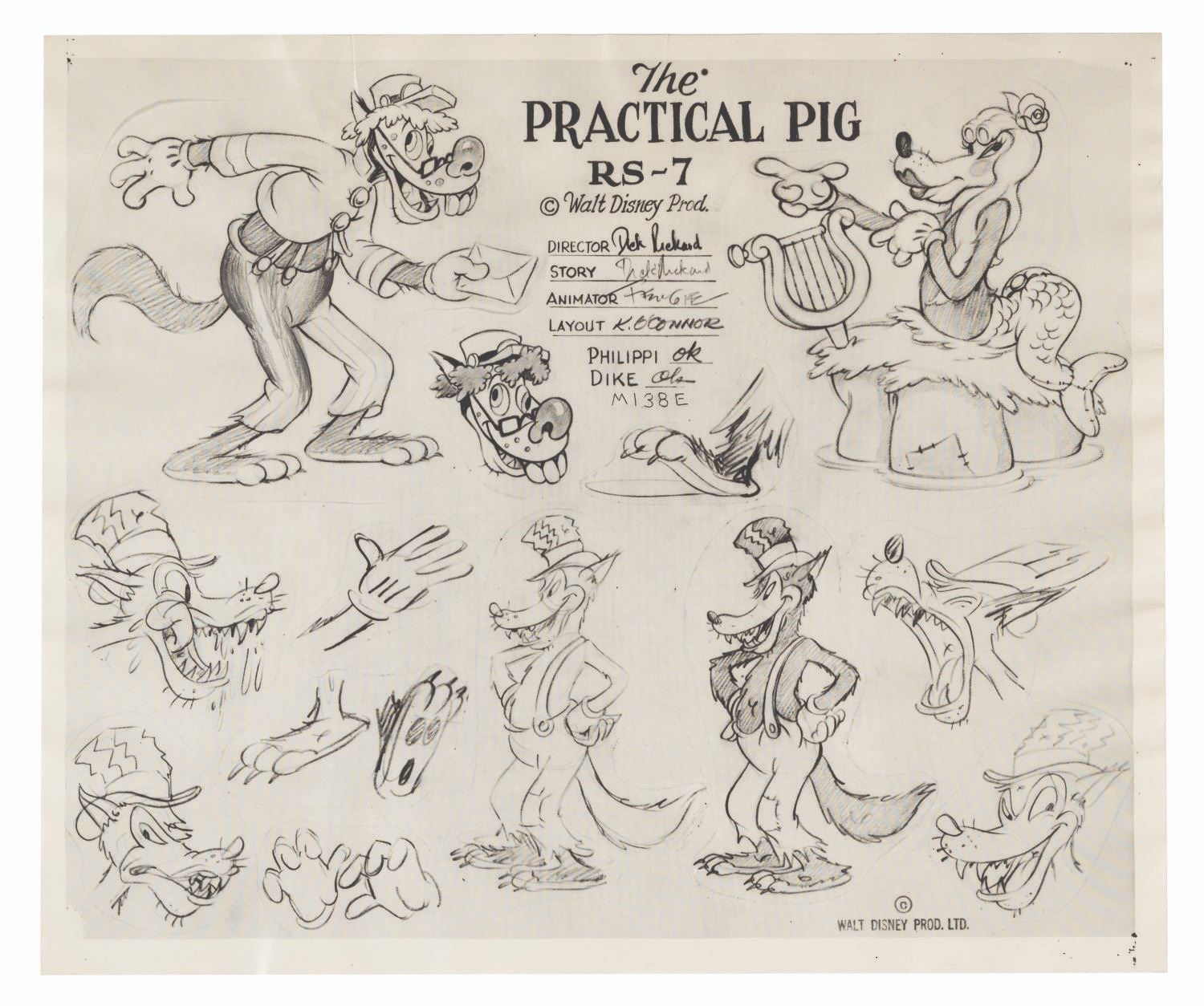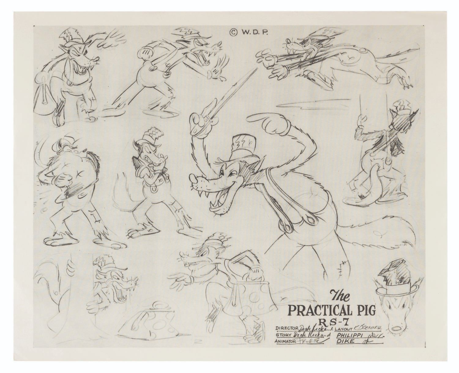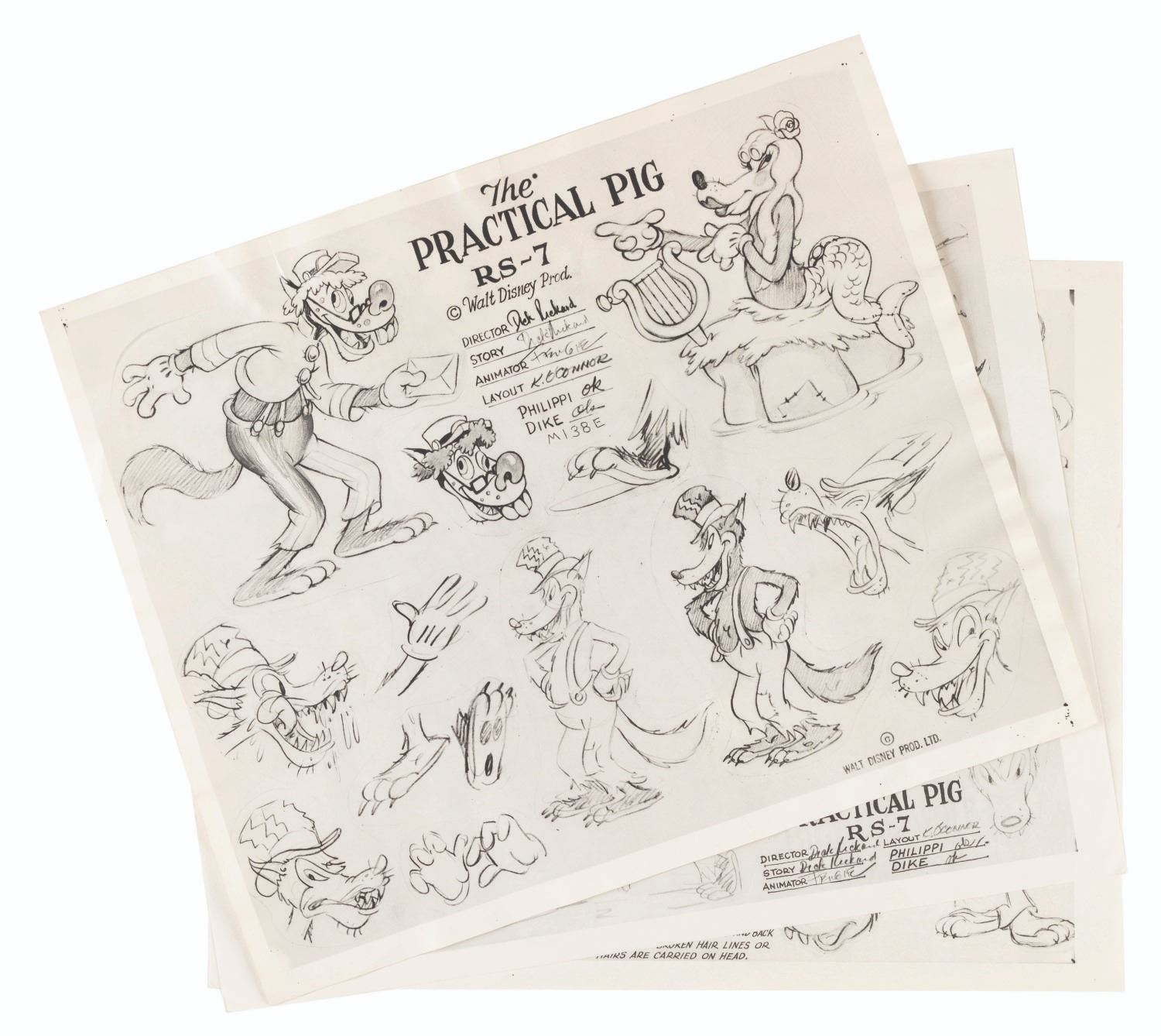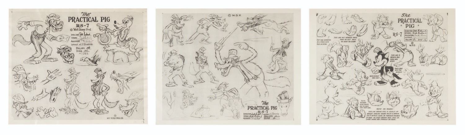 (Disney, 1939/1970s-1980s) Three photostat model sheets, one original and two later-produced copies, of the Big Bad Wolf and the Three Little Wolves from the Silly Symphony short “The Practical Pig.” Model sheets such as these were distributed to animators and crew working on the film to ensure character design continuity. Measuring 10” x 12”, the model sheets are in very good condition with light creases and warping.