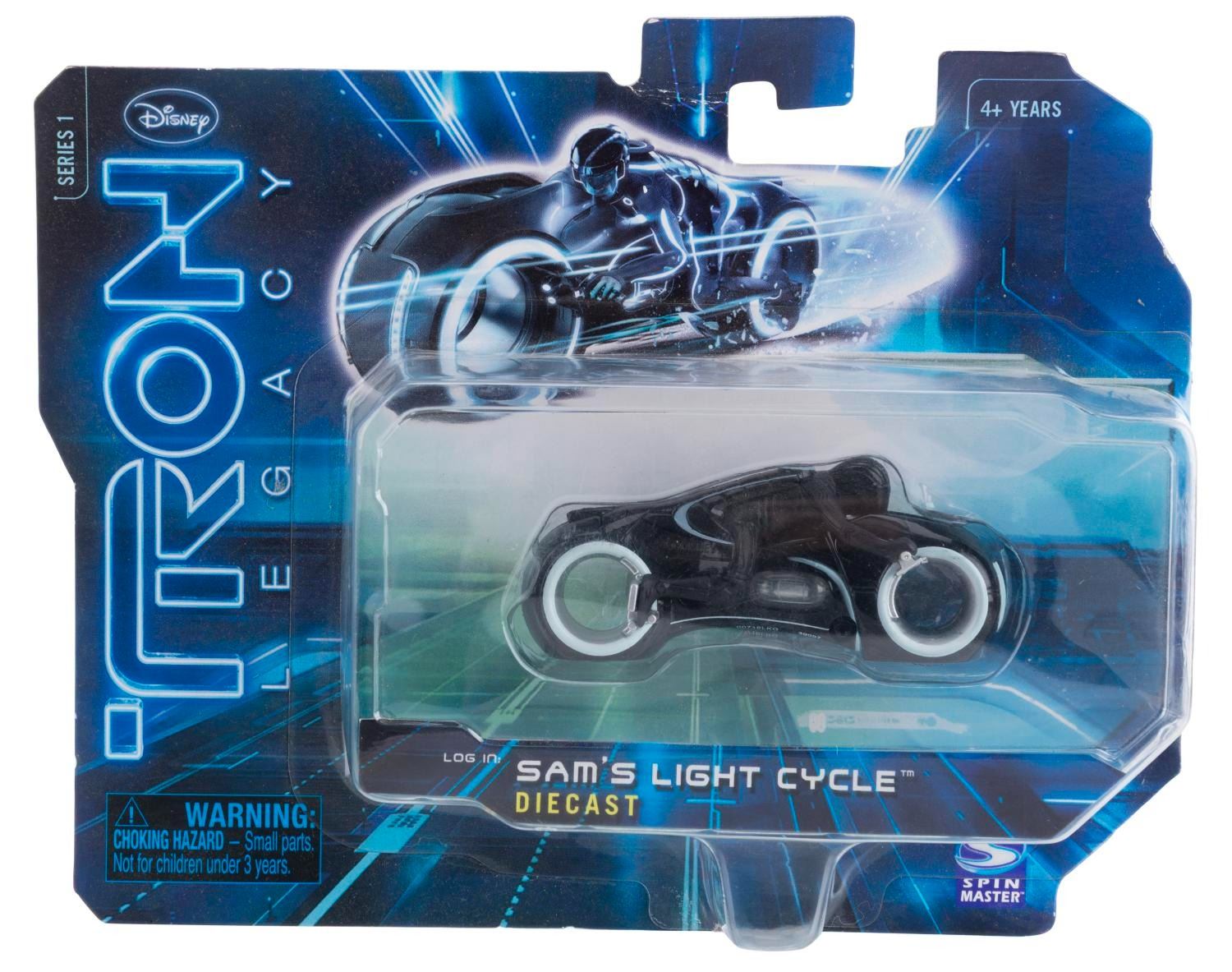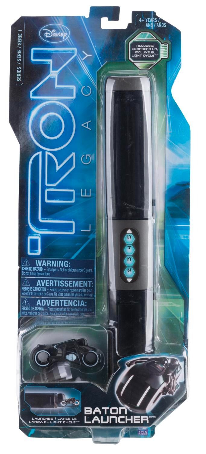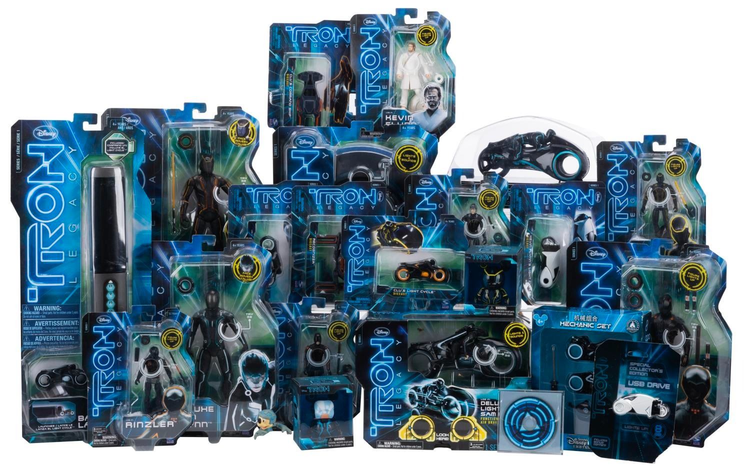 (Disney, 2010) A 22-piece collection of"Tron Legacy" toys and figures. Included are five die-cast vehicles, three deluxe and five standard character figures, two Vinylmation figures, a Sam Flynn Deluxe Identity Disk and Deluxe Light Cycle, a baton Light Cycle launcher, a Shanghai Disneyland mechanic set, a USB drive, a Tron 2.0 mini-CD, and a Tron Evolution Collector's Edition video game lucite display case with Light Cycle (game not included). The character figures, Flynn Light Cycle and Flynn Identity Disk, have light-up features that have been tested and do not work. Measuring 3.75" x 3.75" to 7" x 11" x 5.25" tall, the collection is in very good, unused condition with very light age-related wear.