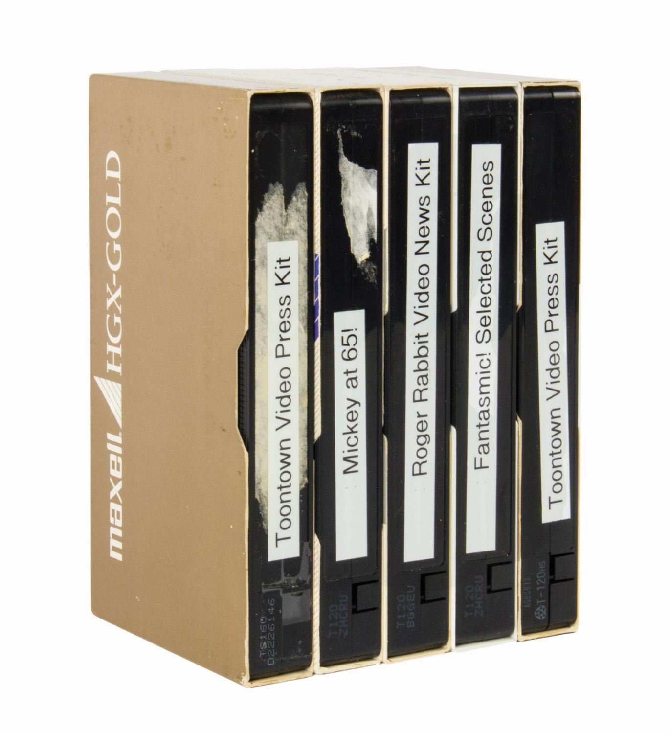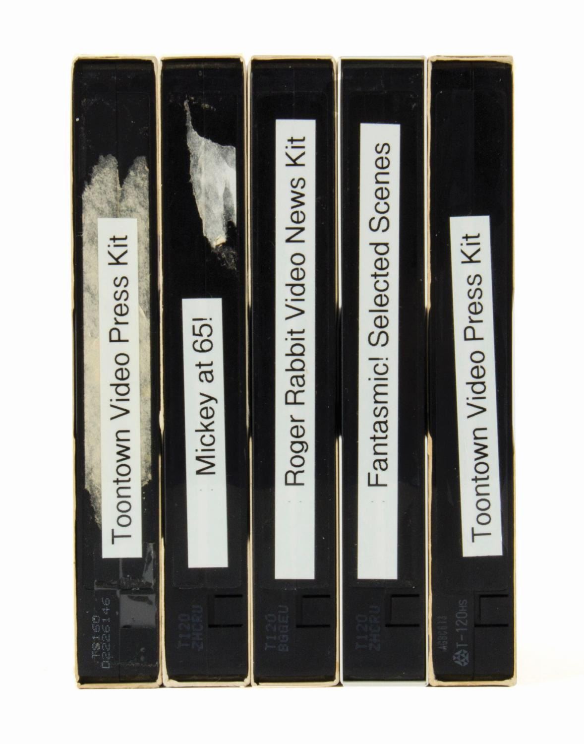 (Disneyland, 1998) A collection of (5) Disneyland press kit VHS videotapes, labeled "Fantasmic! Selected Scenes," "Mickey at 65!", "Roger Rabbit Video News Kit," and (2) tapes labeled "Toontown Video Press Kit." Press tapes contained promotional videos and information on new attractions, entertainment, lands, or special events at the Parks. The tapes have not been tested for functionality or content, but appear to be in very good condition with minor wear.
