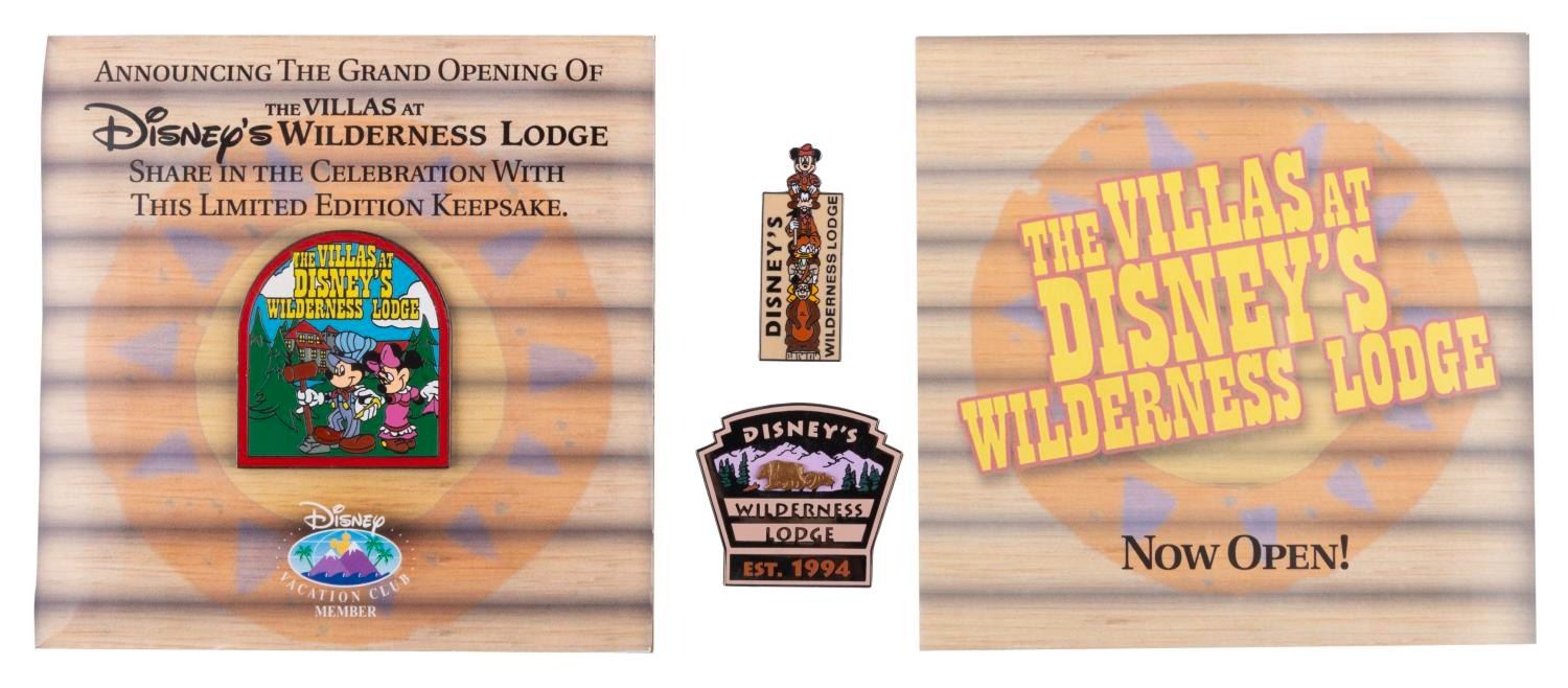 (Walt Disney World, 1990s-2001) A collection of three Wilderness Lodge pins, including a gift pin for the Villas at Wilderness Lodge that was sent to Disney Vacation Club members. The pins are in very good condition.