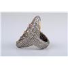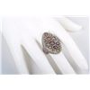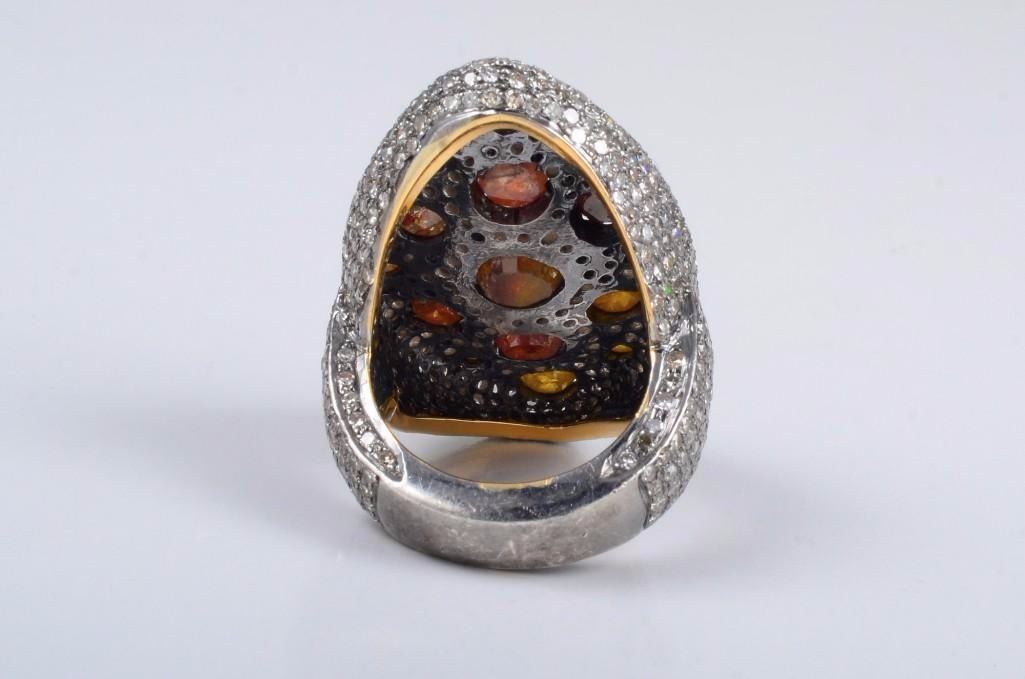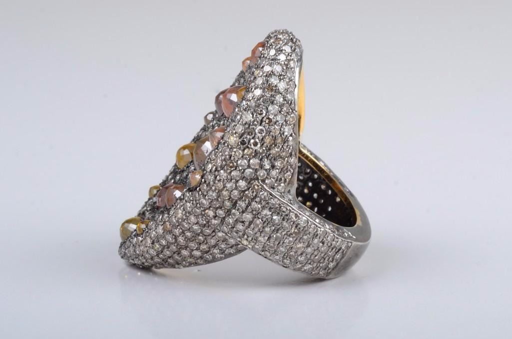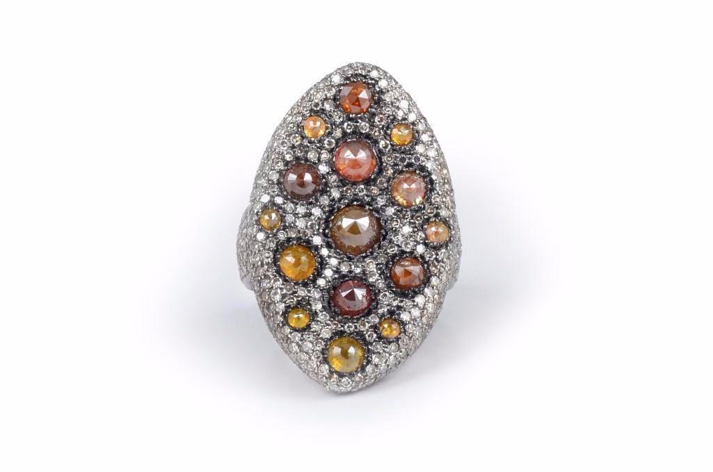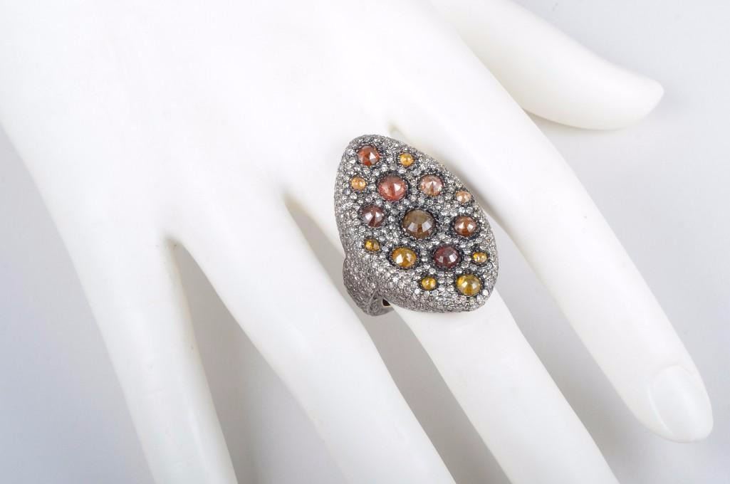 Designed as a colored diamond cluster ring, with 15 high-dome faceted colored diamonds, weighing approximately 2.3 carats, and numerous single-cut diamonds weighing approximately 3 carats; ring size 6-3/4; measures 1-3/8 x 7/8 inches; weight 13.8g.