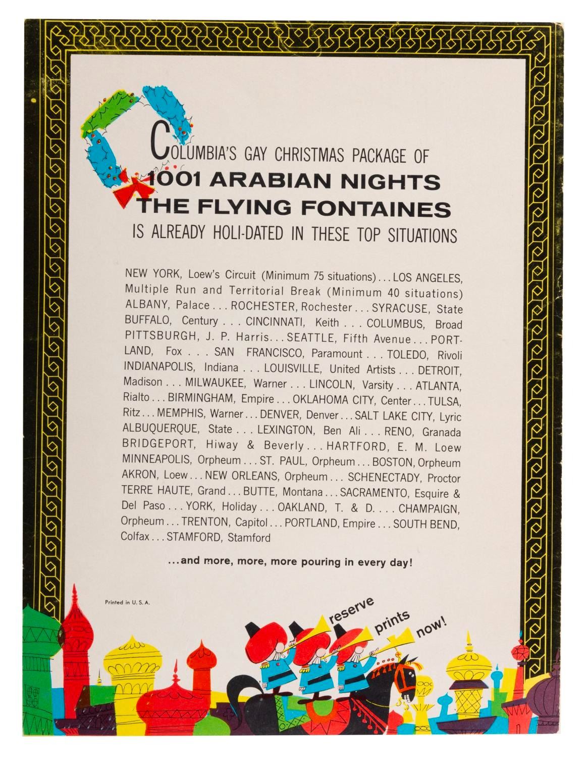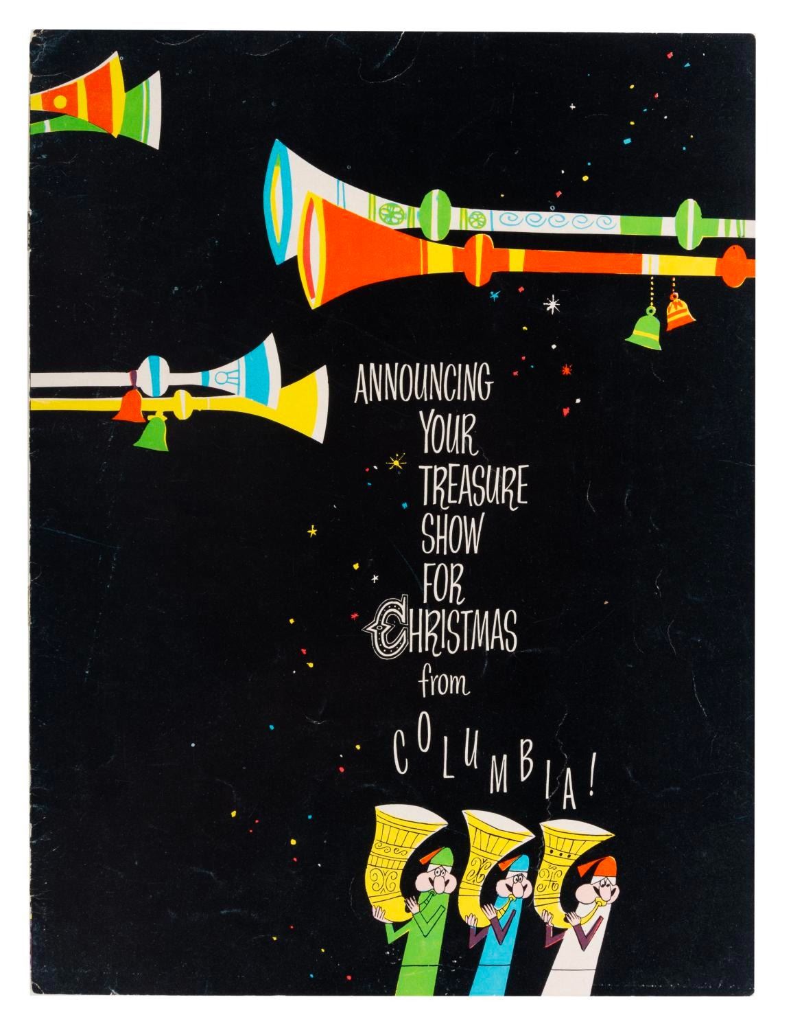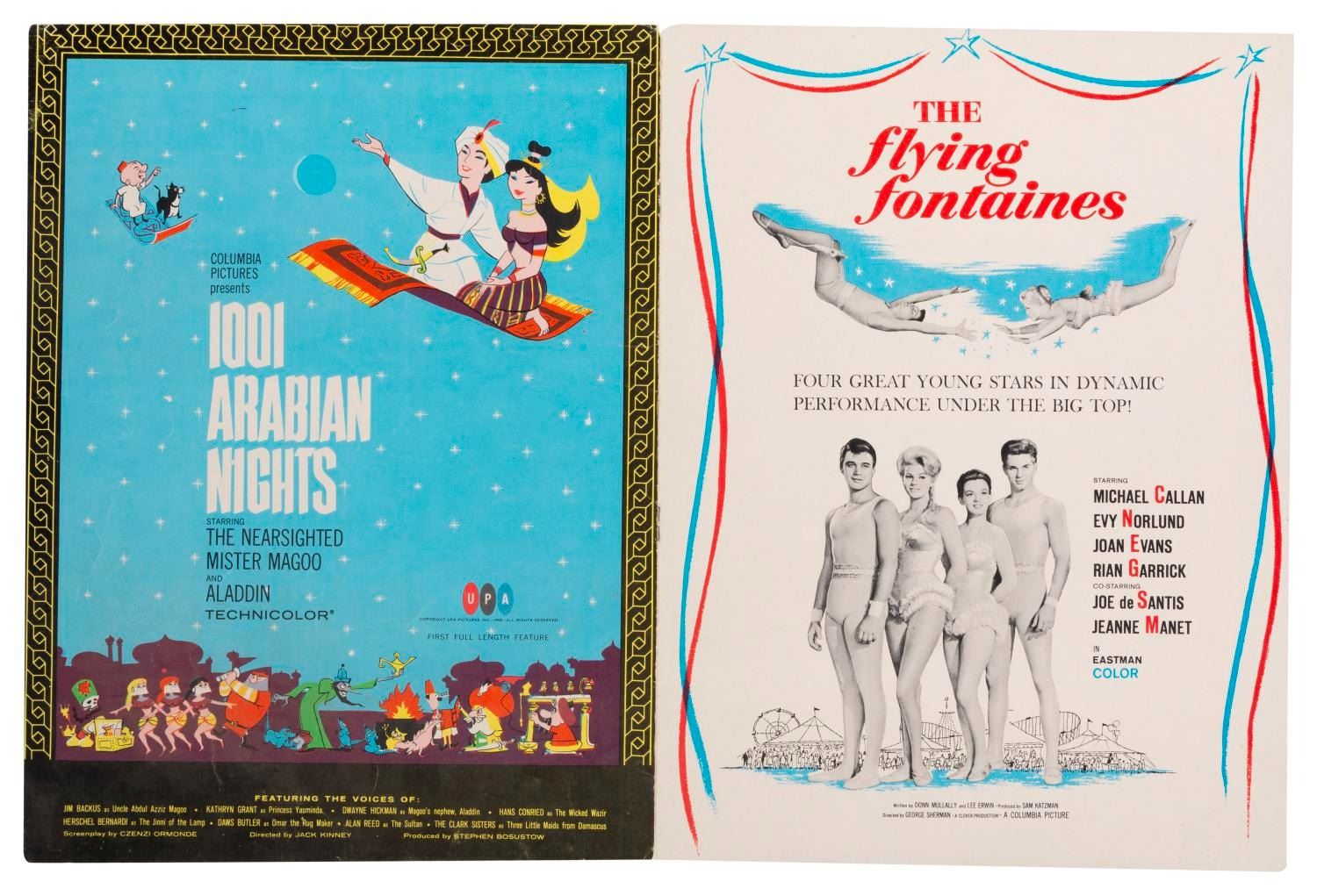 (Columbia, 1959) The cover of a Columbia Pictures Christmas 1959 program. The front features terrific mid-century holiday art, with the inside displaying two small posters for "1001 Arabian Nights" starring Mister Magoo, and "The Flying Fontaines." The missing pages likely included ad layouts for these titles. Measuring 9" x 12", the cover displays in good condition with edge wear and handling wear, including small creases, and a 1" piece of tape on the front. (Columbia, 1959) The cover of a Columbia Pictures Christmas 1959 program. The front features terrific mid-century holiday art, with the inside displaying two small posters for "1001 Arabian Nights" starring Mister Magoo, and "The Flying Fontaines." The missing pages likely included ad layouts for these titles. Measuring 9" x 12", the cover displays in good condition with edge wear and handling wear, including small creases, and a 1" piece of tape on the front.