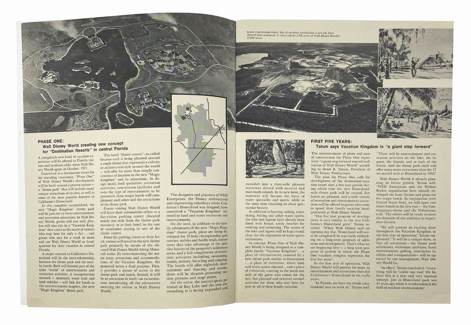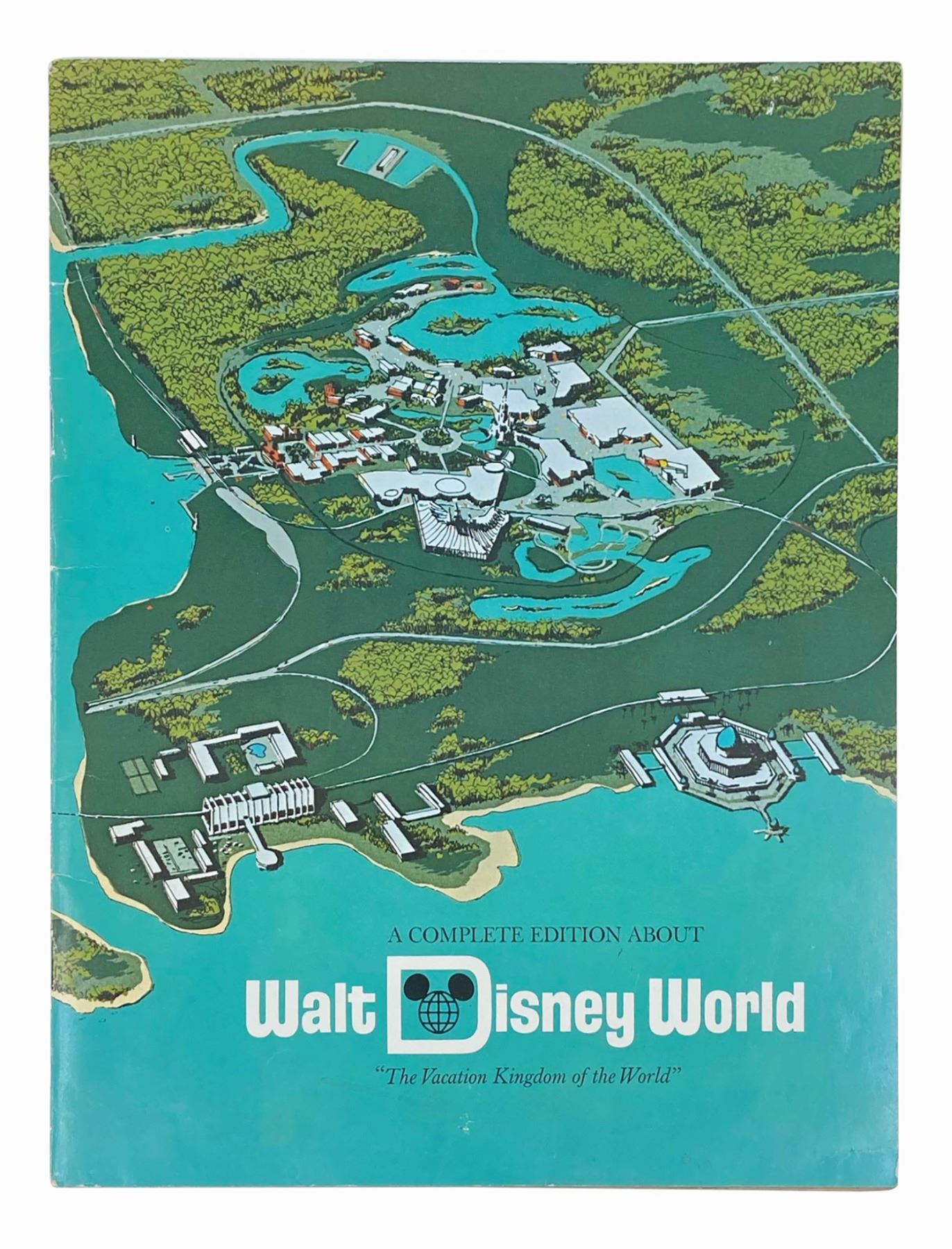 (Walt Disney World, 1969) A very early booklet discussing the coming attractions, entertainment, hotels, and other information relating to the opening of Walt Disney World. This booklet primarily includes concept art rather than photos, since the opening of the park was still two years away, but also includes great behind the scenes photos of Imagineers working on the coming attractions. This 26-page booklet measures 11"x8.5" and is in good condition with some edge wear. There is creasing along the spine, as well as spots of surface wear to the front cover.