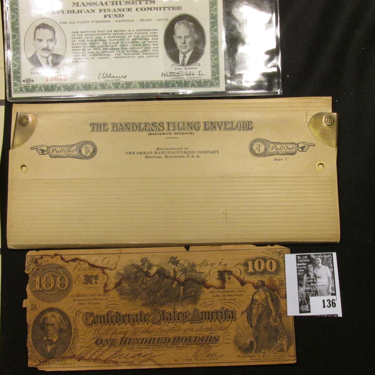 "A Complete Family of New Holland Grassland Machines" brochure; "The Bandless Filing Envelope"; $100 Confederate States of America replica; & a 1948 Massachusetts Republican Finance Committee Fund Certificate with Thomas Dewey and Earl Warren's photo.