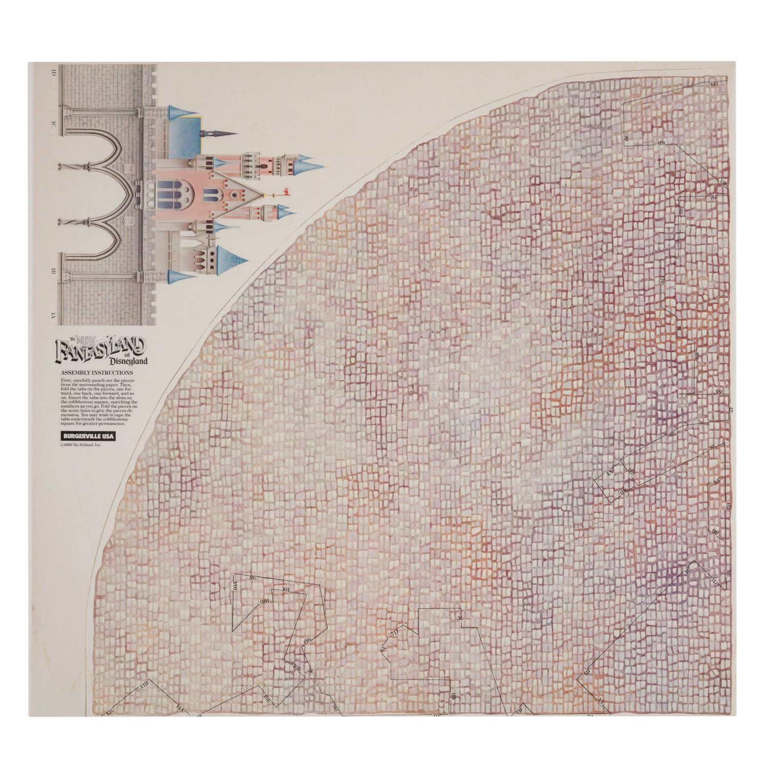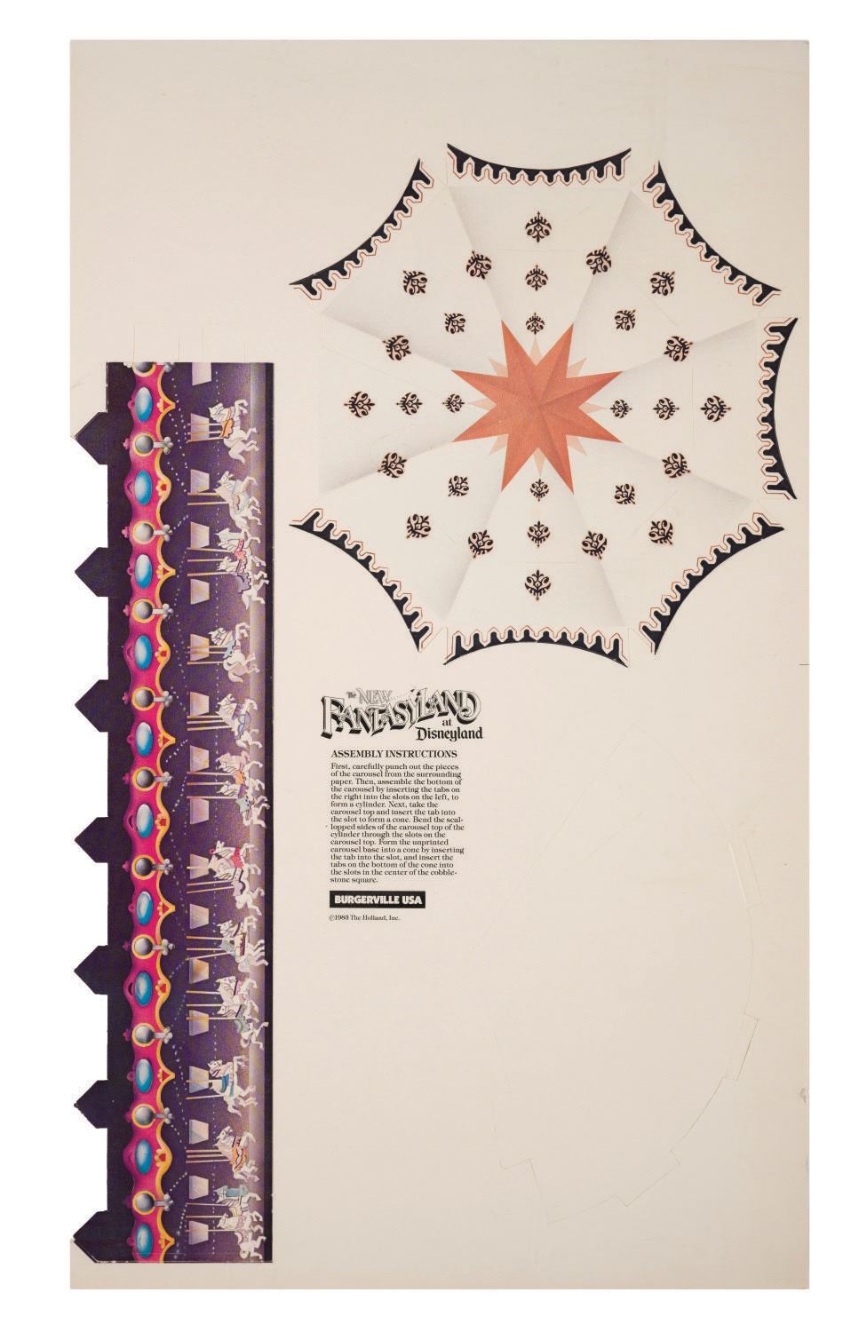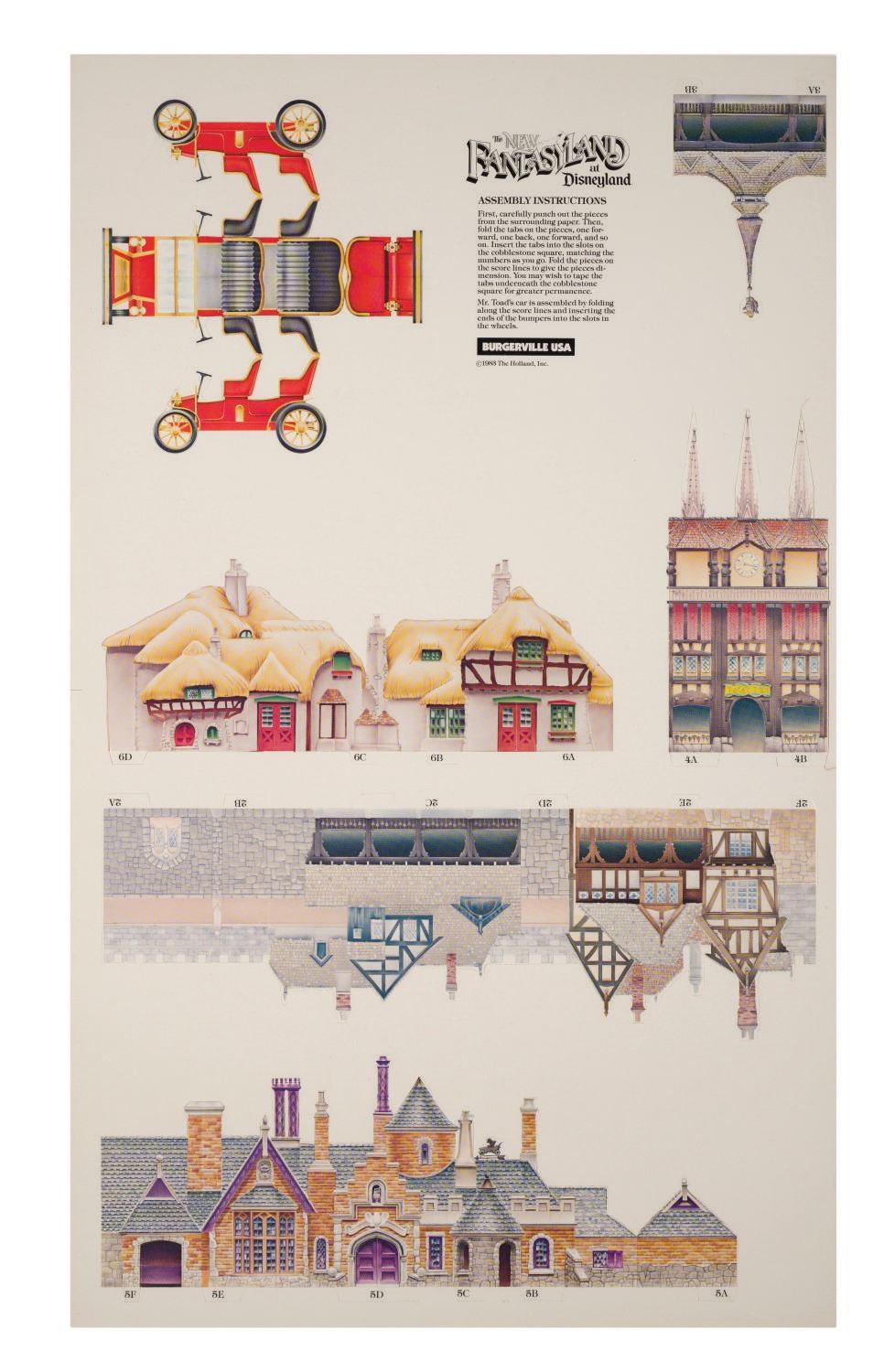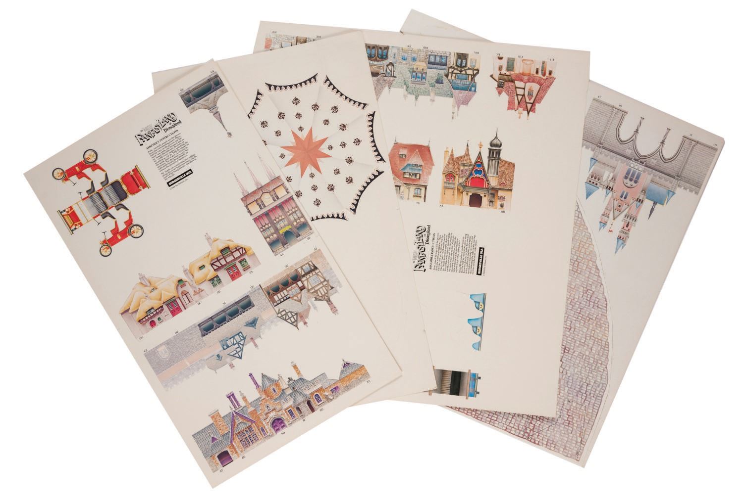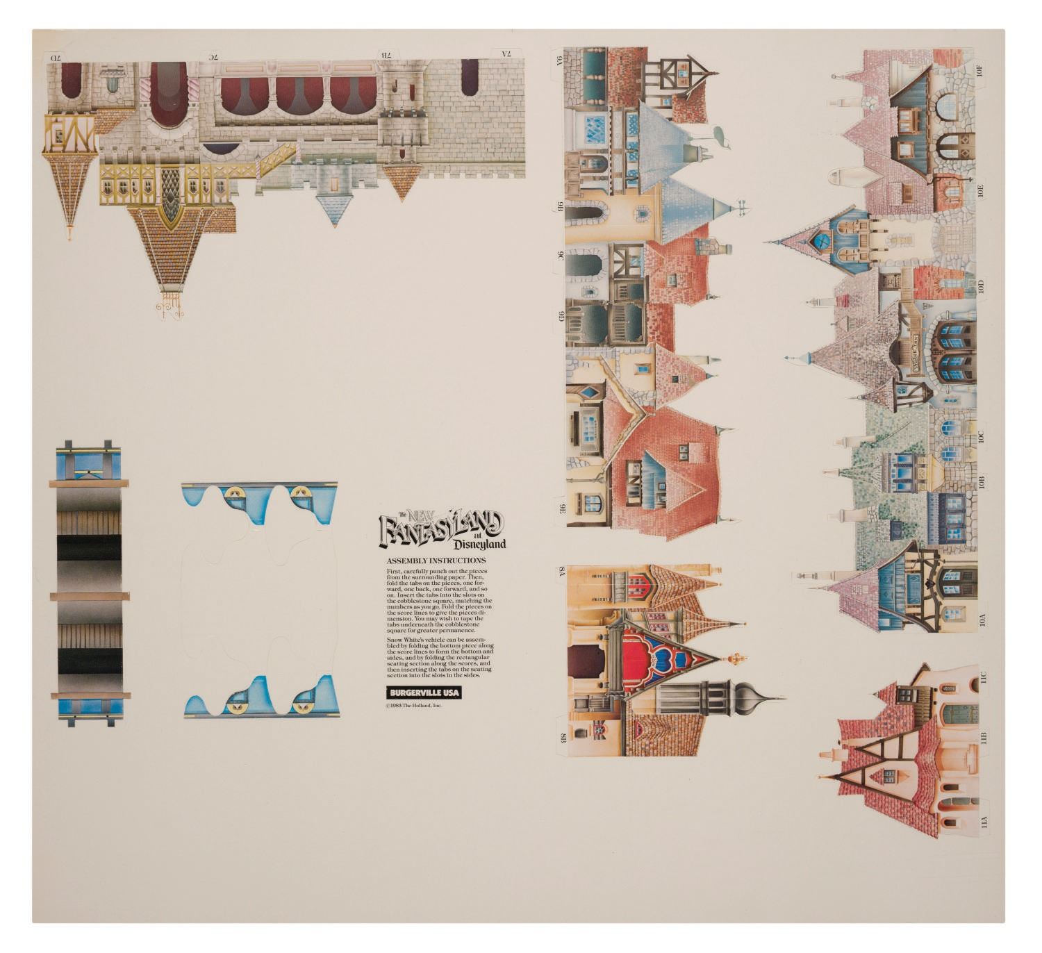 (Disneyland, 1983) A collection of New Fantasyland diorama cards manufactured by Burgerville, USA for Disneyland. A complete set is rare, as new pieces were released each week with purchase of The Fantasyland Meal at Disneyland. Among the lot are (4) oversized cards featuring unpunched New Fantasyland attraction facades and vehicles, King Arthur Carrousel, and Sleeping Beauty Castle. Measuring from 23"x14" to 21.25"x23", each piece is in very good unpunched condition, the King Arthur Carrousel sheet missing only an unimportant part of the page edge.