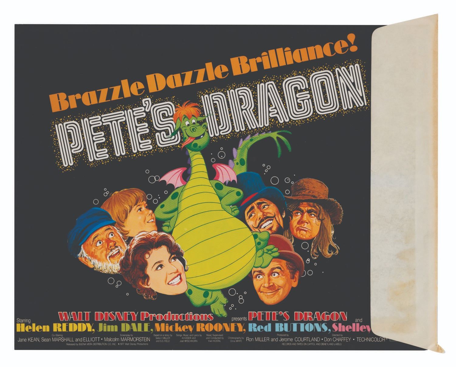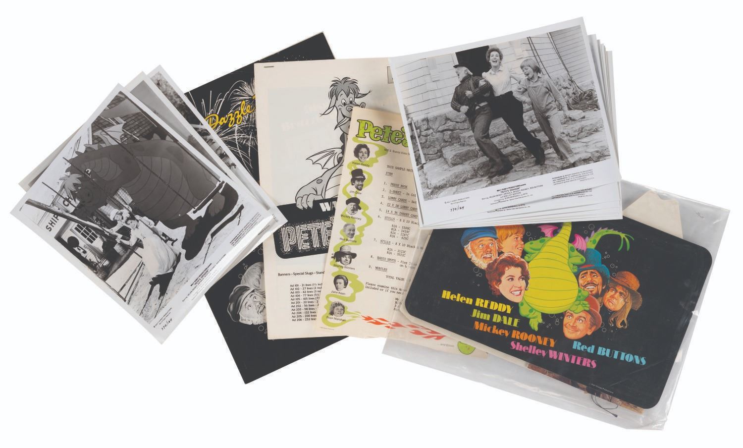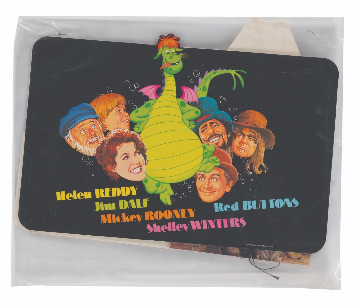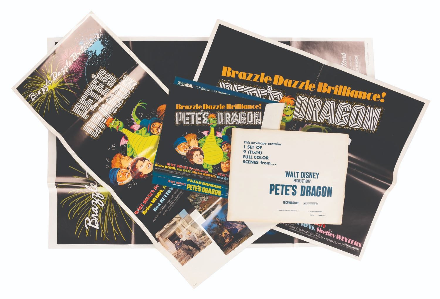 (Disney, 1977) An unused set of promotional materials for the original theatrical release of “Pete’s Dragon” in 1977. Included in the set are the 27” x 41” one-sheet, 28” x 22” half-sheet, and 14” x 36” insert posters; seven 8” x 10” publicity photos, nine 11” x 14” lobby cards, an ad pad of newspaper ads, a 30 page guide to the national promotions and publicity items available for the film, and a small unopened cardboard mobile featuring photos and ad art. The set is overall in very good to fine condition, with the posters exhibiting original folds, some wear from age, and creases to the cover of the promotion guide. The title lobby card is in poor condition, with the flap from the envelope adhered to one edge.