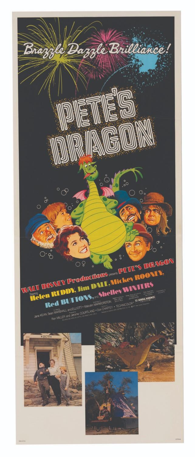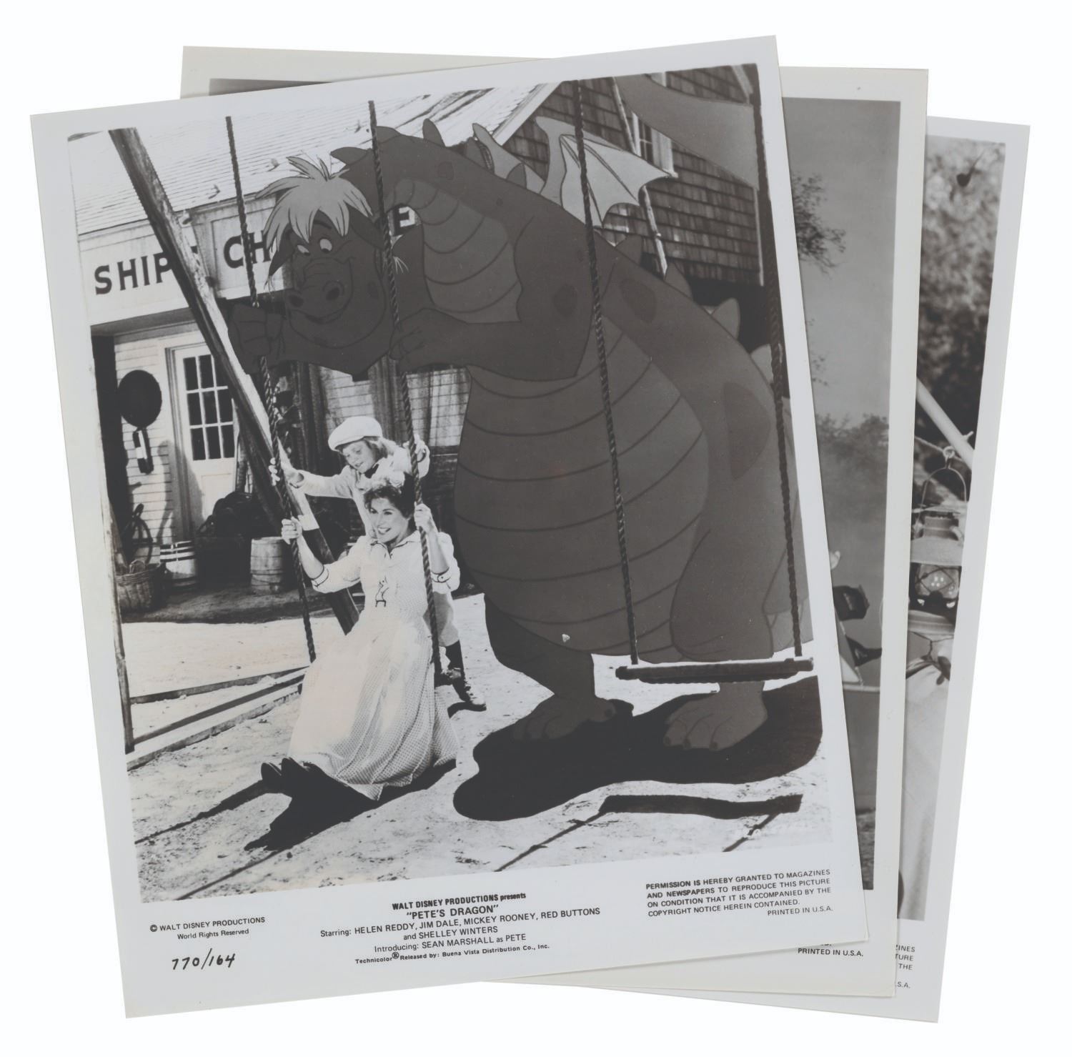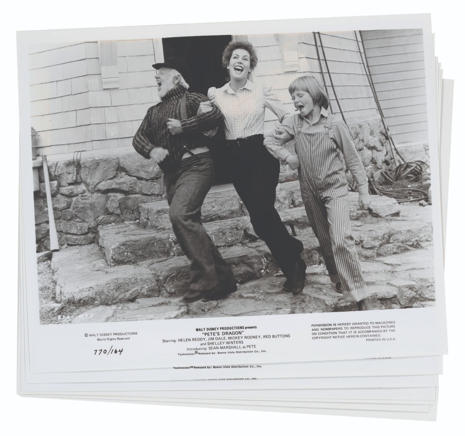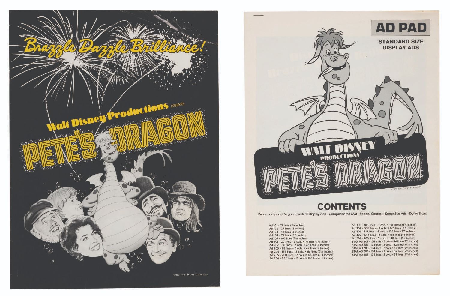 (Disney, 1977) An unused set of promotional materials for the original theatrical release of “Pete’s Dragon” in 1977. Included in the set are the 27” x 41” one-sheet, 28” x 22” half-sheet, and 14” x 36” insert posters; seven 8” x 10” publicity photos, nine 11” x 14” lobby cards, an ad pad of newspaper ads, a 30 page guide to the national promotions and publicity items available for the film, and a small unopened cardboard mobile featuring photos and ad art. The set is overall in very good to fine condition, with the posters exhibiting original folds, some wear from age, and creases to the cover of the promotion guide. The title lobby card is in poor condition, with the flap from the envelope adhered to one edge.