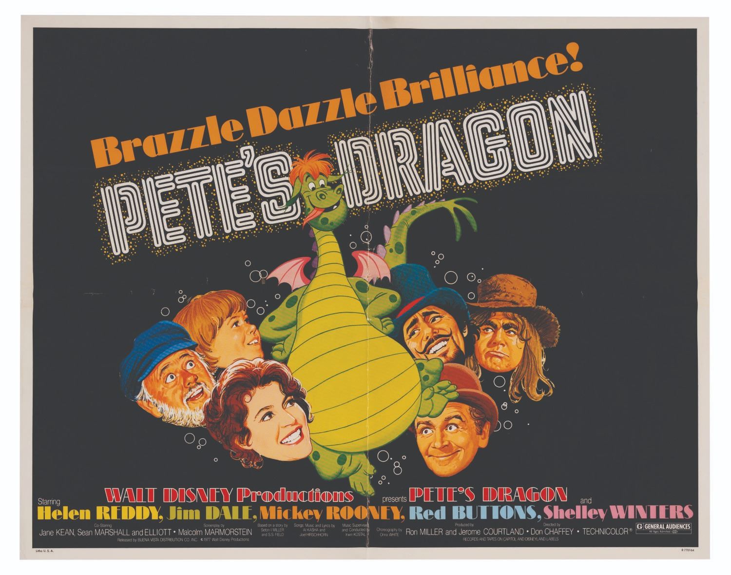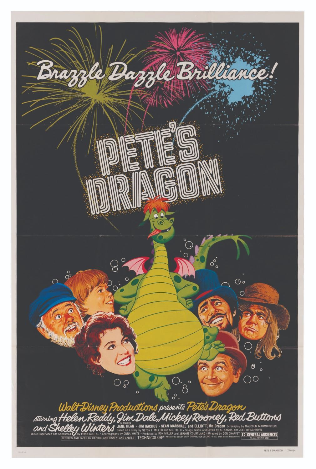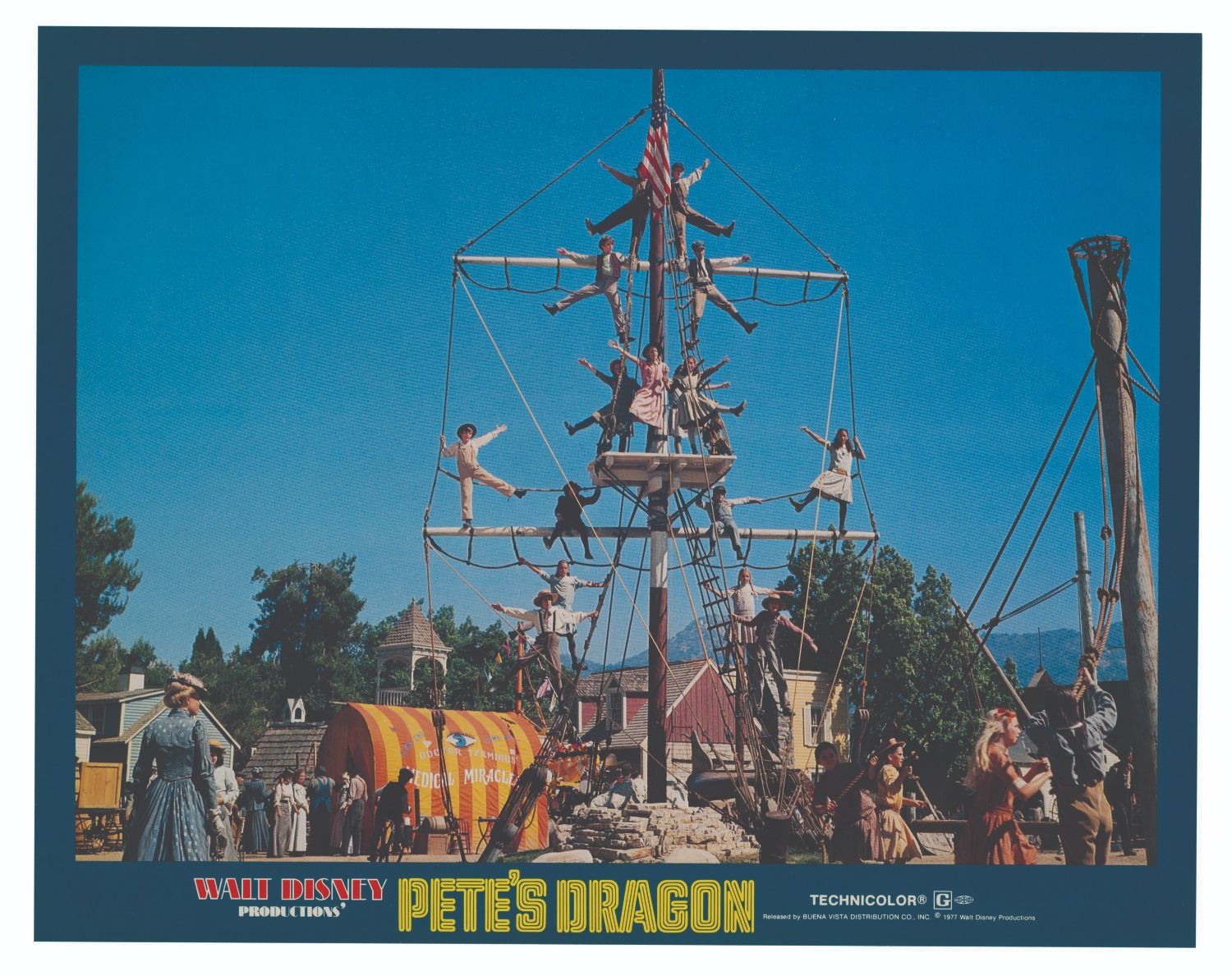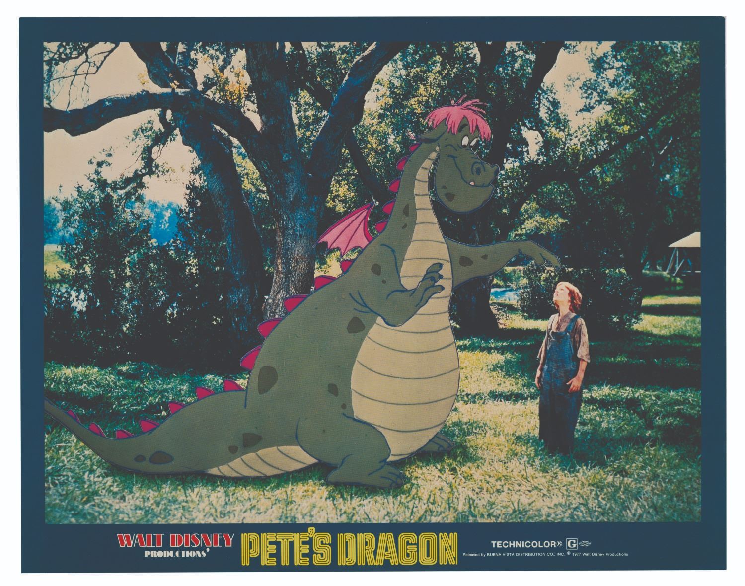 (Disney, 1977) An unused set of promotional materials for the original theatrical release of “Pete’s Dragon” in 1977. Included in the set are the 27” x 41” one-sheet, 28” x 22” half-sheet, and 14” x 36” insert posters; seven 8” x 10” publicity photos, nine 11” x 14” lobby cards, an ad pad of newspaper ads, a 30 page guide to the national promotions and publicity items available for the film, and a small unopened cardboard mobile featuring photos and ad art. The set is overall in very good to fine condition, with the posters exhibiting original folds, some wear from age, and creases to the cover of the promotion guide. The title lobby card is in poor condition, with the flap from the envelope adhered to one edge.