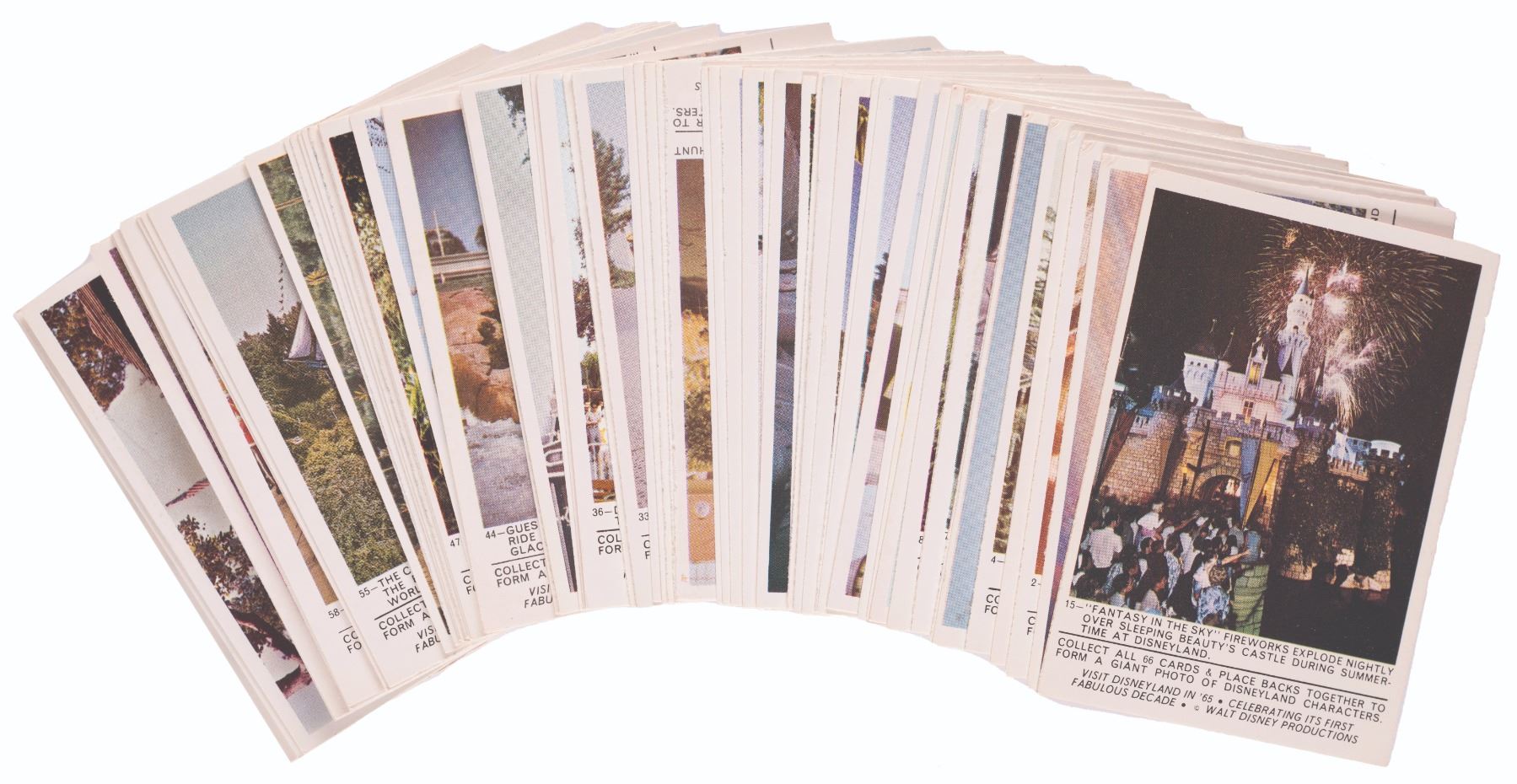 (Disneyland/Donruss, 1965) A complete set of (66) Disneyland Trading Cards, produced in celebration of the Park's Tencennial. The set includes unique photos of attractions and character costumes at the time, including the "Haunted House" which it (incorrectly) states will be opening in 1967. Measuring 2"x3" each, the (66) cards in the set are in fine condition, with no folds or creases, and crisp edges and corners overall.