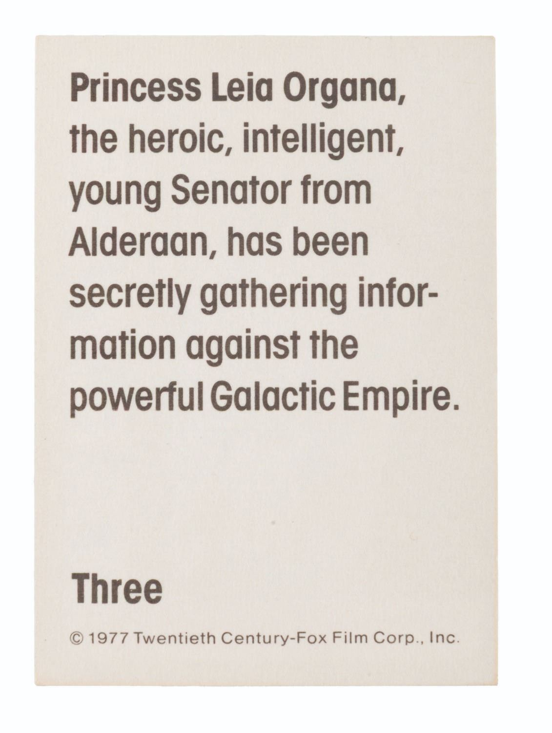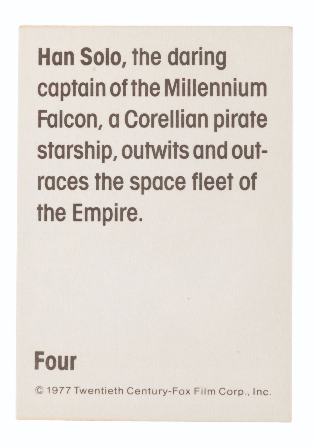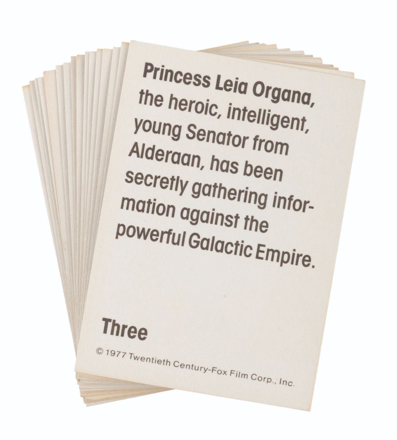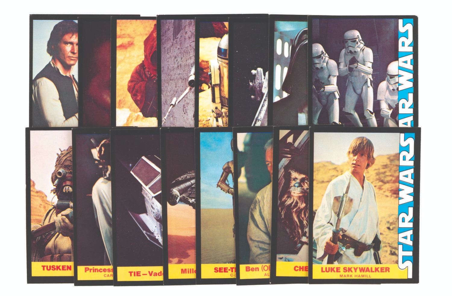 (Wonder Bread, 1977) A complete set of 16 “Star Wars” trading cards given away in specially marked loaves of Wonder Bread. While each loaf contained only one card, the entire set was available via a mail-in offer. The 2.5” x 3.5” cards display in good to fine condition with light corner wear and light discoloration around the edges on the reverse from age.