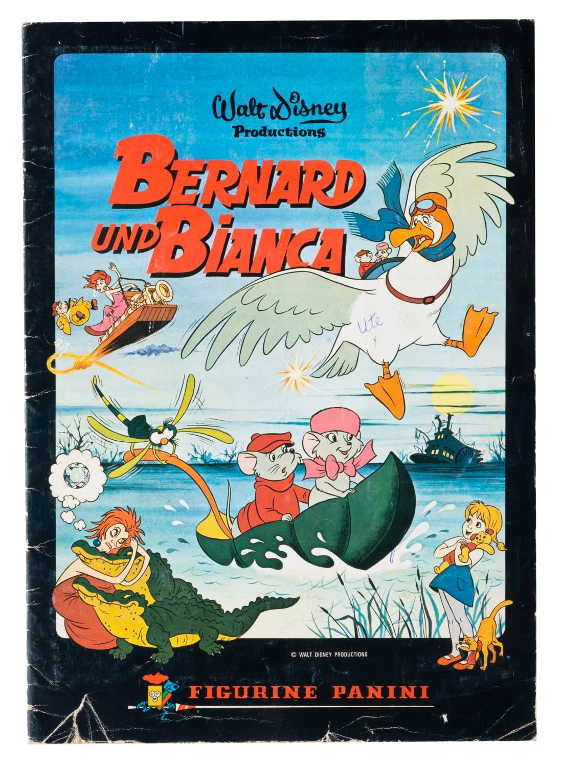 (Panini, 1977) A German-language Panini sticker book for “The Rescuers” filled with all 360 stickers in the set. Measuring 9.5” x 13.5”, the book is in fair condition with wear, creases, and a 1” tear to the cover, and the stickers inside in very good condition.