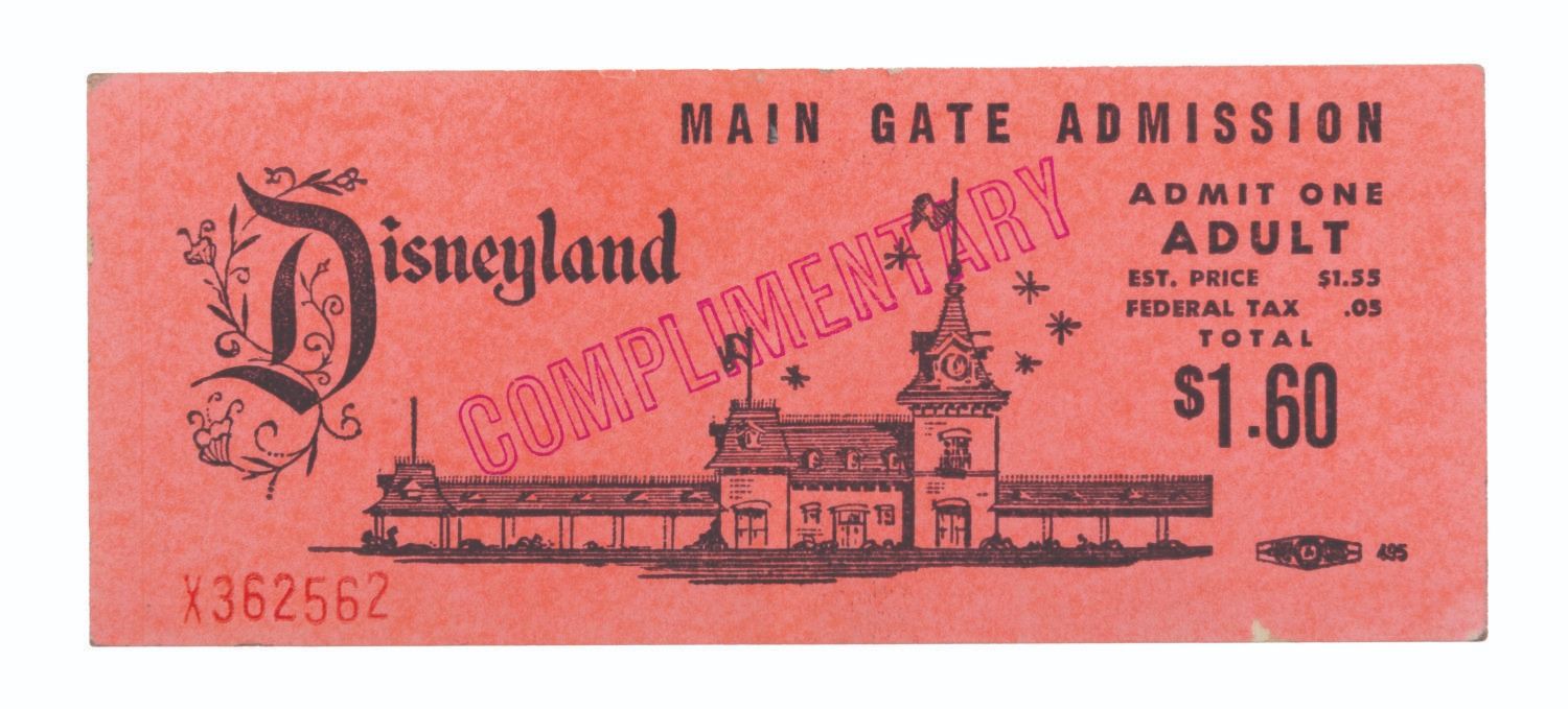 (Disneyland, 1960s) A Disneyland Main Gate adult admission ticket from the collection of Disney Legend Milt Albright, who founded the Magic Kingdom Club program. The coral pink ticket is stamped "Complimentary" in purple ink, bears a face value of $1.60, and is numbered "X362562." This unused ticket remains valid for Park admission. Measuring 2" x 5", the ticket is in very good condition with some minor edge and surface wear.
