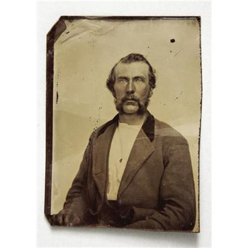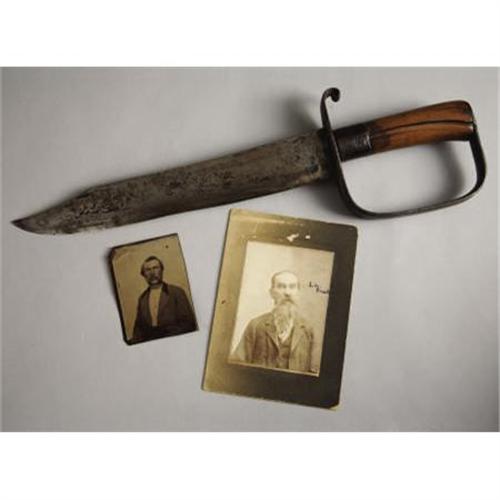 <B><BR>A Confederate Bowie 'D-Guard' Fighting Knife Captured By Union Army Private Samuel AM. Dowden.</B></I><BR> Samuel M. Dowden fought with the Pennsylvania infantry during the Civil War, taking home this souvenir - an excellent example of a Confederate 'D-Guard' fighting knife. The weapon descended through the Dowden family with the story being that the young private took it from a dead Rebel soldier.<BR>Measuring 15 1/2 inches overall with a 10 3/4 inch blade, this attractive D-Guard has a clip point of forged steel and a standard 'broomhandle' grip. Two photographs including a tintype and a later portrait of Dowden accompany the knife, all three items being in good condition.<BR>Condition: The blade of the knife has moderate surface pitting with a nice, even dark gray patina.<BR><BR><b>Shipping:</b> Requires 3rd Party Shipping (<a target="_blank" href="http://www.heritageauctions.com/common/shipping.php">view shipping information</a>)