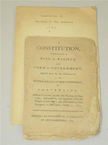 A Constitution Containing a Bill of Rights, and Form of Government, Agreed Upon By the Delegates of the People of the State of New-Hampshire, in Convention..... Printed at Portsmouth, in the State of New-Hampshire, 1783. First Edition. 8vo - over 7¾" - 9¾" tall. Soft Cover. Good condition. THIS IS NOT AN EX-LIBRARY BOOK. Title continues - held at Concord, on the first Tuesday of June 1783; submitted to, and approved of by the People of said State; and established by their Delegates in Convention, October 31, 1783. 47pp, single thread stitched, pages age darkened, occasional foxing, protected in a mylar cover.