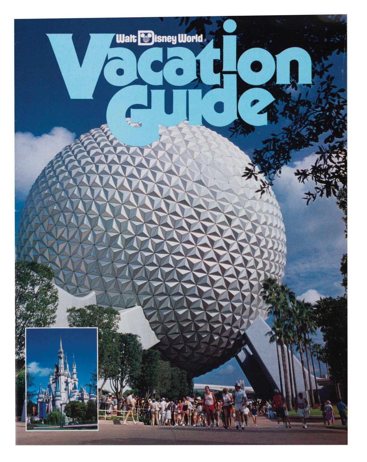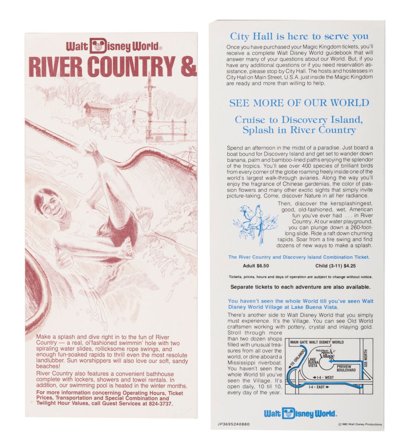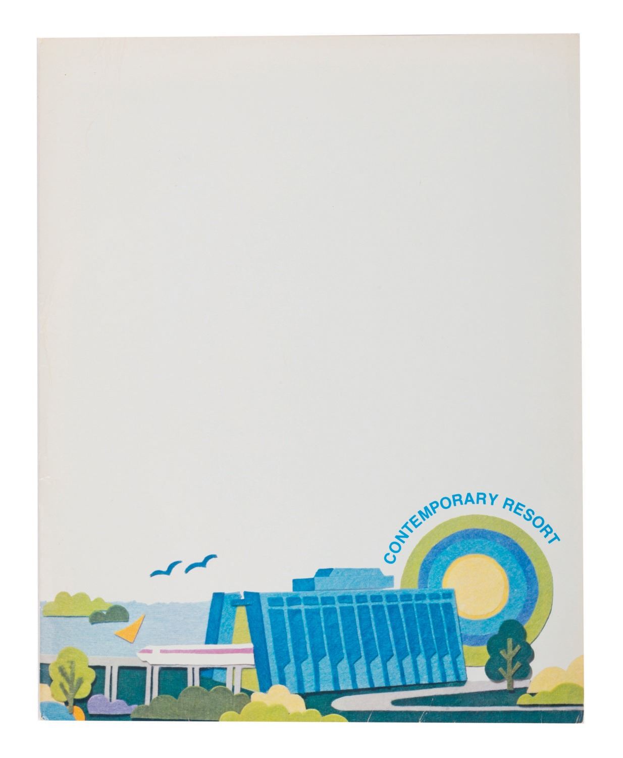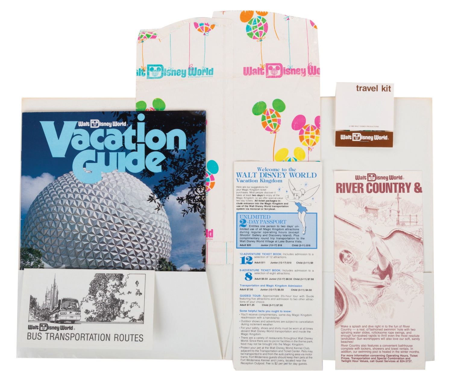 (Walt Disney World, 1984) A collection of vintage media from Walt Disney World Vacation Kingdom. Among the lot are a 19-page 1984 edition of Walt Disney World Vacation Guide, bills for Walt Disney World Bus Transportation Routes, admissions, and Discovery Island and River Country, a complimentary sewing Travel Kit, and a paper souvenir bag within a colorful Contemporary Resort Folder. The items measure various sizes and come within the 12"x9.5" folder, each piece is in good overall condition and exhibits creases and wear.