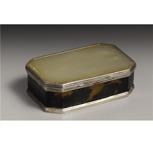<B>A Continental Mother-of-Pearl, Tortoiseshell and Silver Snuff Box</B></I><BR><BR>Unknown maker, Continental<BR>Nineteenth Century<BR>Mother-of-pearl, tortoiseshell and silver<BR>Unmarked<BR>2.12 in. long<BR><BR>Of rectangular form with canted corners, the mother-of-pearl engraved floral decoration surrounding an oval reserve, plain bottom; tortoiseshell sides. Within a silver caged frame.<BR>