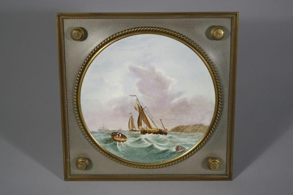 A Continental Painted Porcelain Plate Mounted and Framed in a Metal and Brass Stand.