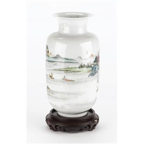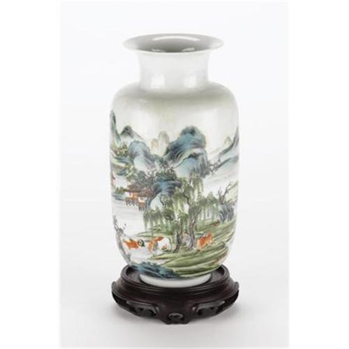 <B>A Continental Porcelain Vase<BR></B></I>The porcelain vase in five colors on white ground, figures and landscapes with carved wood vase<BR>10-1/2 inches high (24.1 cm)<BR> <BR><BR><b>Shipping:</b> Requires 3rd Party Shipping (<a target="_blank" href="http://www.heritageauctions.com/common/shipping.php">view shipping information</a>)