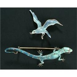 A Continental brooch in the form of a lizard in an alert pose and enamelled in varying shades of green and blue and with a cabochon eye, probably German stamped verso ' 935 Sterling', approx. 9.5cm long overall, and a brooch in the form of a seagull in flight, enamelled in shades of pale blue and violet, stamped 'sterling silver'