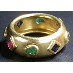 A Continental multi-gem band ring, rub-over set with alternate square and pear-shaped sapphires, rubies and emeralds, indistinctly stamped '750'