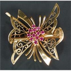 A Continental ruby cluster bow brooch, centred with a small round mixed-cut ruby cluster within a surround of ribbons and pierced folded bows, the later pin London 2002